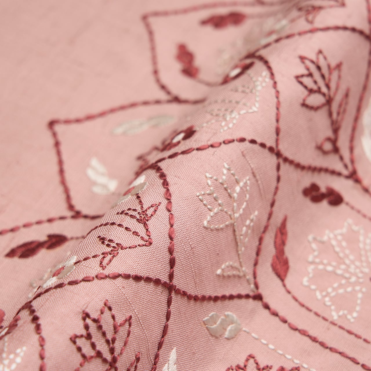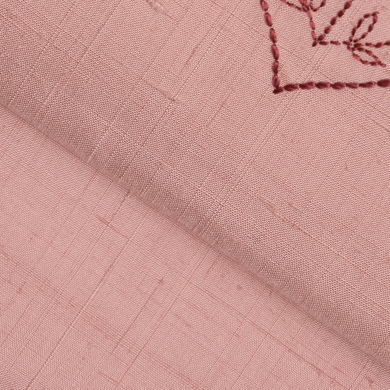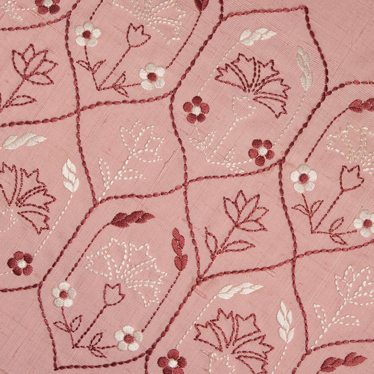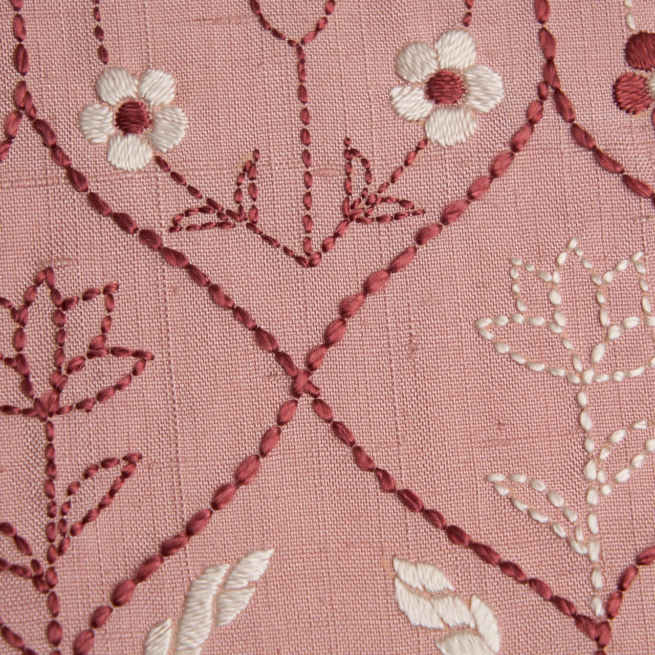 緯糸に節のある座繰りのふっくらとした紬地が淡いピンク・紅梅色に染められ、お太鼓には葡萄色やそれよりやや薄い蘇芳色、そして生成り色などの糸で、立涌のような囲みがステッチでつくられた中にいろいろな形のお花が手刺繍された、とてもふんわりとした印象の素敵な九寸名古屋帯です。