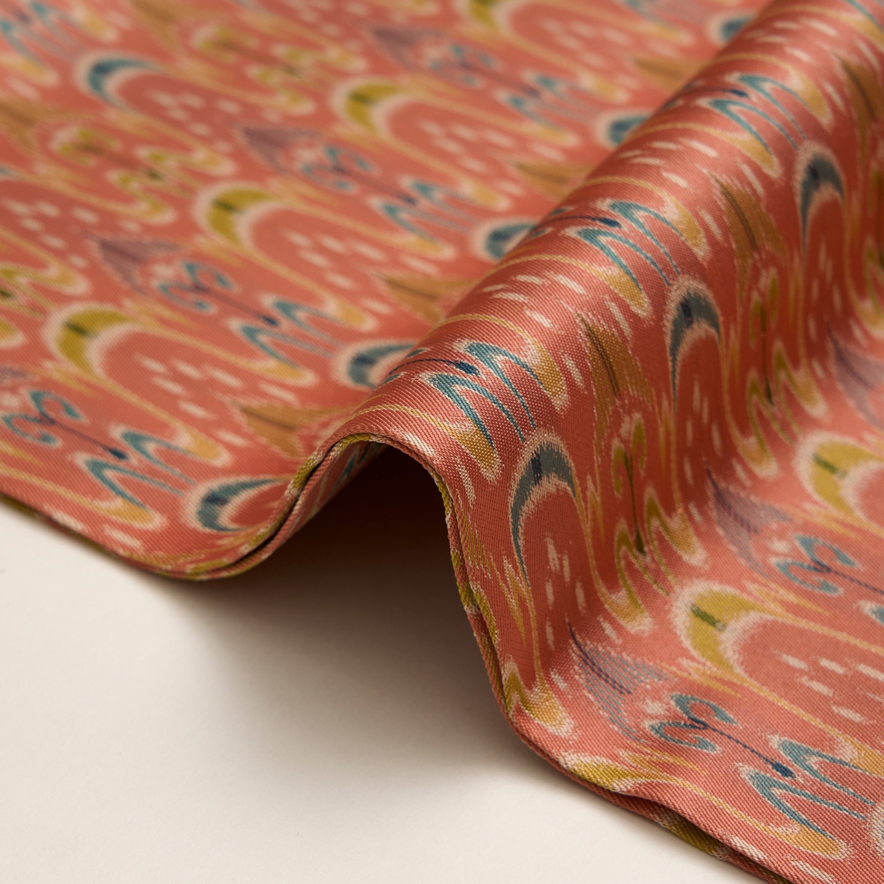 オレンジ味のあるピンク系の色・銀朱色の地に、舛花色、柳茶色の緑、香色などの糸で、名物裂のひとつである太子間道の文様が経錦で織り出された、格調高さの感じられる素敵な九寸の開名古屋帯です。