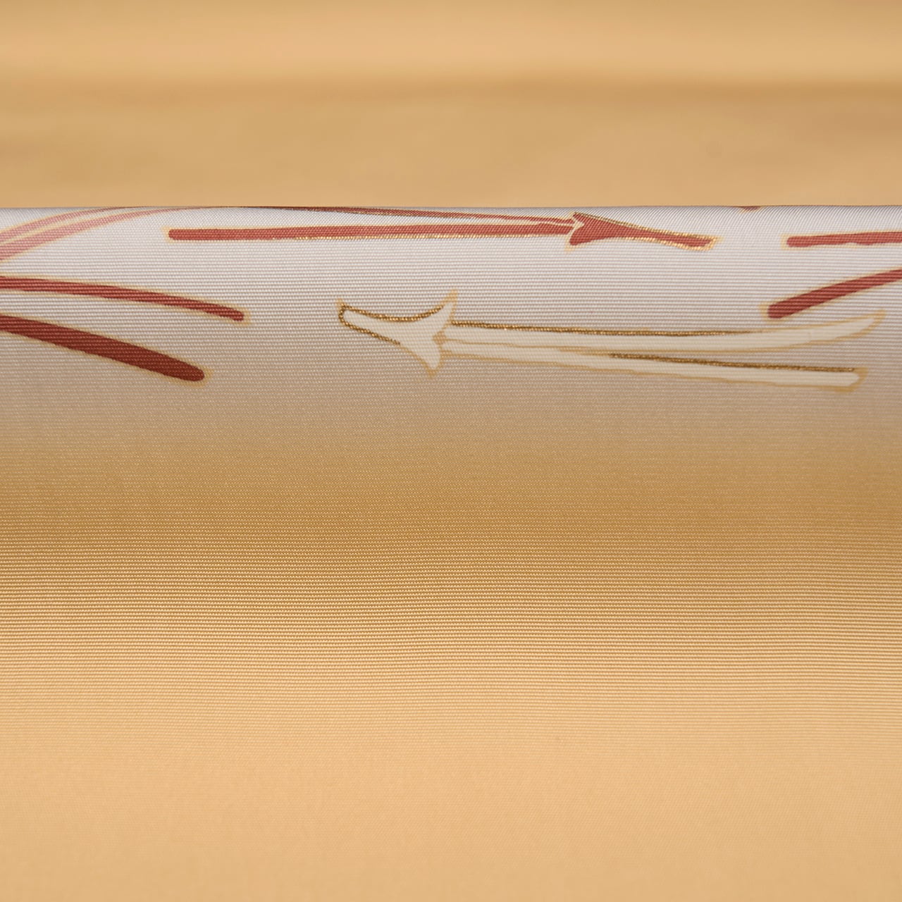 深さのあるこっくりとした黄色・飴色のしっかりとした塩瀬の生地に、お太鼓には牡丹鼠色の段が暈し染めで染め分けられ、そこには松の葉が風で吹き寄せられたように集まった様子が手描きの友禅で描かれた、情緒のある素敵な九寸名古屋帯です。