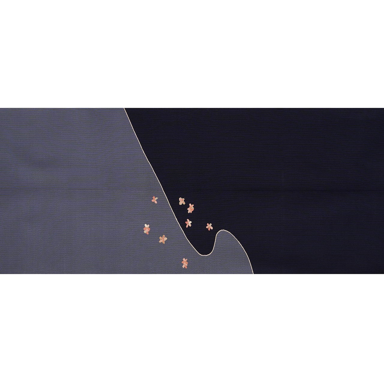 濃い藍・鉄紺色の地に、お太鼓は斜めの波線で区切られて、もう片方は薄鼠色に織り分けられ、桃色から虹色の濃淡の小さなお花が可愛らしく散らされた、とてもすっきりとした雰囲気の爪掻き綴れ織の二部式の八寸名古屋帯です。