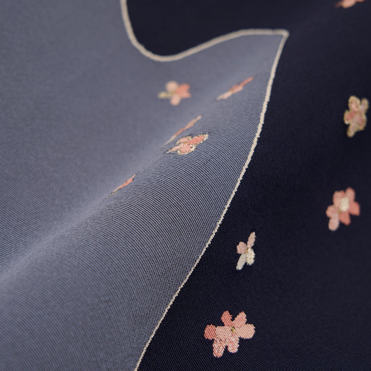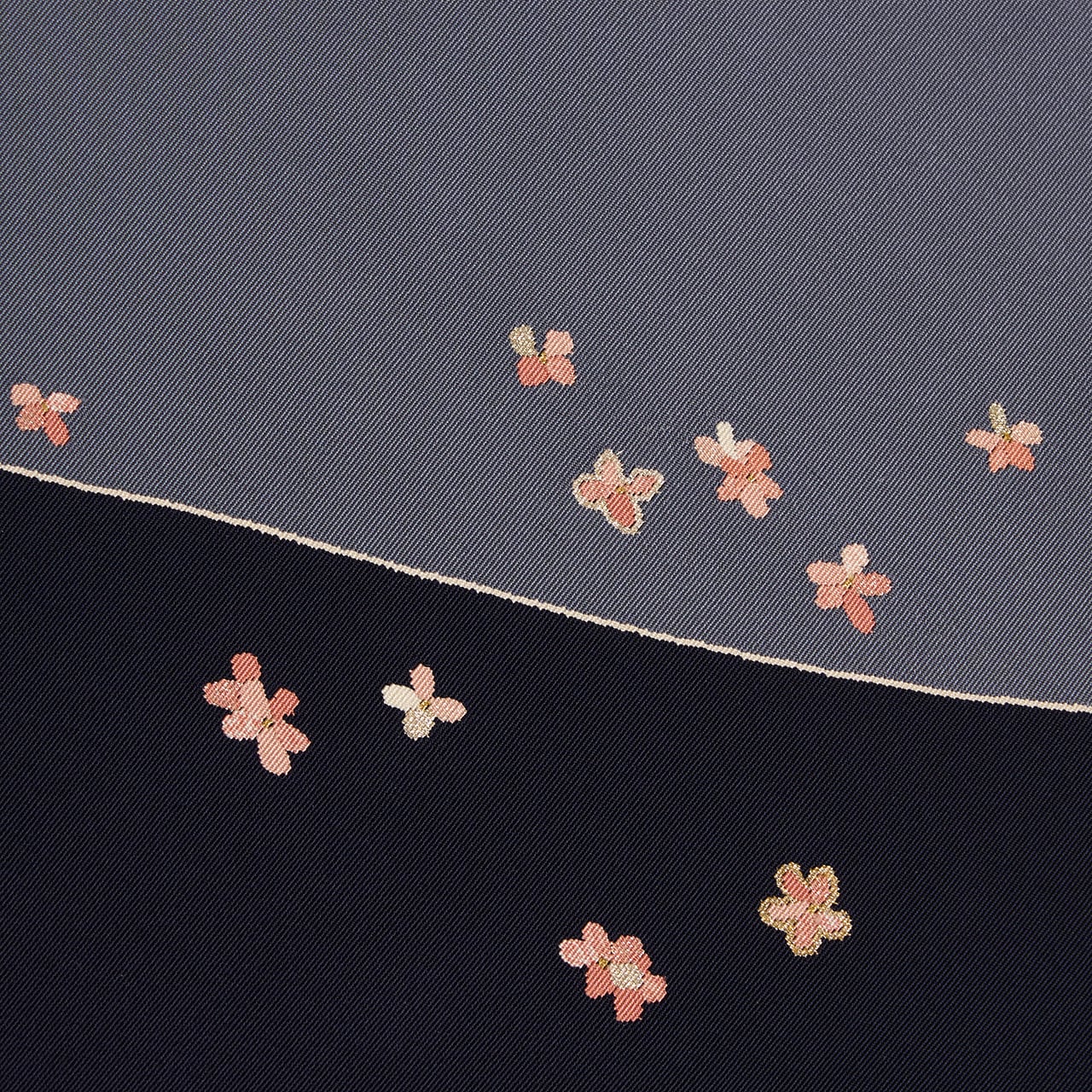 2色に織り分けられた色の境目の細い線や、濃淡の暈しのある小さな花びら、それを縁取る銀糸の細かな線など、シンプルに見える模様にもこだわりが見られ、高い技術で制作されたことが伺えます。