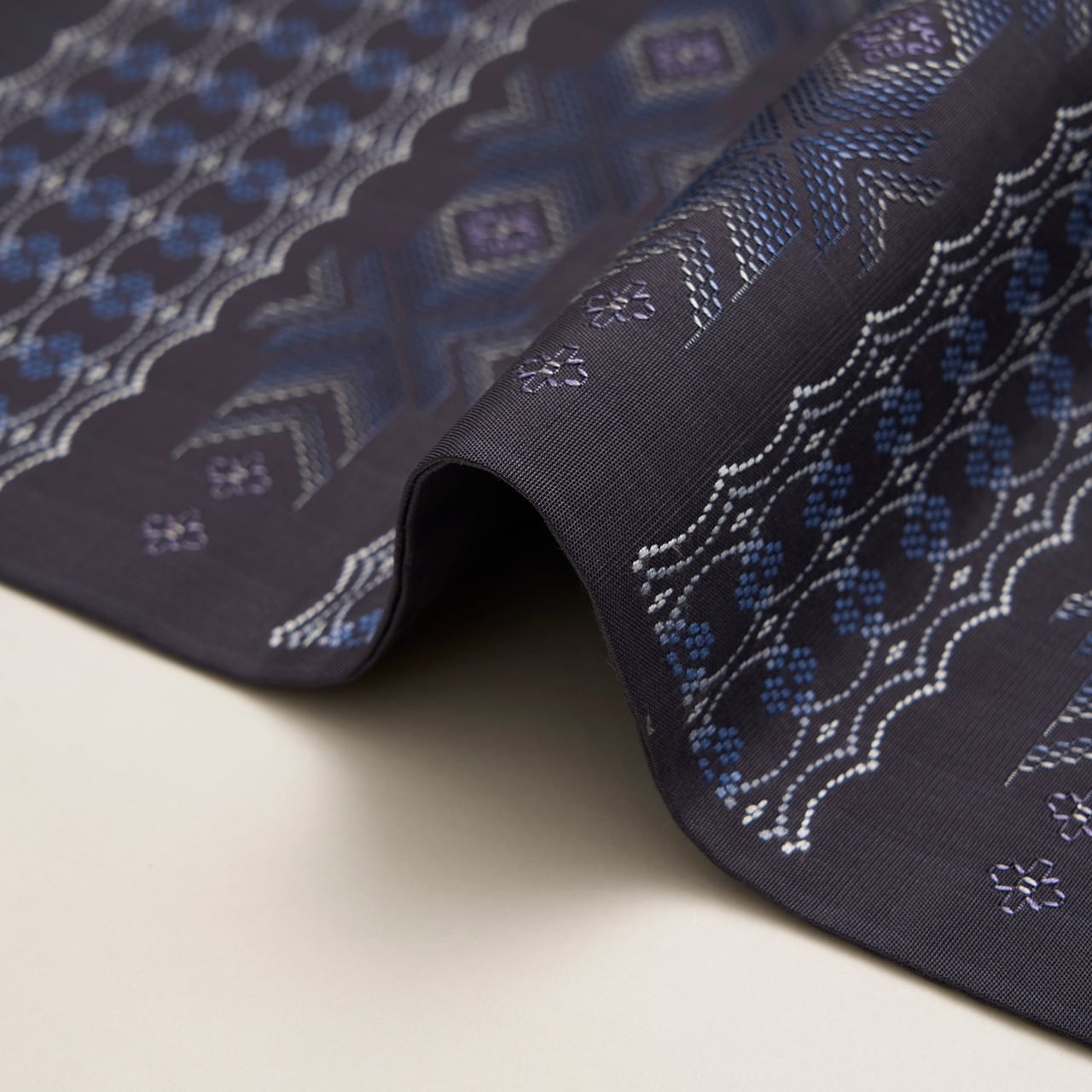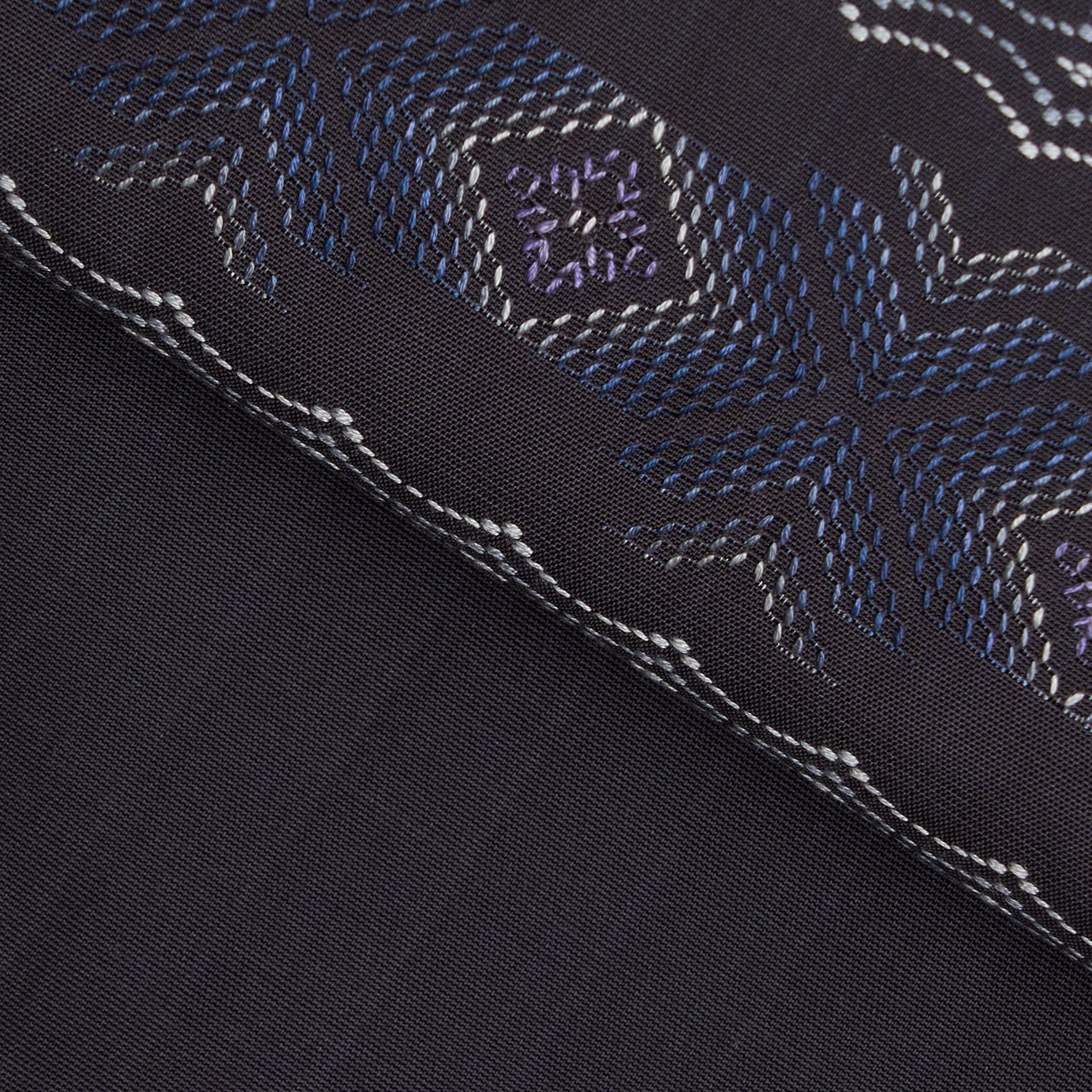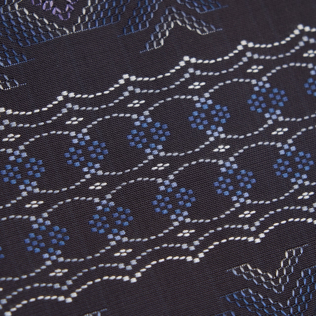 琉球藍で染められた独特の藍色の地に、スカラップのようにリズミカルに並んだ列と、矢印のような形と四角の形をした列とが交互に並んで、紺鼠色から生成り色までの綺麗なグラデーションに織り出され、鳩羽色の糸で部分的にアクセントが入れられています。