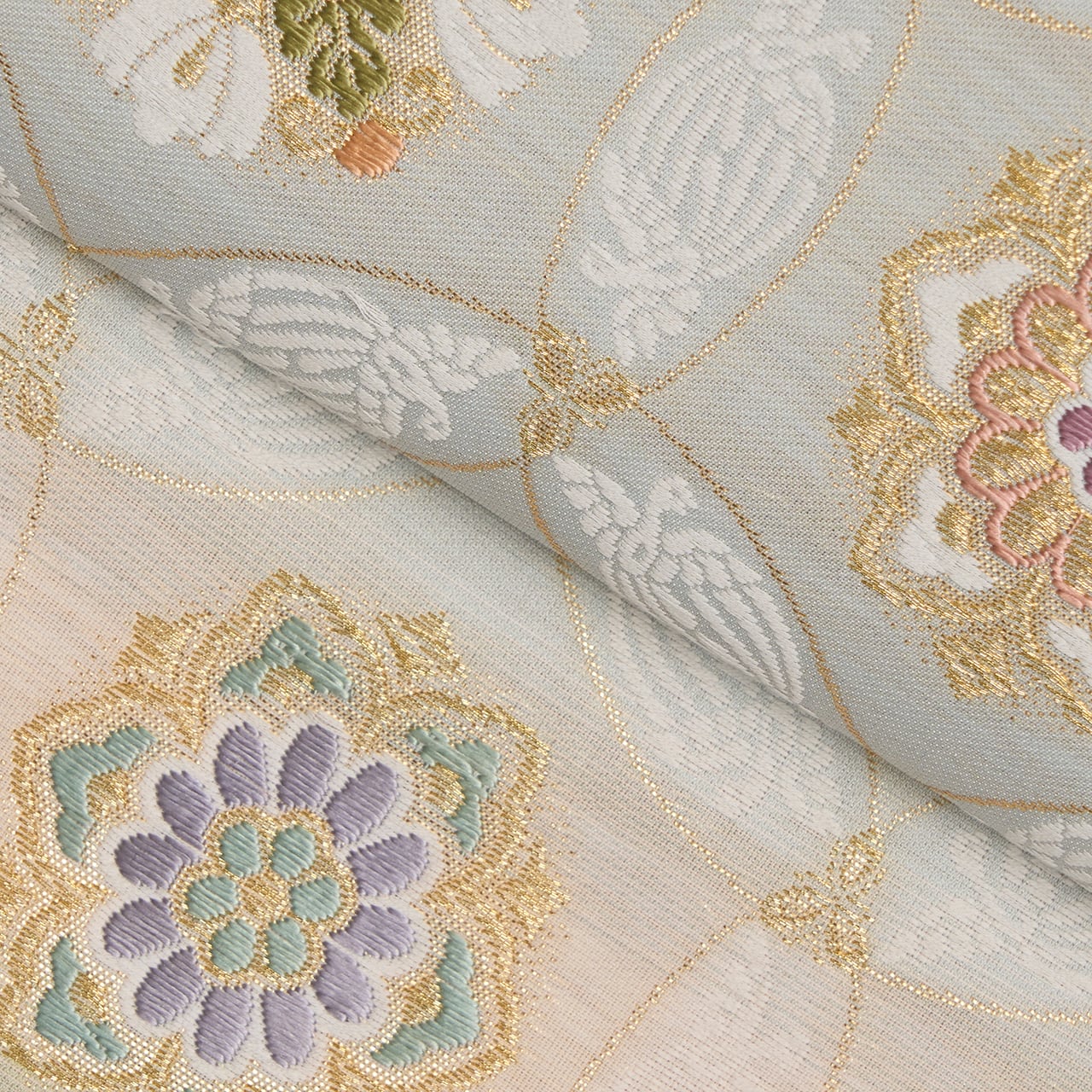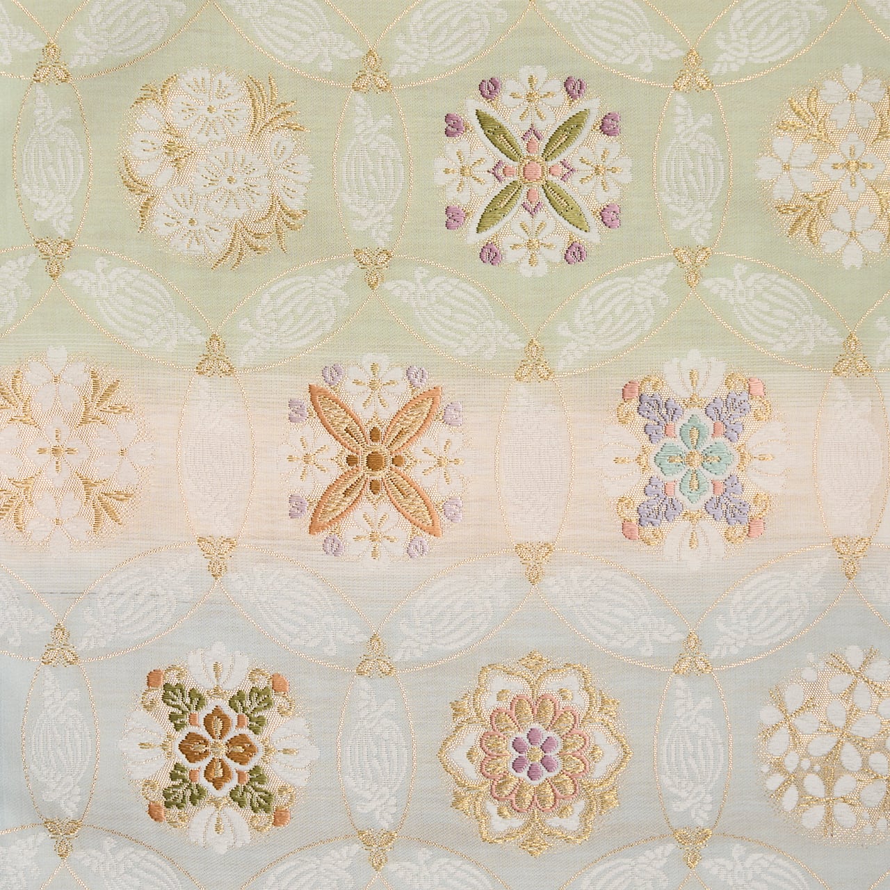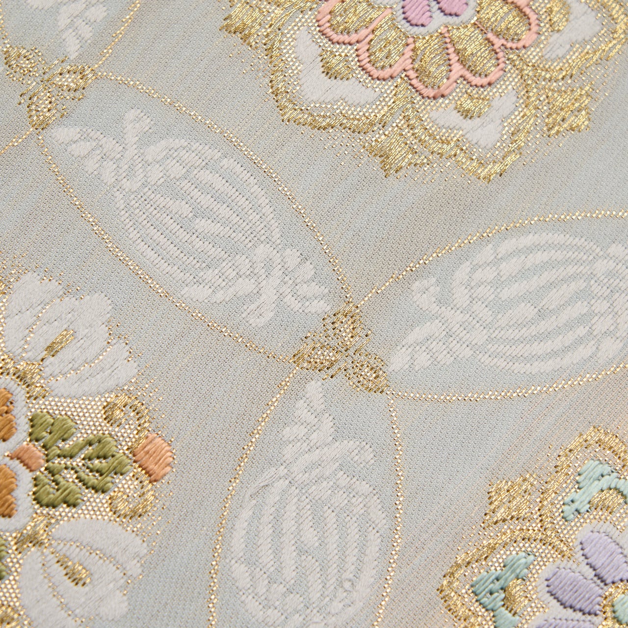 象牙色の細い糸をたくさん使って織られたシャリっとした質感の地に、裏葉柳色の薄緑と青白橡色のグレーの段が取られ、それに大きめの丸が重なって七宝繋ぎの文様が織り出され、その丸が重なるところには尾長鳥が対になって織り込まれ、また七宝の中には色とりどりの糸と金糸を使って華やかでいろいろなデザインのお花の模様が織り込まれた、気品の感じられる素敵な袋帯です。