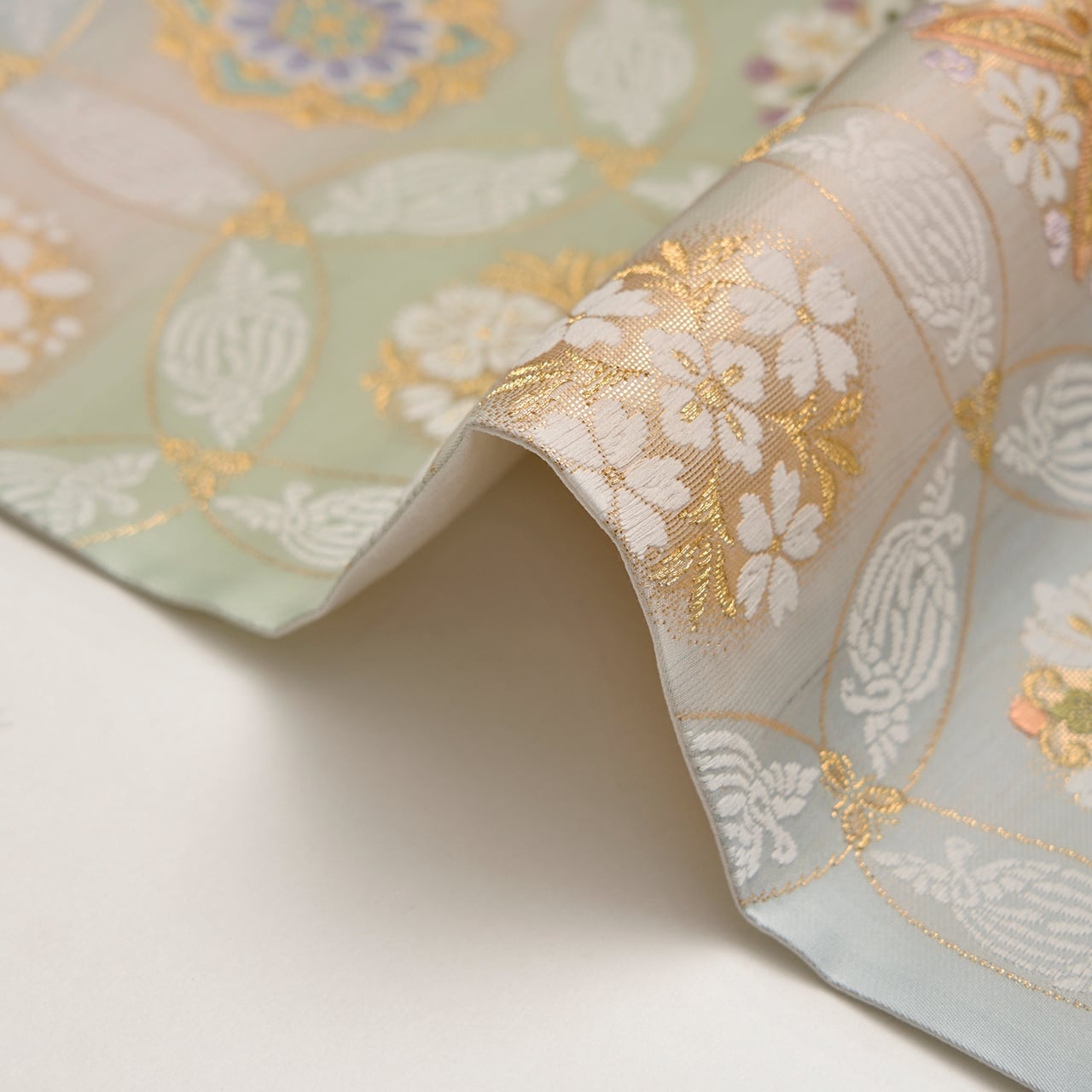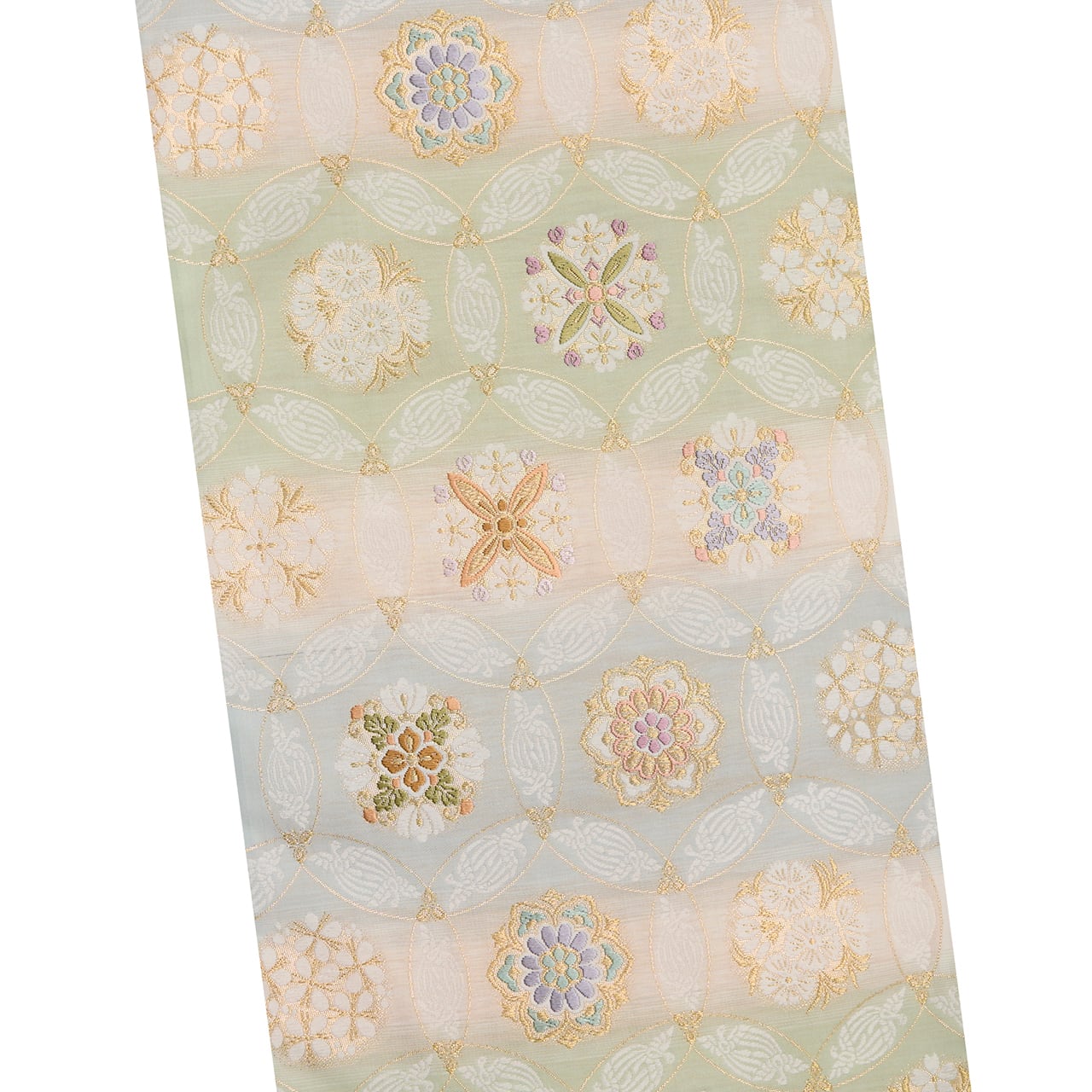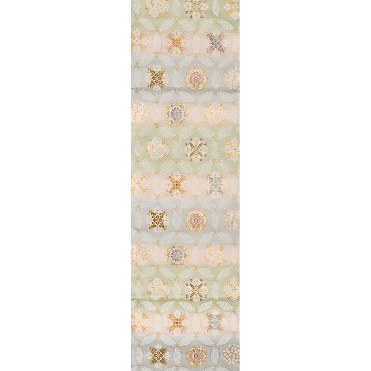 象牙色の細い糸をたくさん使って織られたシャリっとした質感の地に、裏葉柳色の薄緑と青白橡色のグレーの段が取られ、それに大きめの丸が重なって七宝繋ぎの文様が織り出され、その丸が重なるところには尾長鳥が対になって織り込まれ、また七宝の中には色とりどりの糸と金糸を使って華やかでいろいろなデザインのお花の模様が織り込まれた、気品の感じられる素敵な袋帯です。