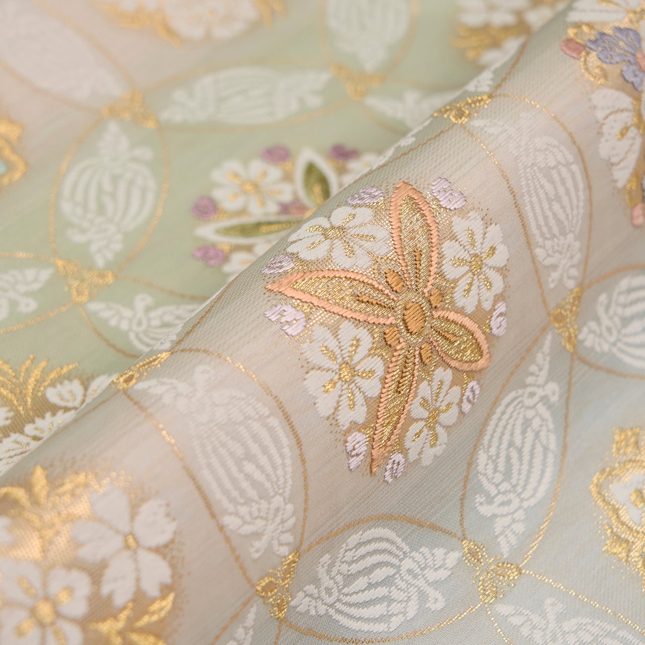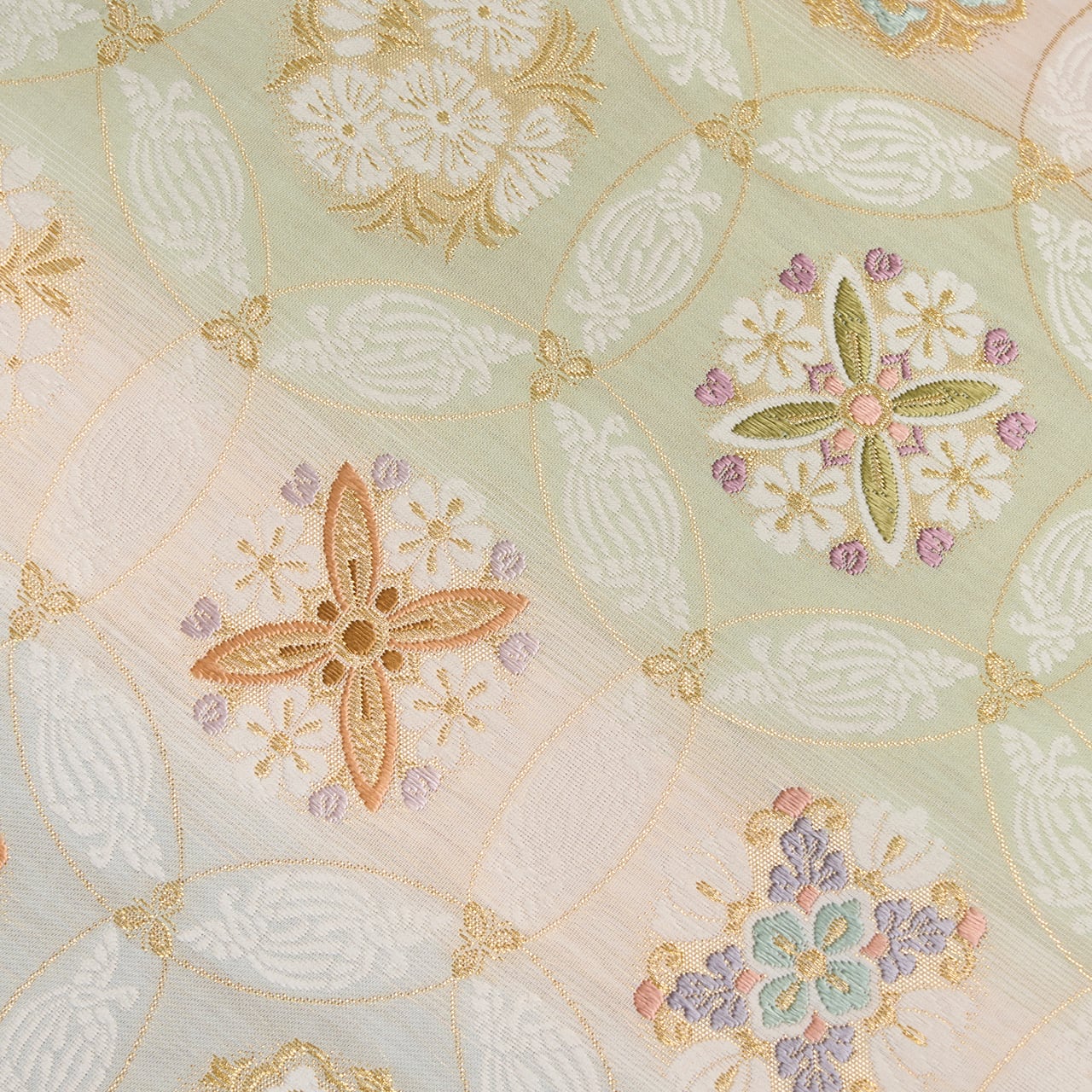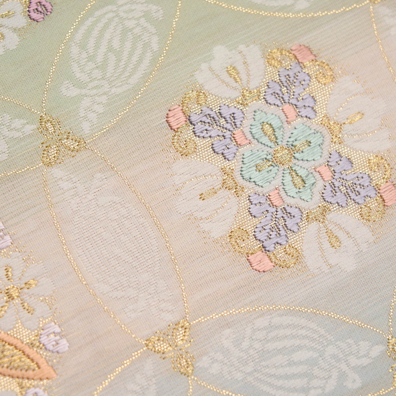 七宝繋ぎの中のお花は、ナデシコや桜、紫陽花などをディフォルメされたものや、華文の形にアレンジされたものがあり、色も宍色、浅紫色、松葉色、薄鼠色など豊富で、綺麗なパステルトーンでありながらも品の良いゴージャスさが感じられるものとなっています。