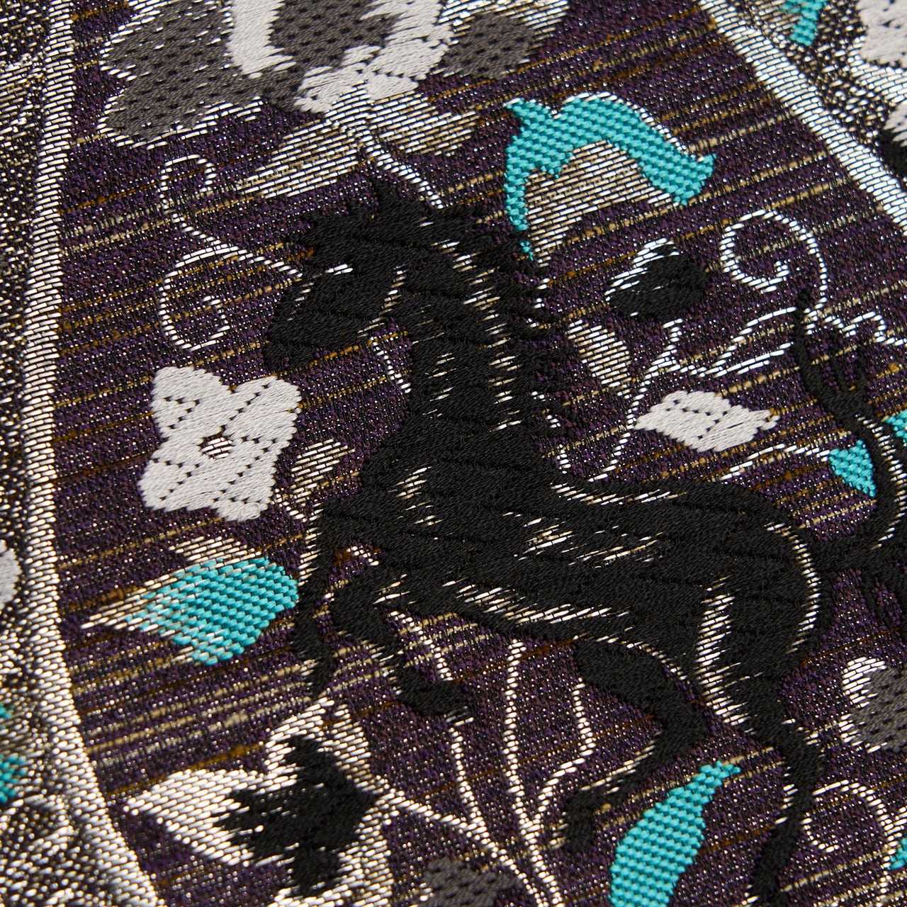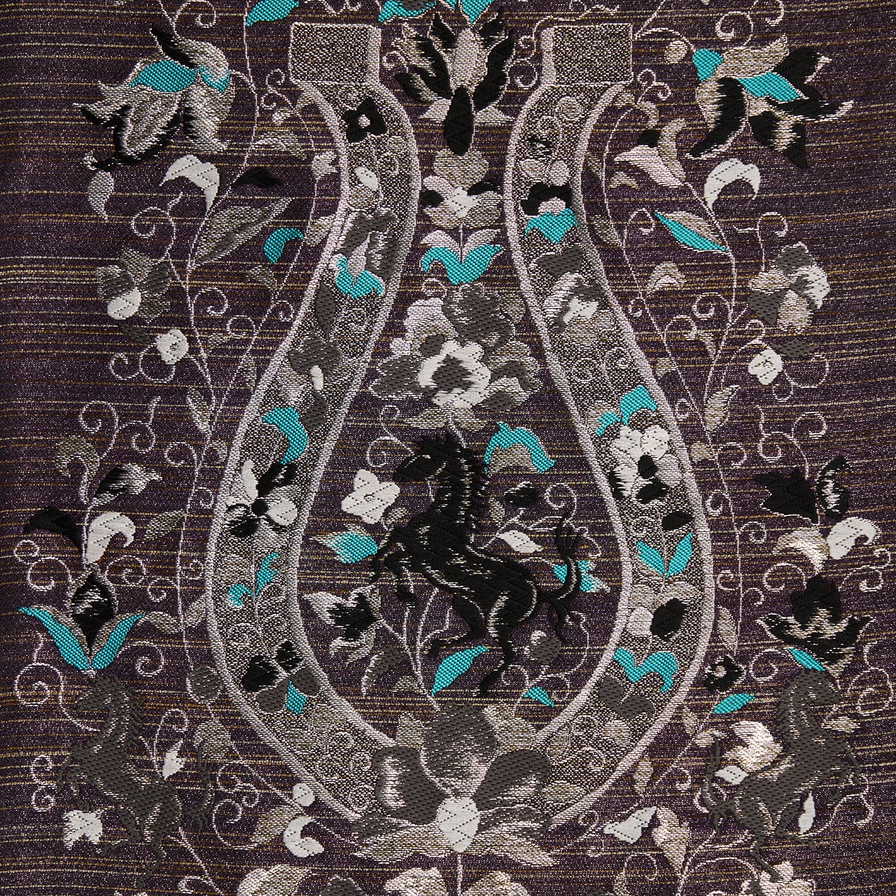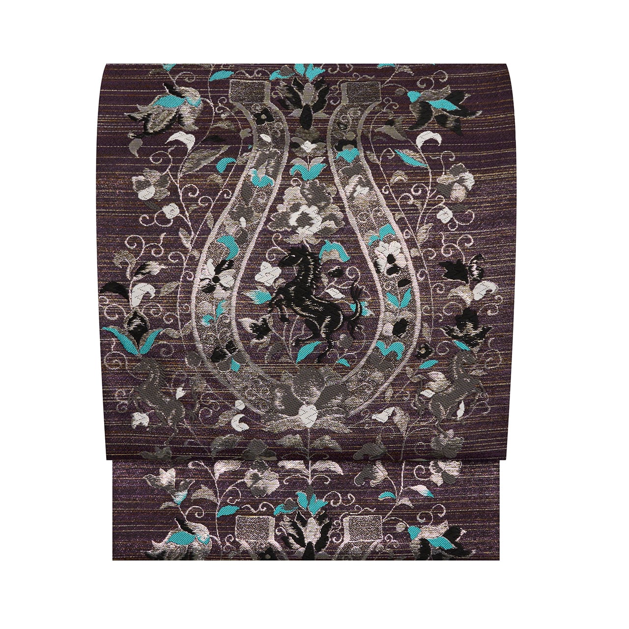 濃い紫・紅消鼠色のシャリっとした質感の生地に、薄茶色の横縞が織り込まれた地に、大きな馬蹄形が銀の糸で織り込まれ、そのまわりには同じく銀糸や胡粉色の糸、そして露草色の鮮やかなブルーなどの糸で、花唐草の模様が織り込まれ、馬蹄形の中には黒い馬が織り込まれた、とてもお洒落なデザインの袋帯です。