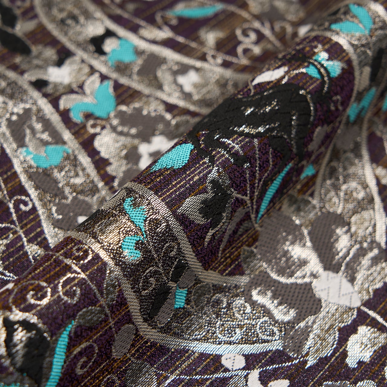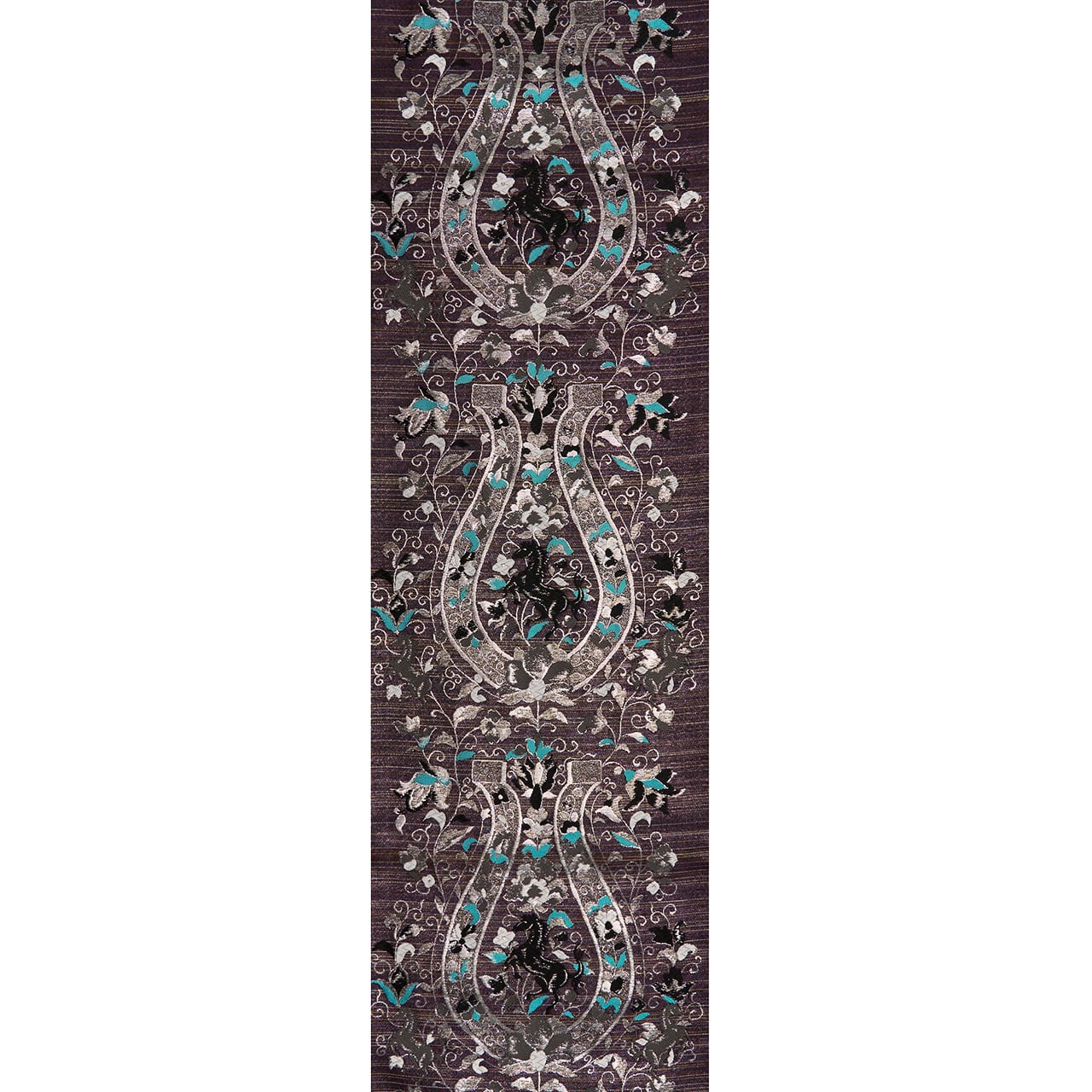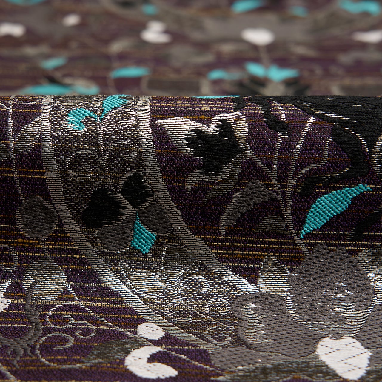 濃い紫・紅消鼠色のシャリっとした質感の生地に、薄茶色の横縞が織り込まれた地に、大きな馬蹄形が銀の糸で織り込まれ、そのまわりには同じく銀糸や胡粉色の糸、そして露草色の鮮やかなブルーなどの糸で、花唐草の模様が織り込まれ、馬蹄形の中には黒い馬が織り込まれた、とてもお洒落なデザインの袋帯です。