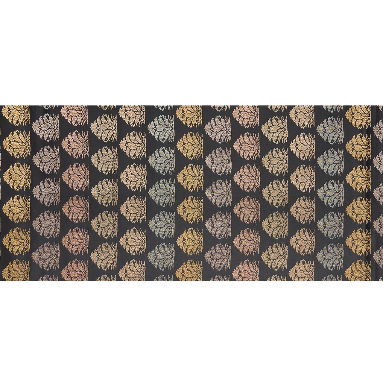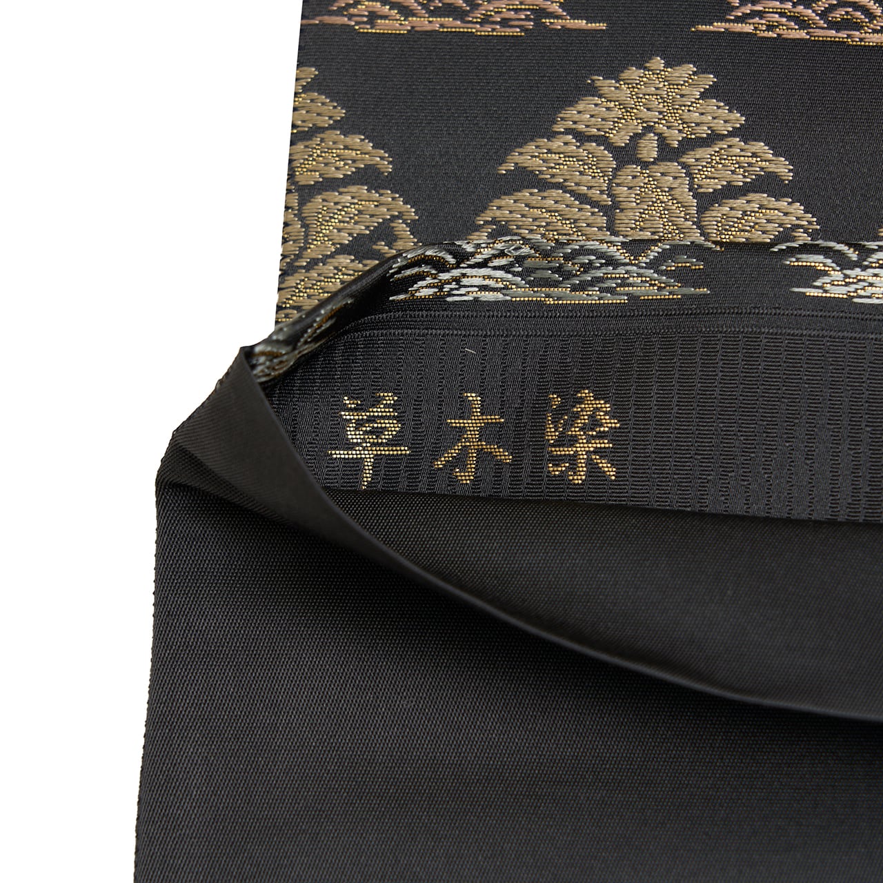 とても深く濃い緑味のあるグレー・百入茶色のしっとりとした質感の生地に、鳩羽鼠色の薄紫や薄柿色の淡いピンク、砥粉色の黄色、灰青色の淡いグレー味のあるブルーなどの草木染ならではのやさしい色合いの糸で、名物裂のひとつである鶏頭の文様が段変わりに錦織で織り出された、格調高さのある陰山織物さんの箔屋清兵衛ブランドの素敵な袋帯です。