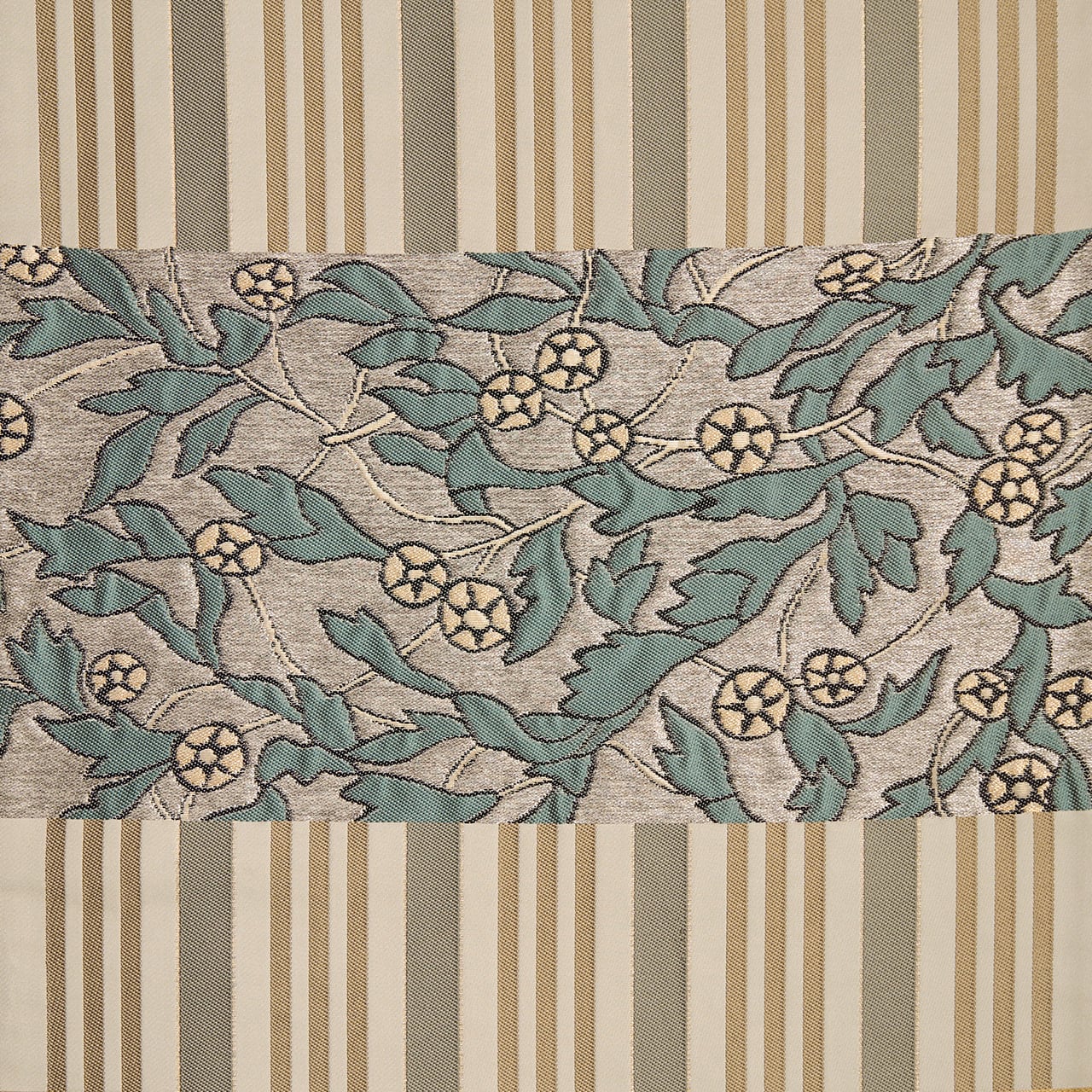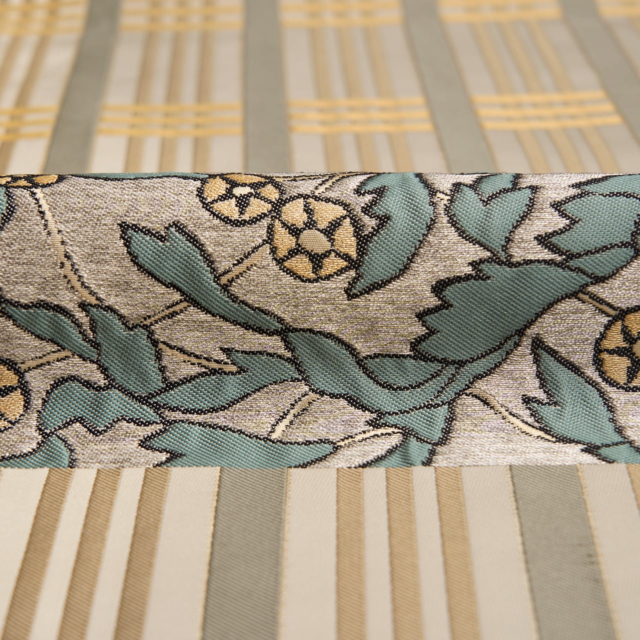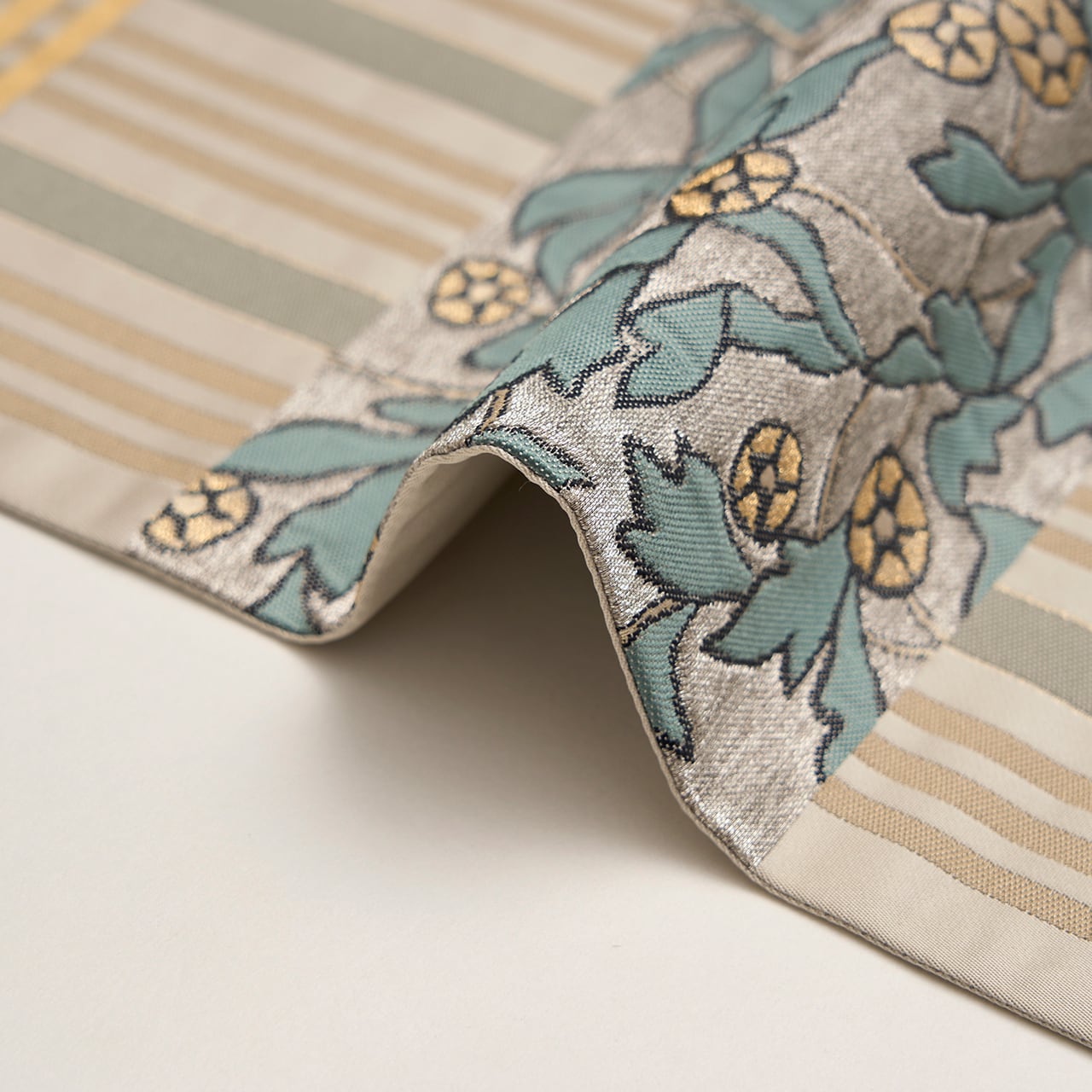 銀糸で織られた背景に、お花は金糸で、躍動感のある葉は褐色で織られたタンポポの模様の段が交互に織り出された、お洒落な雰囲気の袋帯です。