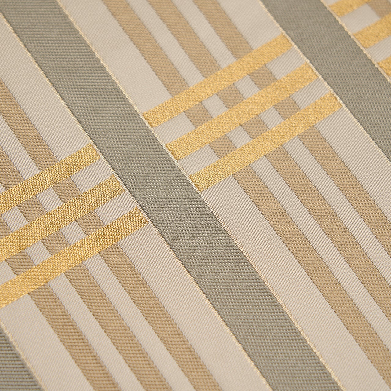 しっとりとした手触りの枯野色の地に、縦には煤色のグレーの太い縞と江戸鼠色の細い縞とが織り出され、砥粉色の黄色に見える横縞が金糸で織り込まれたお洒落な格子の模様と、