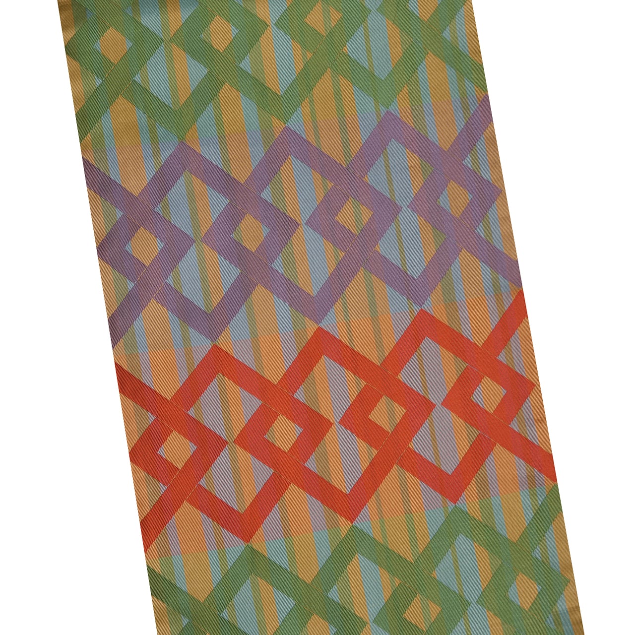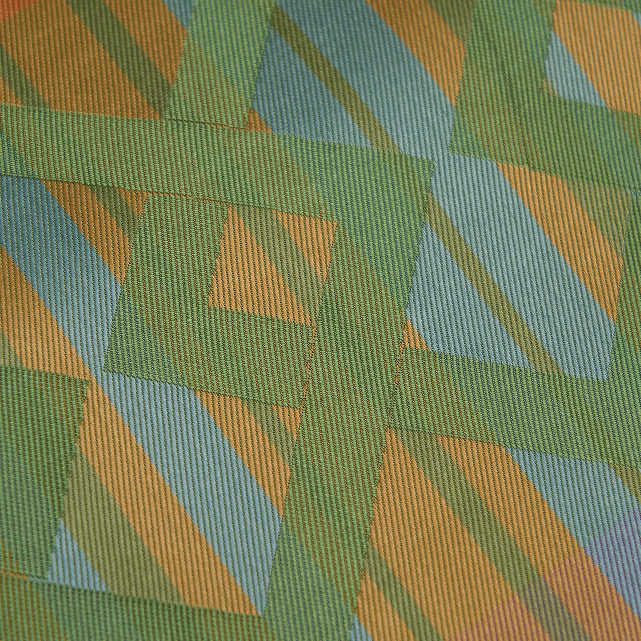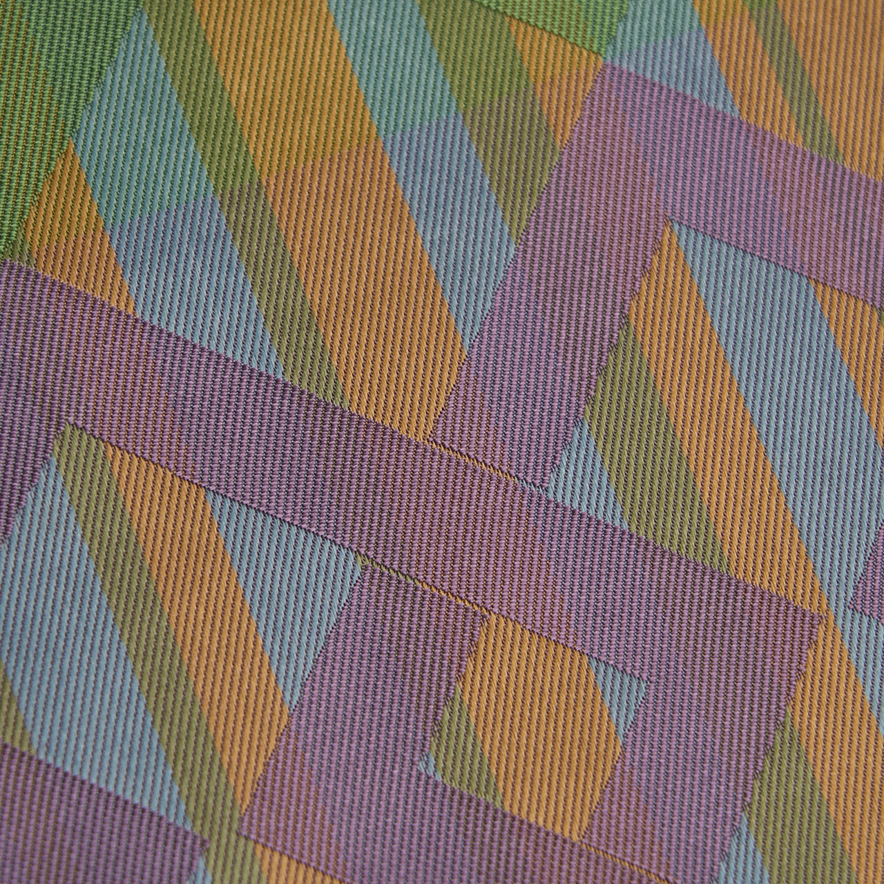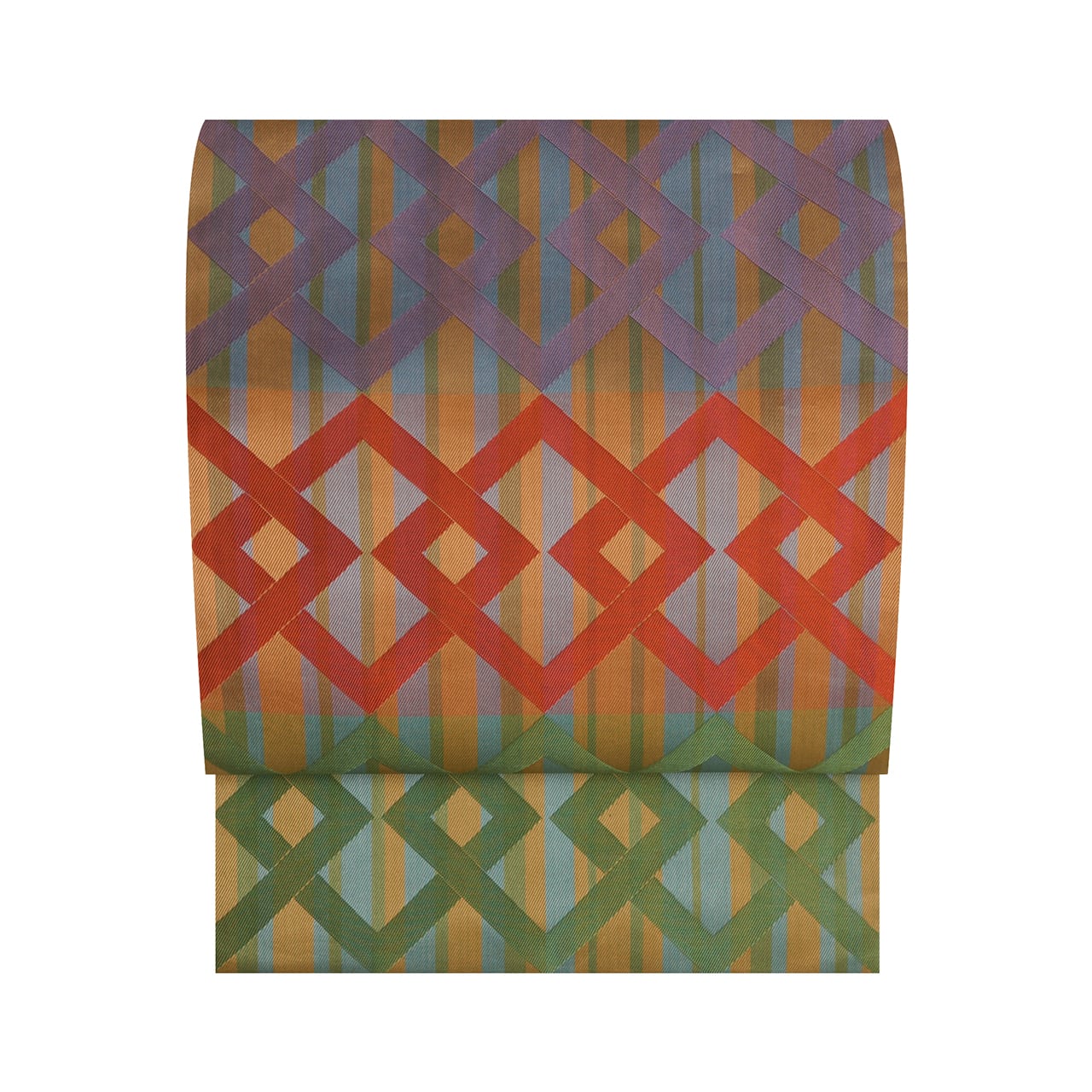 ランダムな幅の縦縞が織られ、それが水浅葱色や薄色、紺鼠色など緯糸の色を変えて段変わりになった地に、蘇芳色の赤、花緑青の緑、二藍色の紫の大きな四角が組み合わさって連なっているような模様が織り出された、大胆なデザインと色使いがとても格好良い印象の、喜多川俵二さんの作品としては少し珍しいタイプの九寸名古屋帯です。