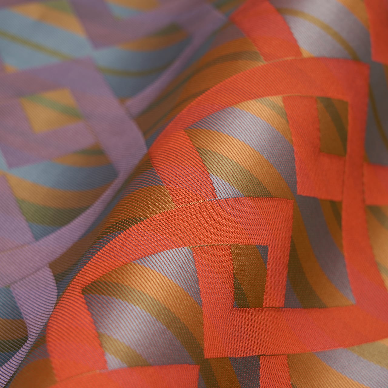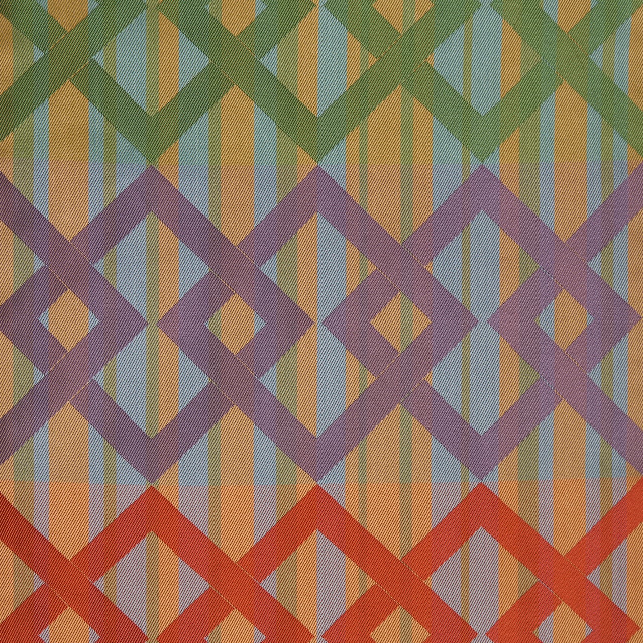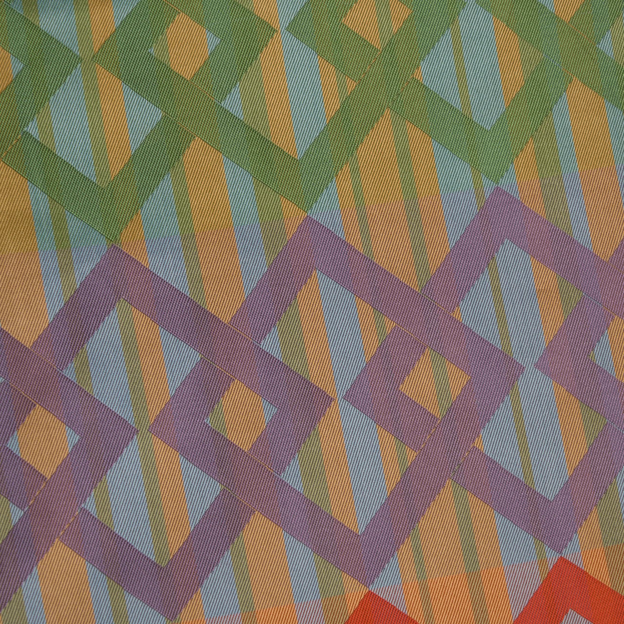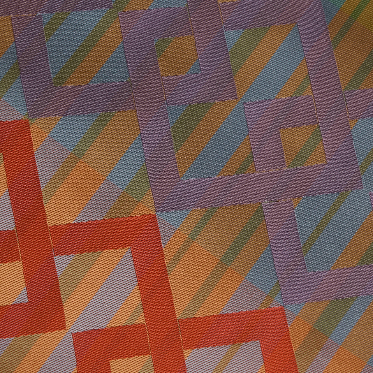 ランダムな幅の縦縞が織られ、それが水浅葱色や薄色、紺鼠色など緯糸の色を変えて段変わりになった地に、蘇芳色の赤、花緑青の緑、二藍色の紫の大きな四角が組み合わさって連なっているような模様が織り出された、大胆なデザインと色使いがとても格好良い印象の、喜多川俵二さんの作品としては少し珍しいタイプの九寸名古屋帯です。