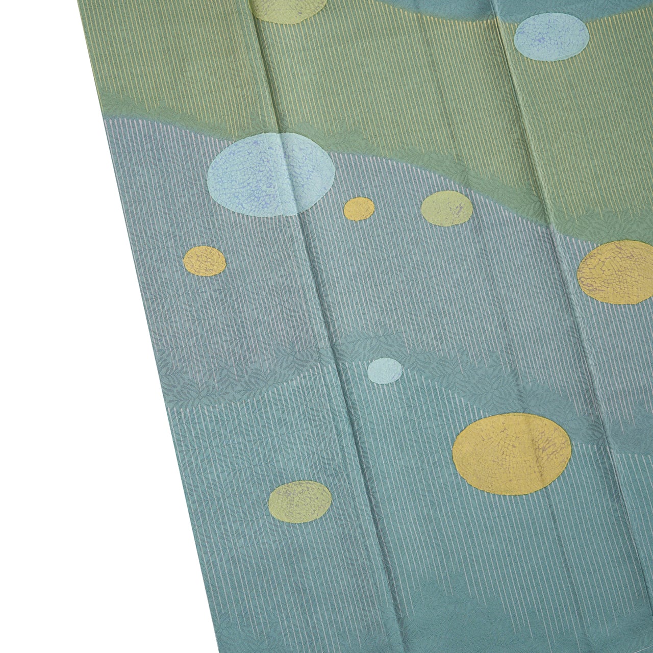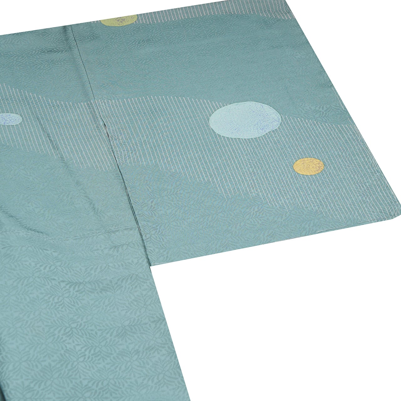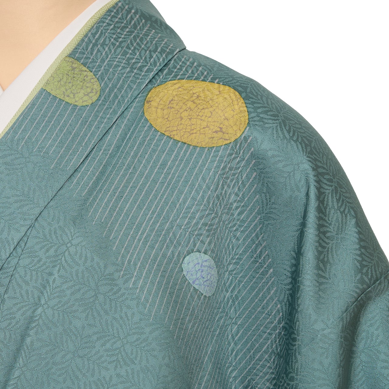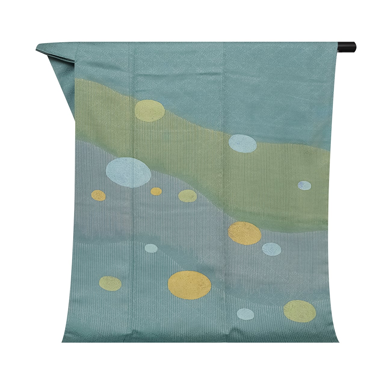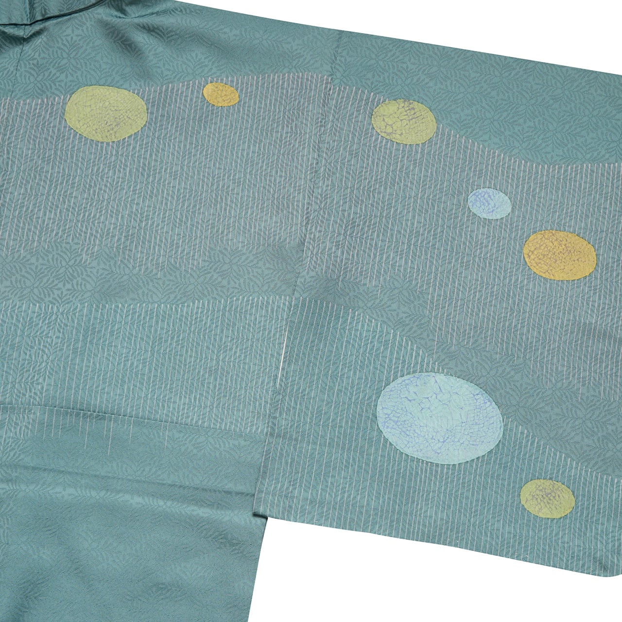 中くらいの大きさの海松の図案が地模様として織り込まれた上質な紋意匠の生地が、少しだけ緑味のある淡い藍・青碧色に染められ、肩口や裾周りは流れる水のようなうねりのある線で区切られ、その中に細い縦の線が何段も手描きで引かれ、それを背景に水の玉のように散らされた大小の丸が、一珍染のようなひび割れになった手描きのロウケツ染で描かれた、とてもお洒落な雰囲気の訪問着のお着物です。