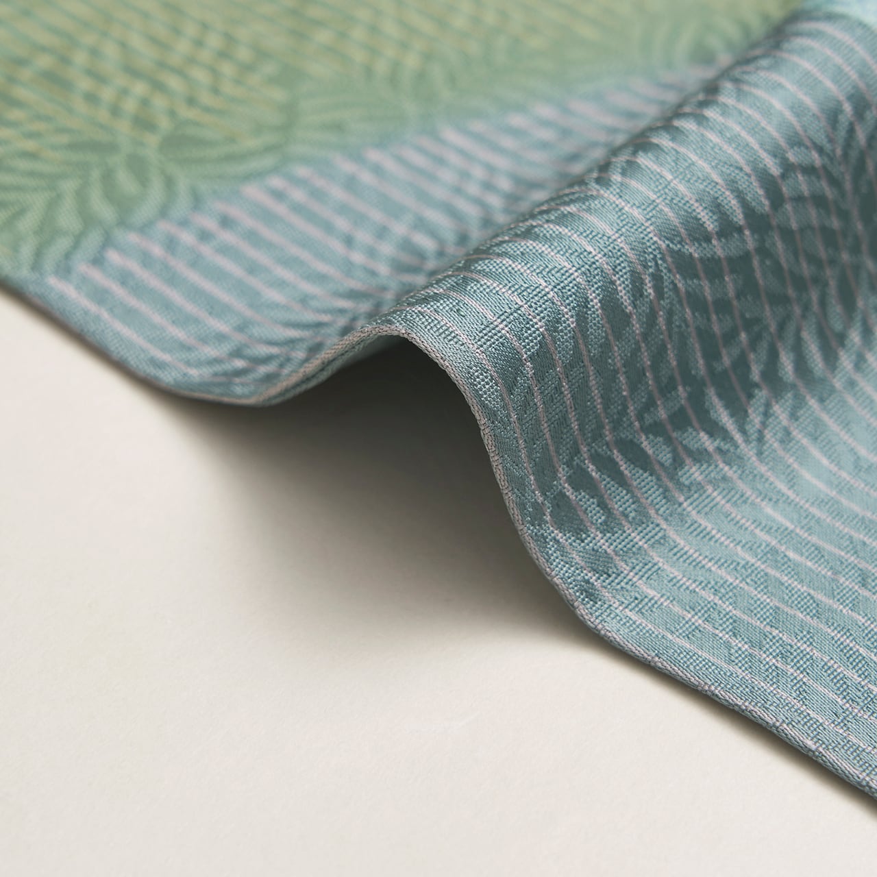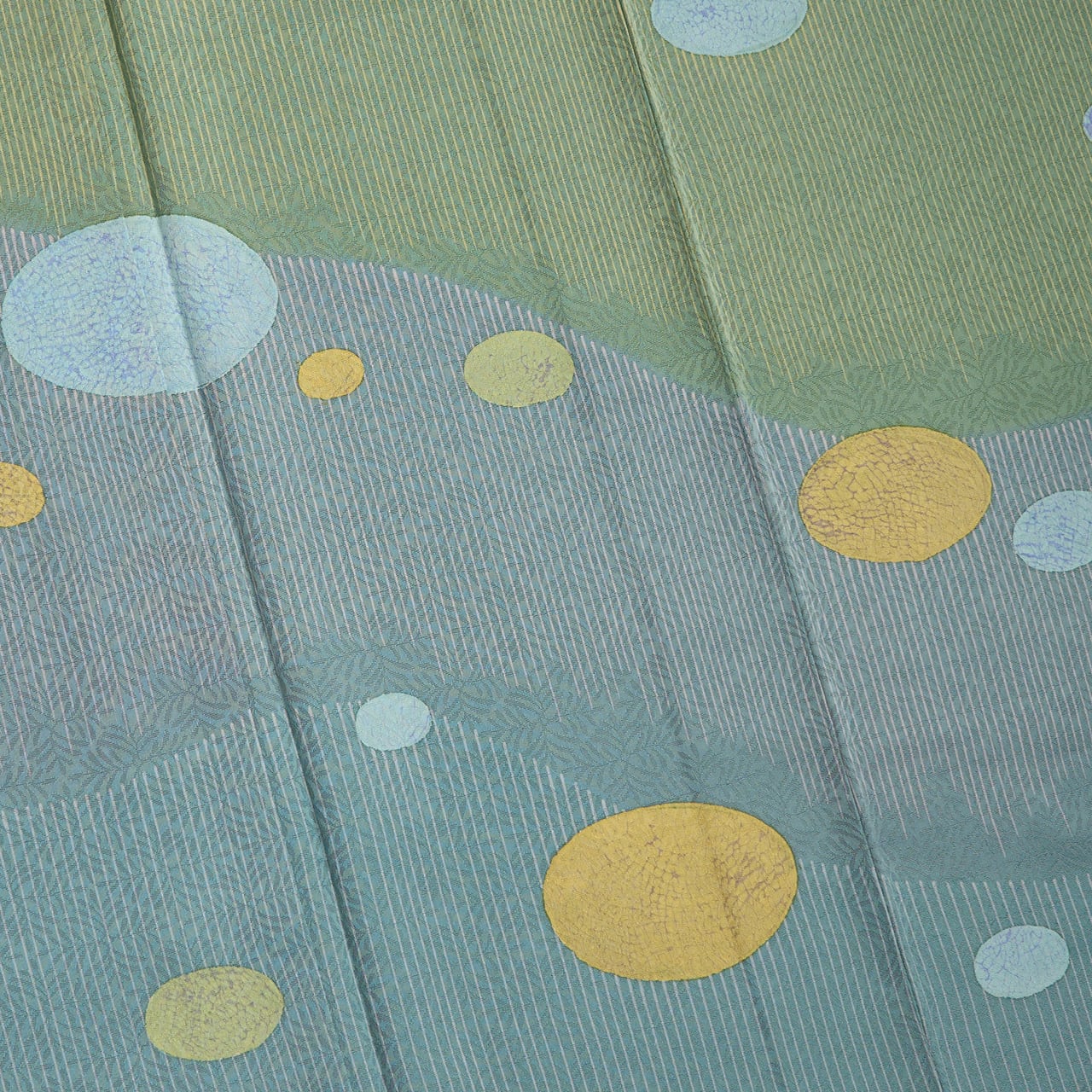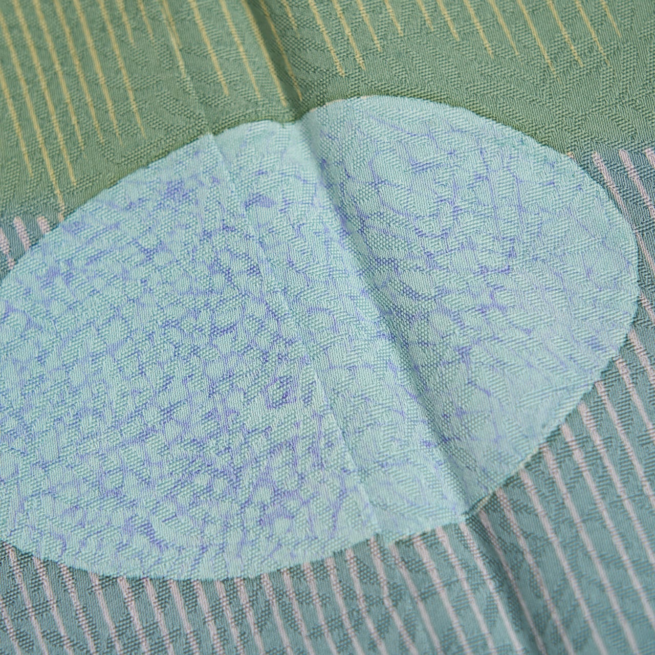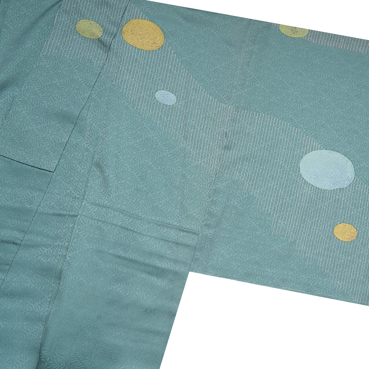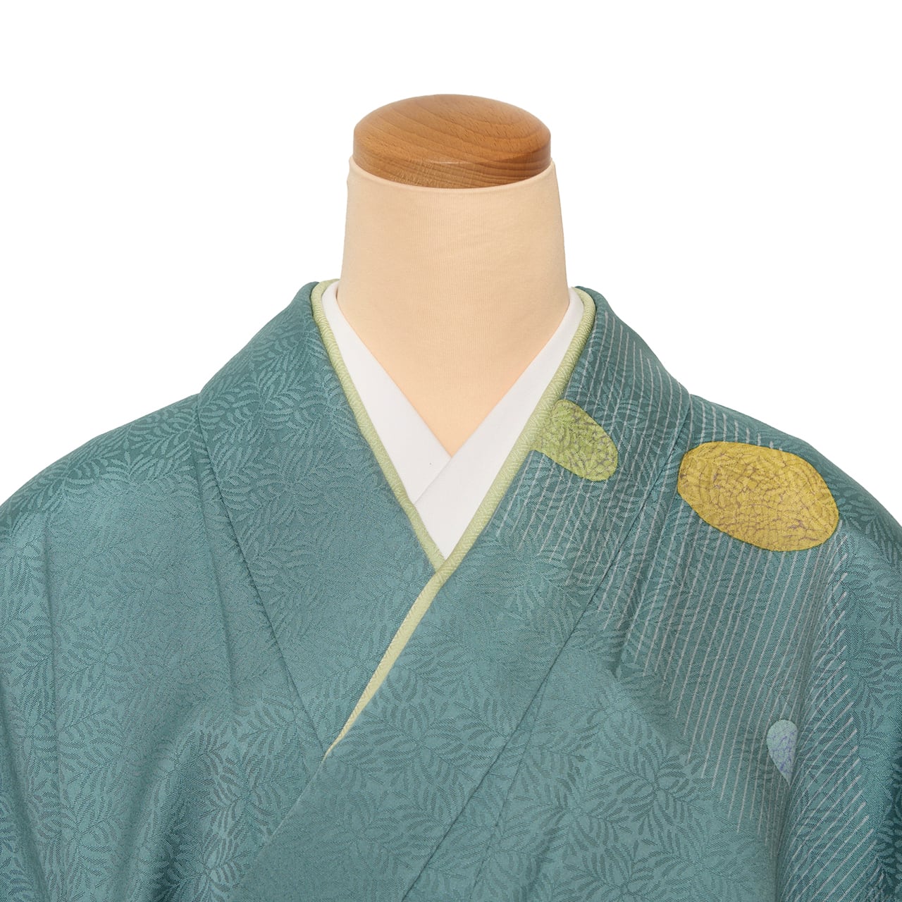中くらいの大きさの海松の図案が地模様として織り込まれた上質な紋意匠の生地が、少しだけ緑味のある淡い藍・青碧色に染められ、肩口や裾周りは流れる水のようなうねりのある線で区切られ、その中に細い縦の線が何段も手描きで引かれ、それを背景に水の玉のように散らされた大小の丸が、一珍染のようなひび割れになった手描きのロウケツ染で描かれた、とてもお洒落な雰囲気の訪問着のお着物です。