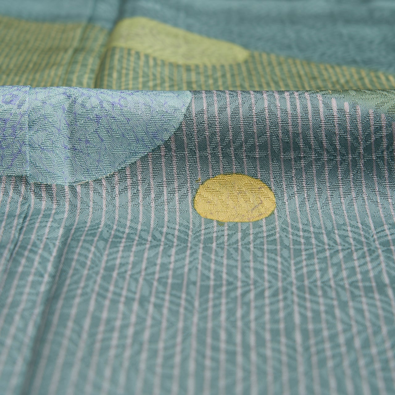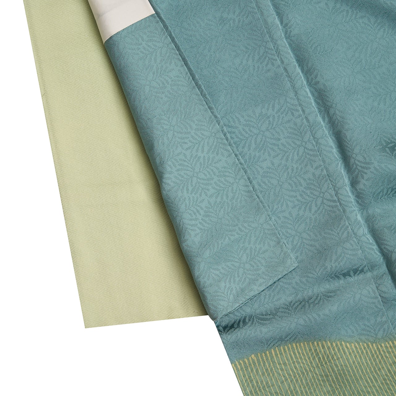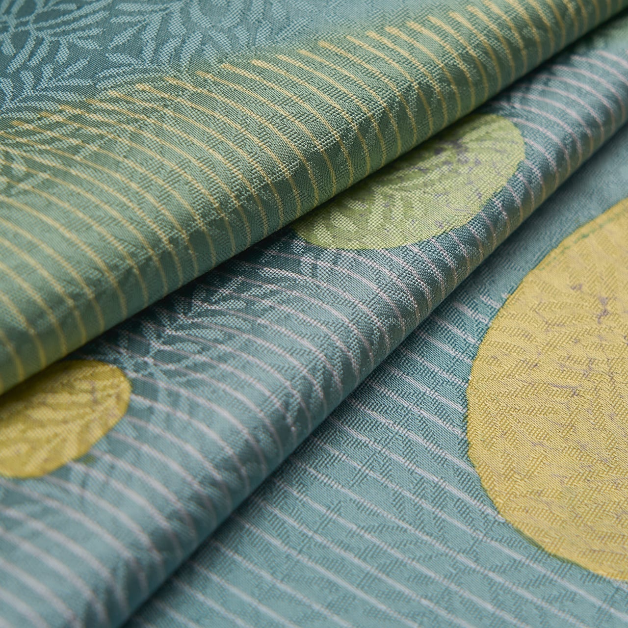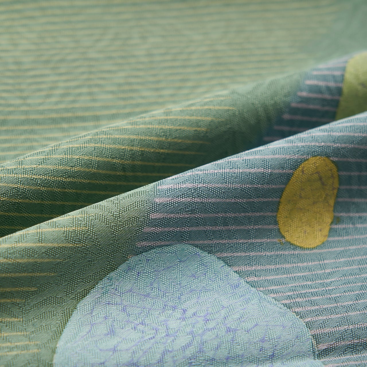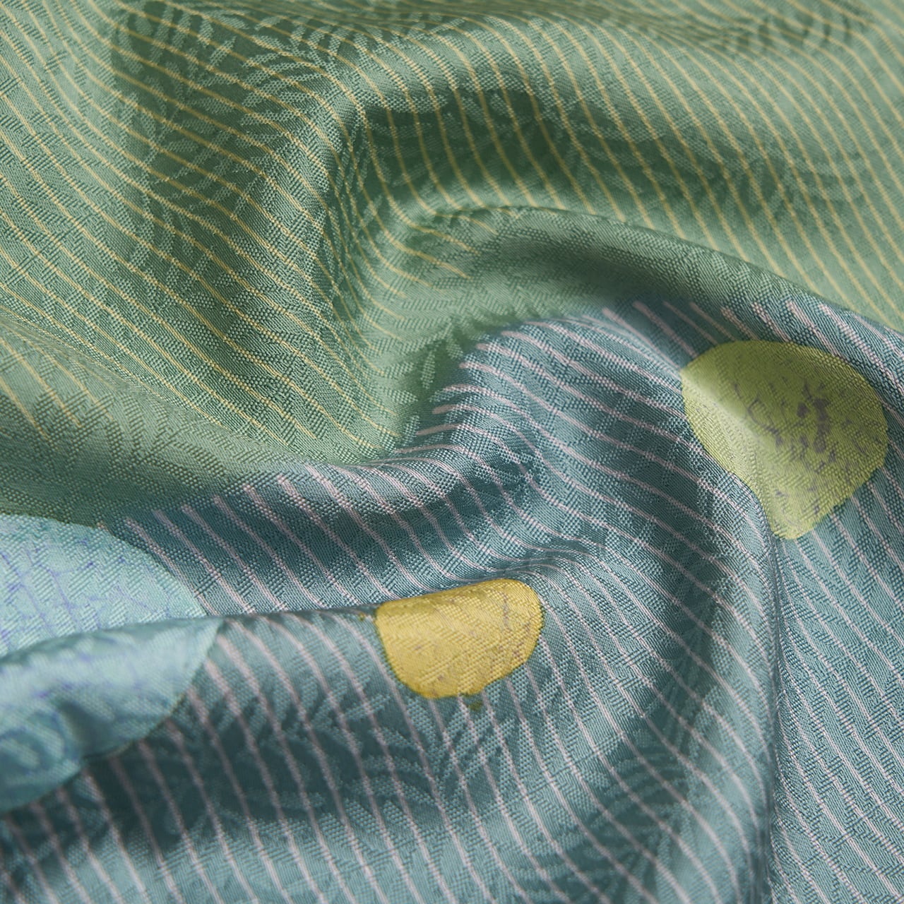 中くらいの大きさの海松の図案が地模様として織り込まれた上質な紋意匠の生地が、少しだけ緑味のある淡い藍・青碧色に染められ、肩口や裾周りは流れる水のようなうねりのある線で区切られ、その中に細い縦の線が何段も手描きで引かれ、それを背景に水の玉のように散らされた大小の丸が、一珍染のようなひび割れになった手描きのロウケツ染で描かれた、とてもお洒落な雰囲気の訪問着のお着物です。