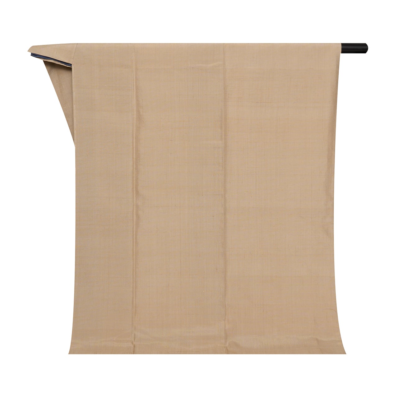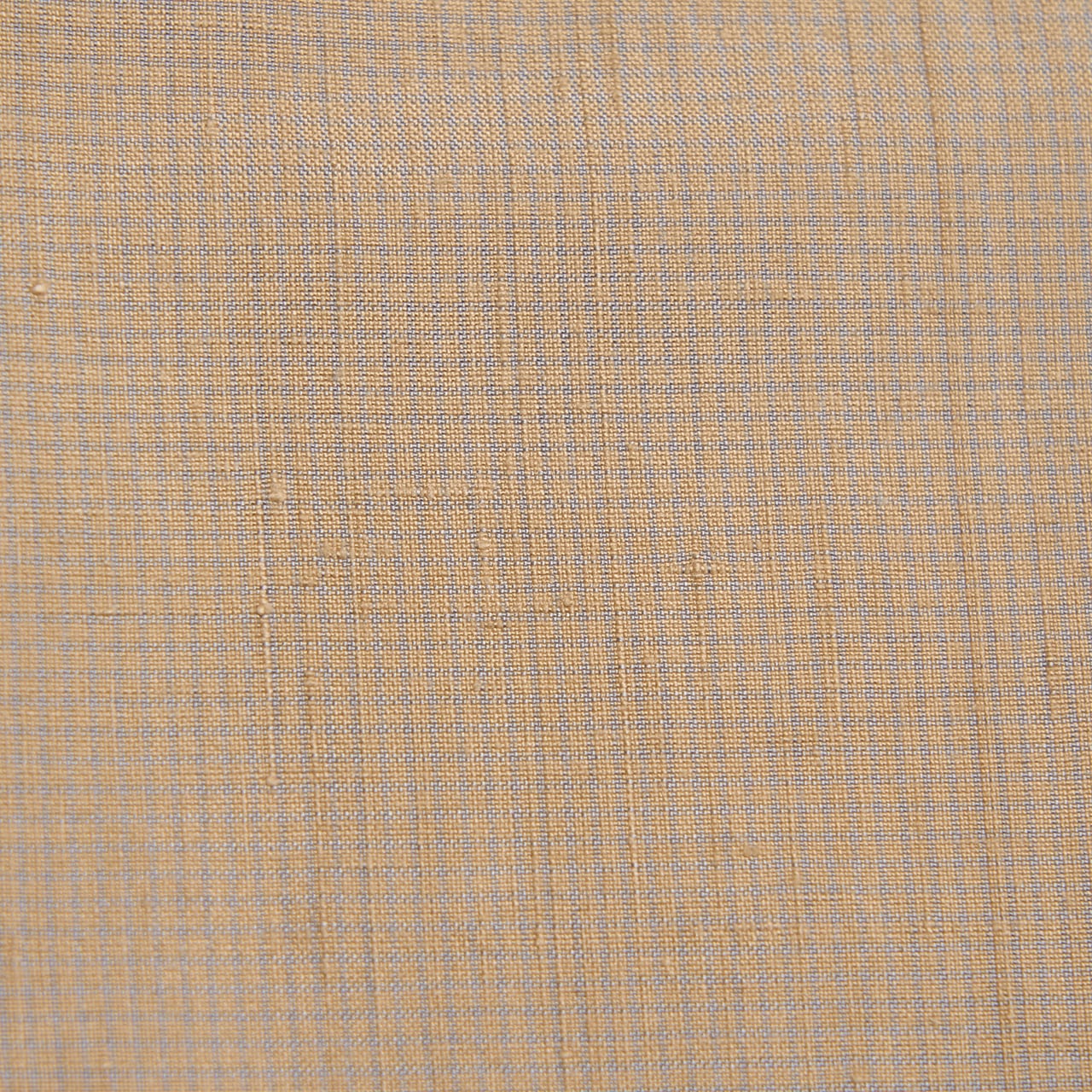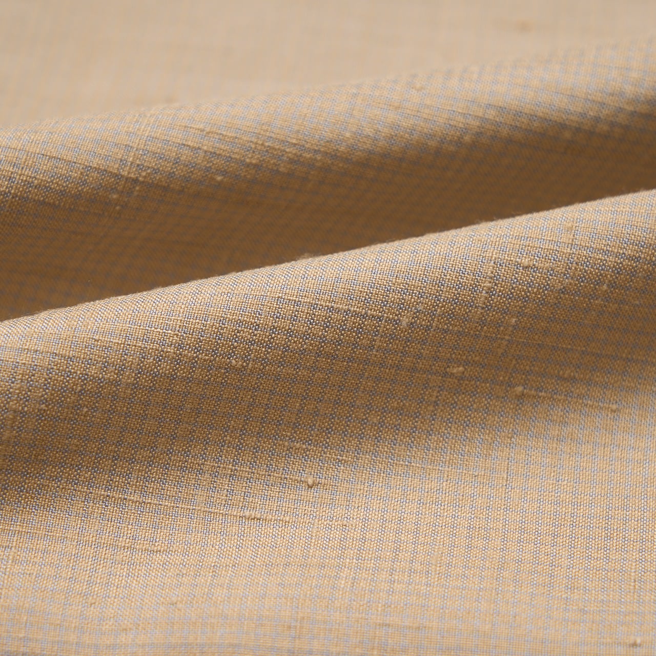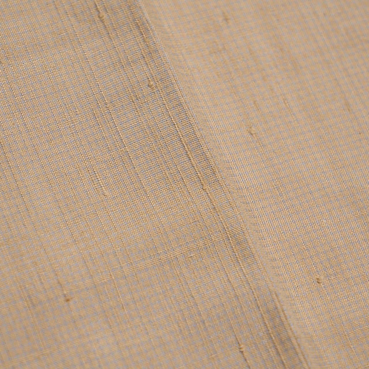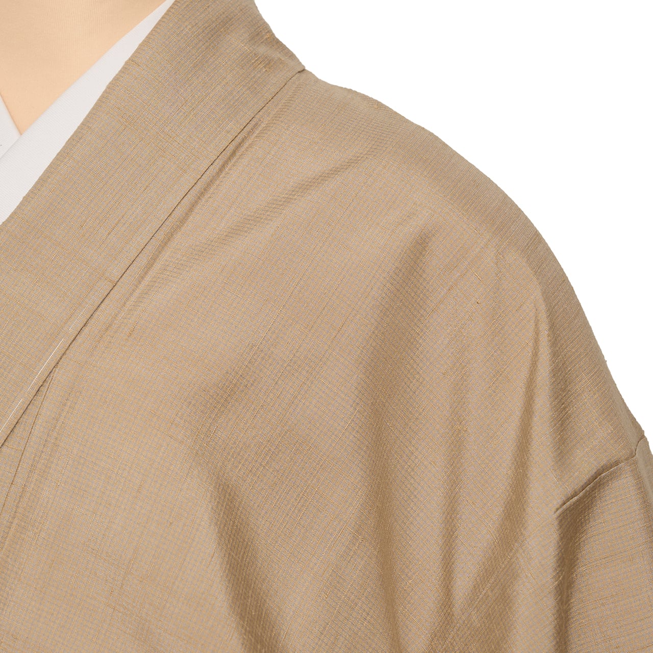 全体に小さなネップのような節が見られる、風合いの良い胡桃染のベージュの地に、淡い藍・水浅葱色の糸でみじん格子の模様が織り出された、少し離れるとニュアンスのある無地に見えるような素敵な紬のお着物です。