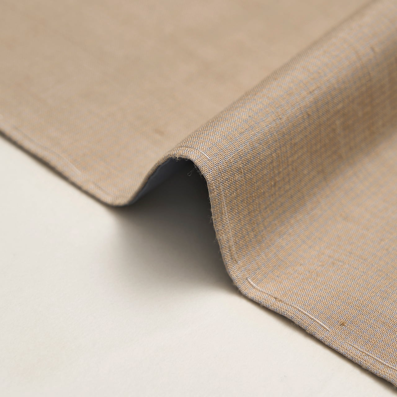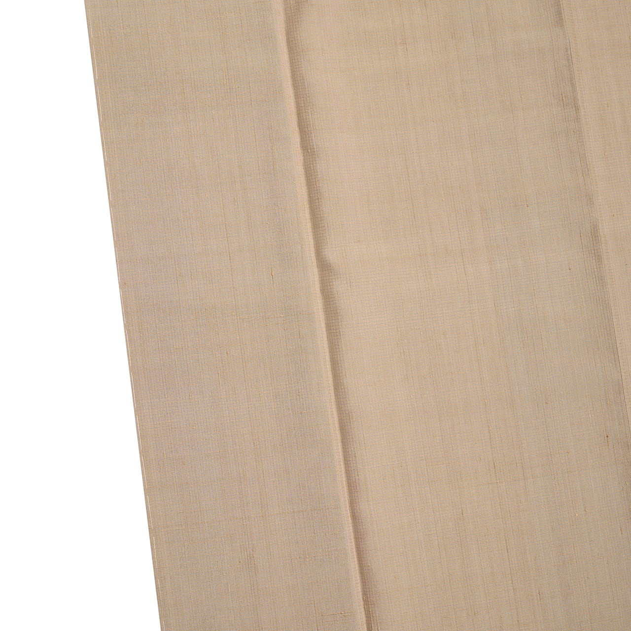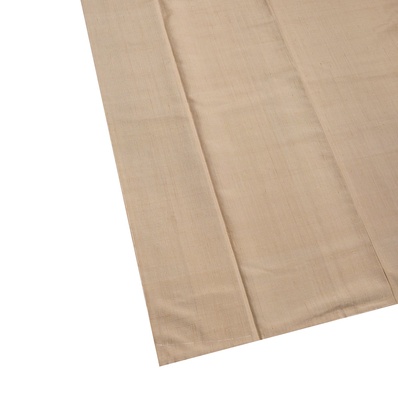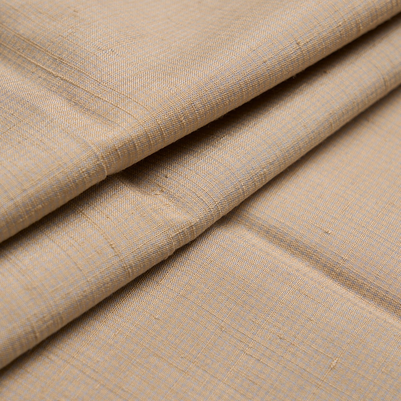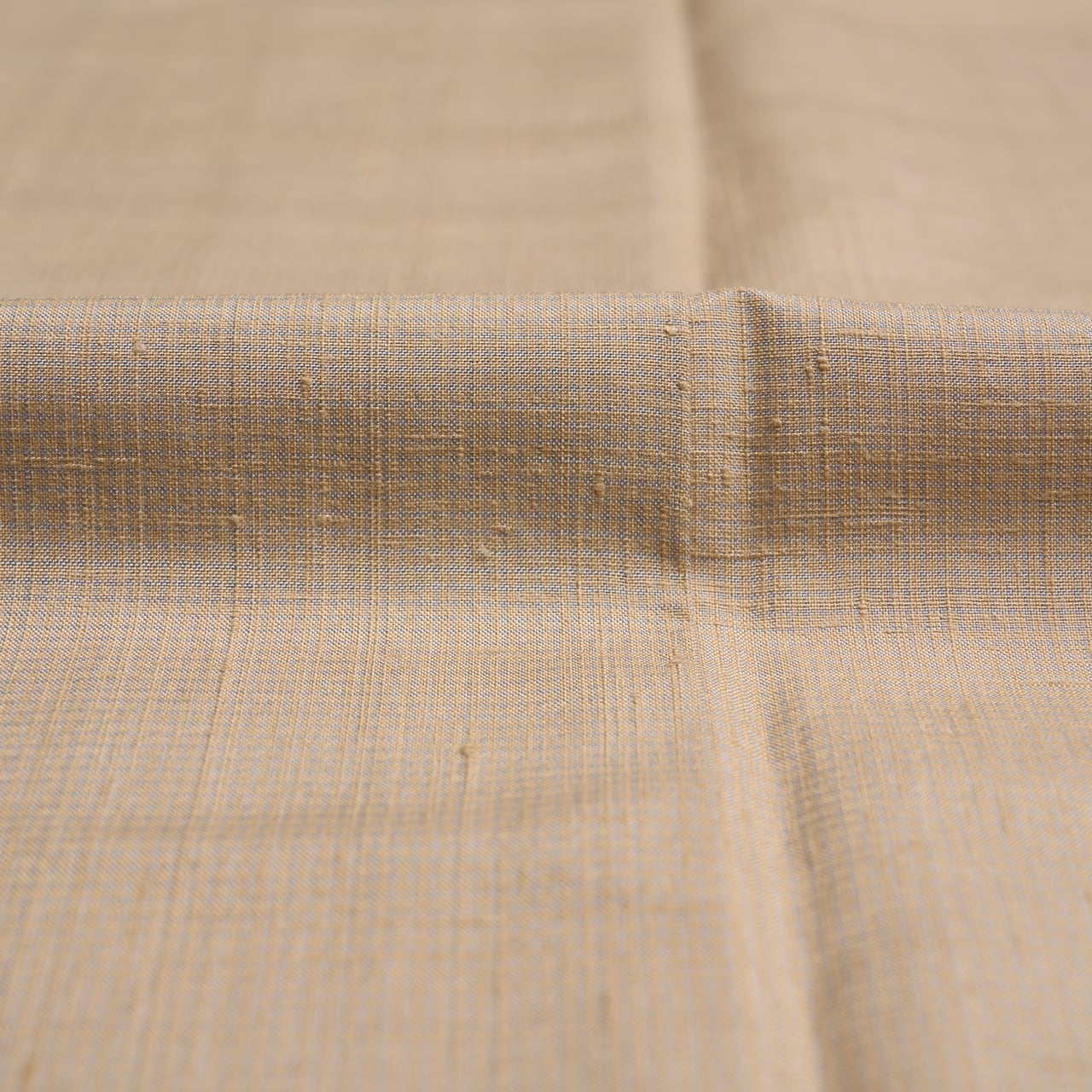全体に小さなネップのような節が見られる、風合いの良い胡桃染のベージュの地に、淡い藍・水浅葱色の糸でみじん格子の模様が織り出された、少し離れるとニュアンスのある無地に見えるような素敵な紬のお着物です。