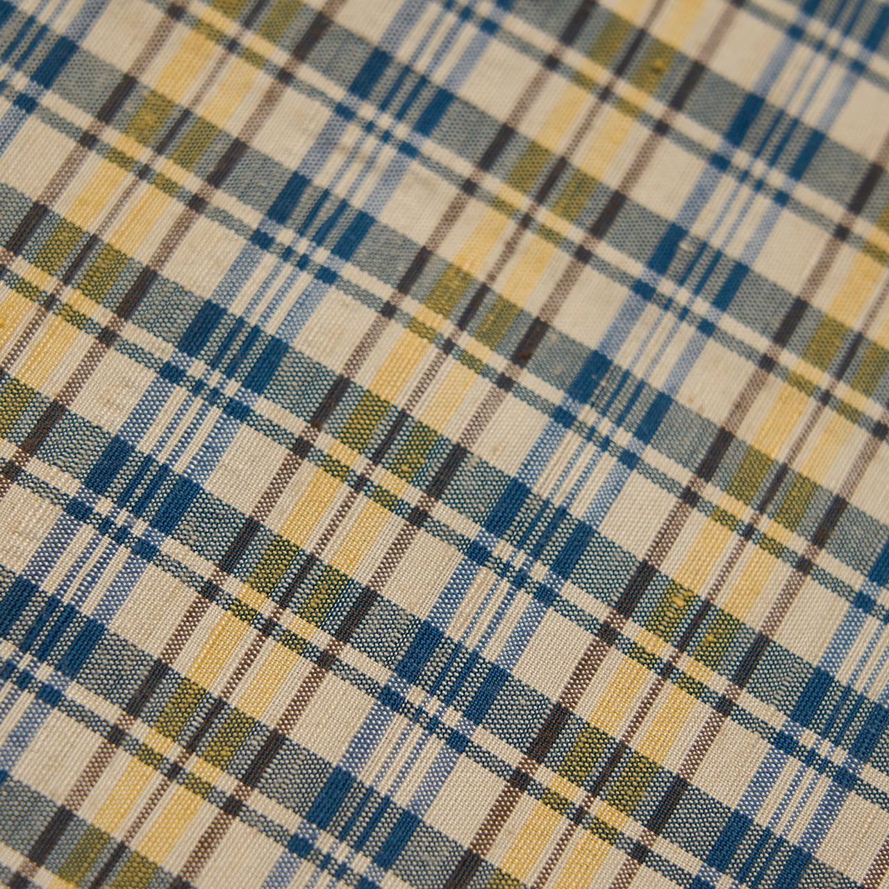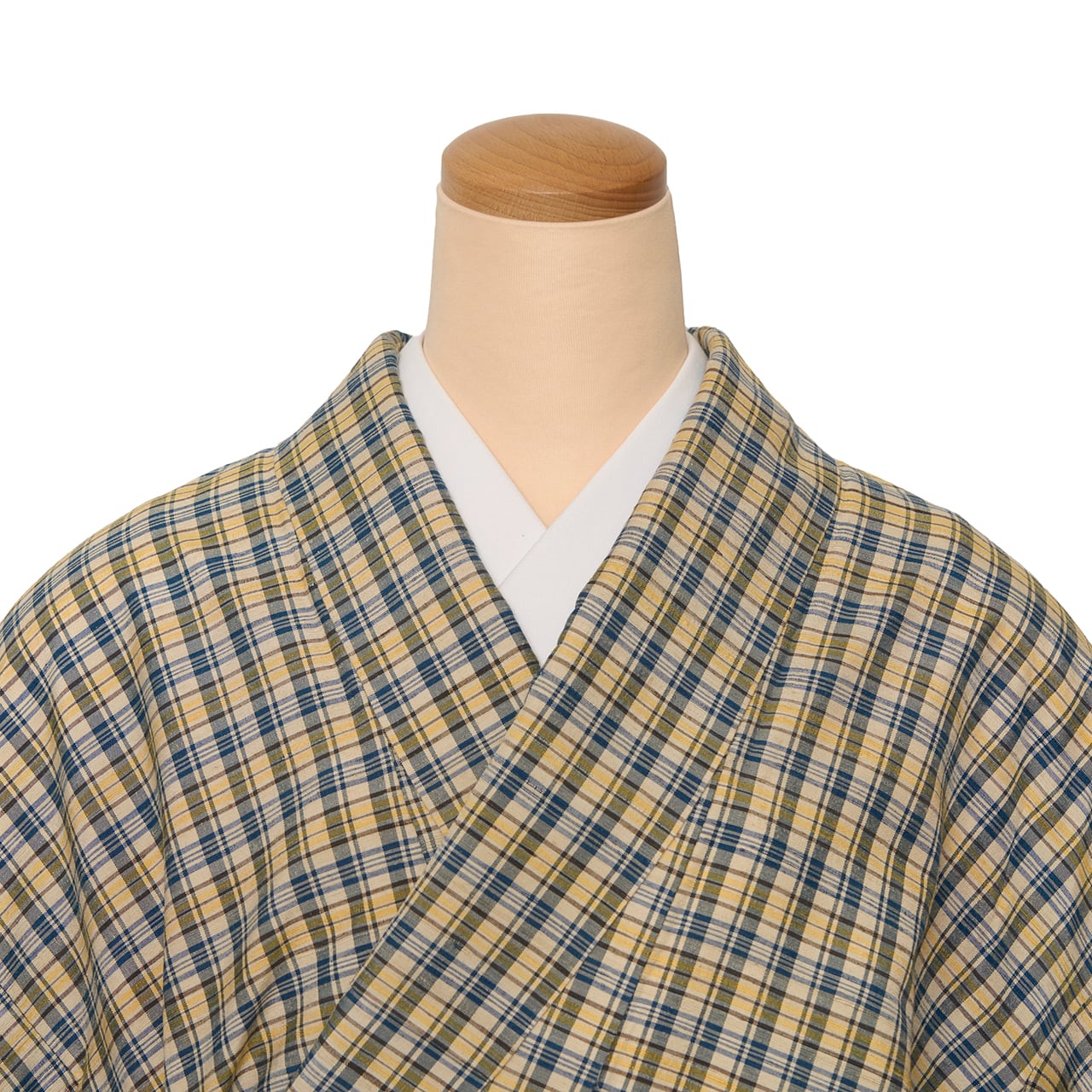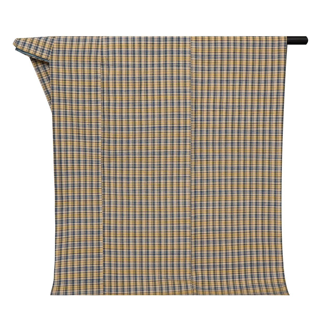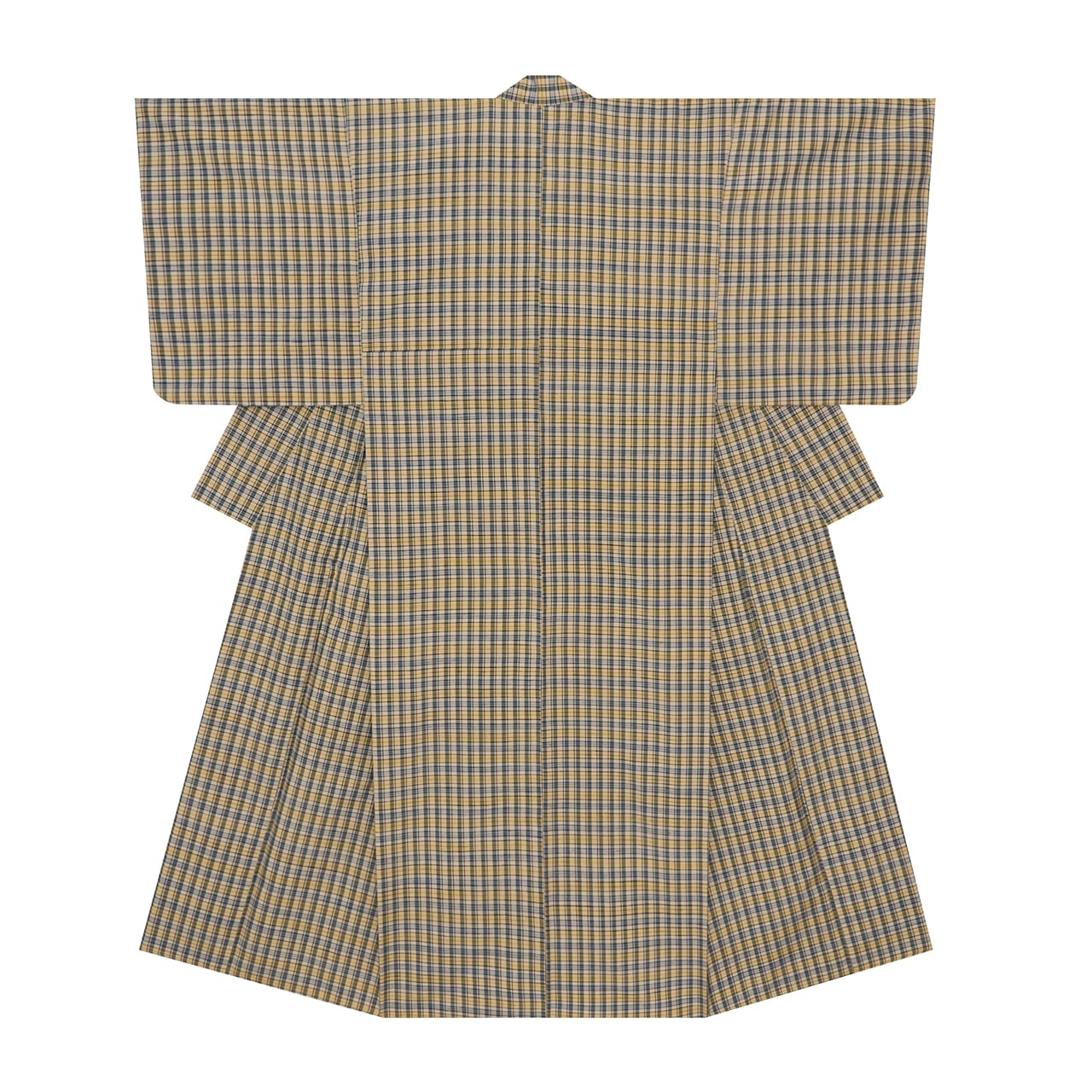 淡いグレーベージュ・灰白色の地に、横には砥粉色の黄色の太い幅の縞と、その上下には憲法色の焦げ茶の細い縞が縁取りのように置かれ、その段の間には藍で染められた鉄紺色の細い縞が織り込まれ、縦には少しグレー味のある藍・御召御納戸色の変化のある縞が織り込まれて変り格子の模様を構成した、とてもお洒落な雰囲気の座繰りの紬のお着物です。