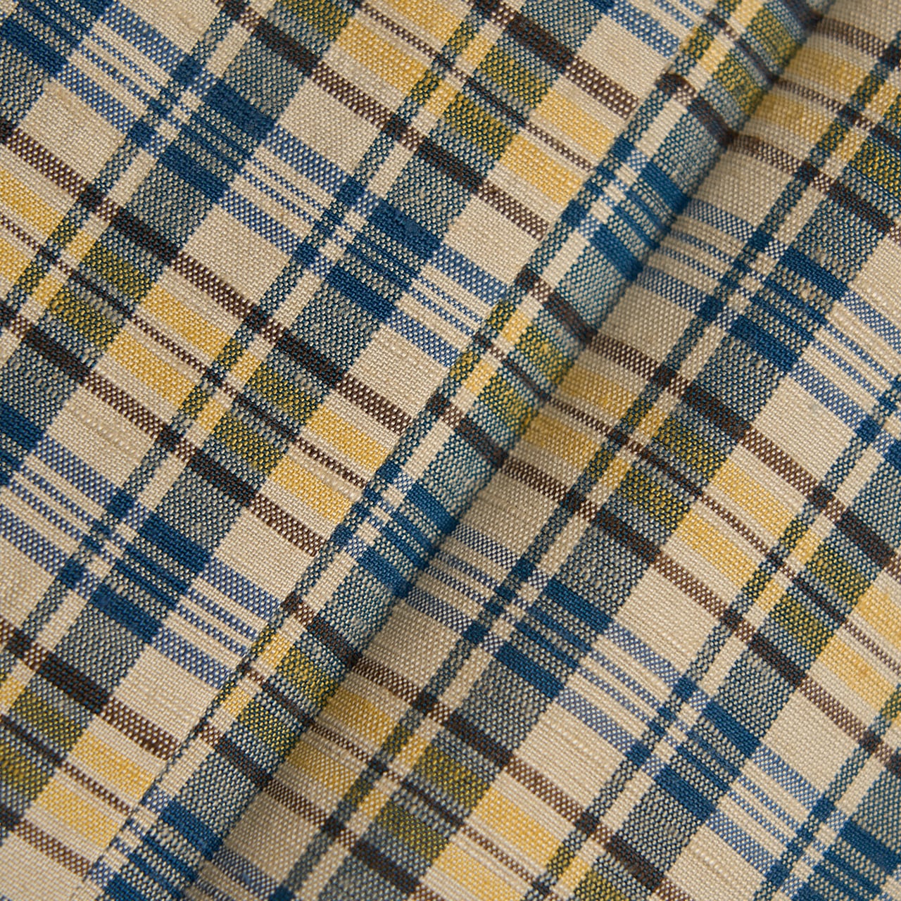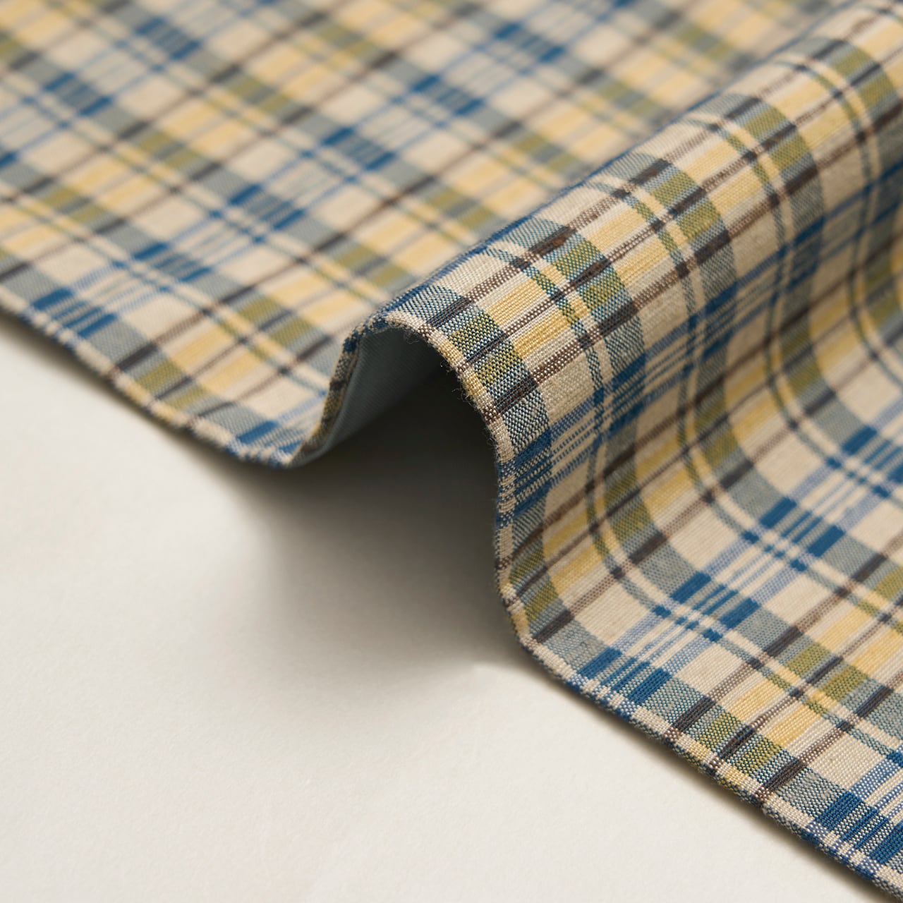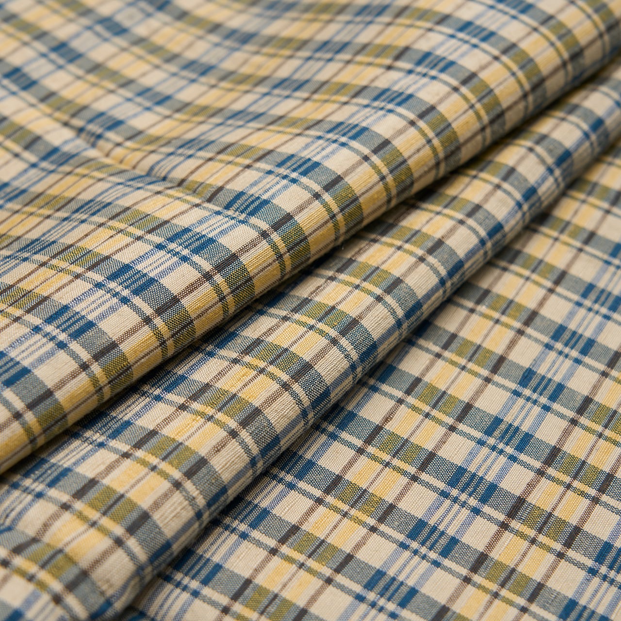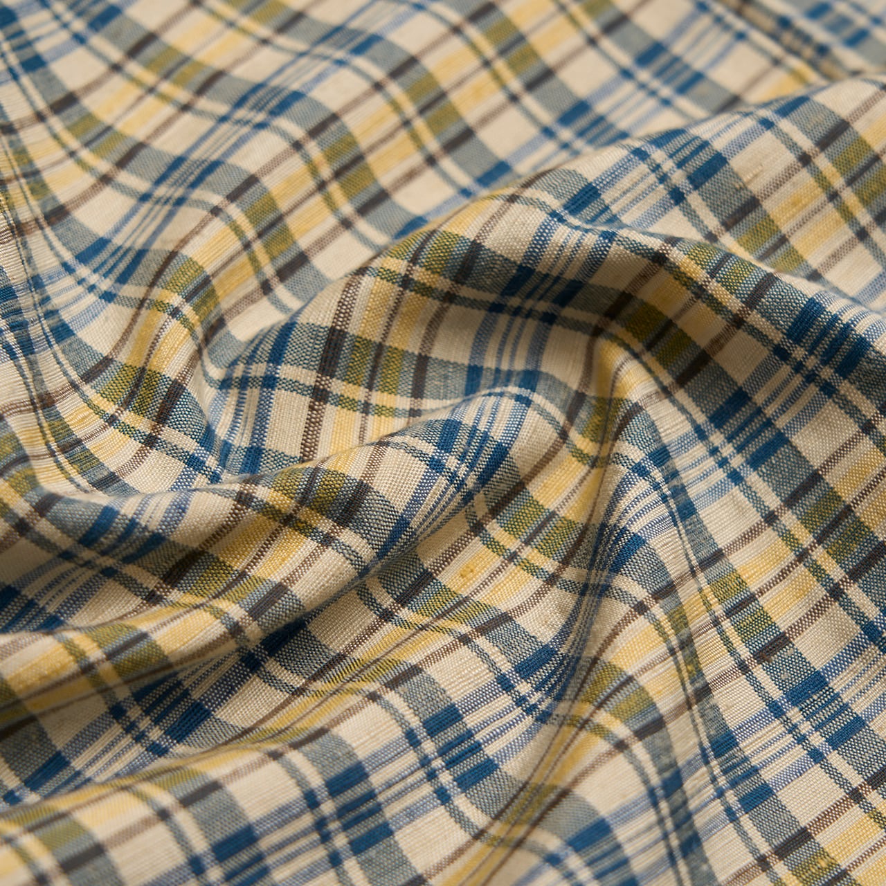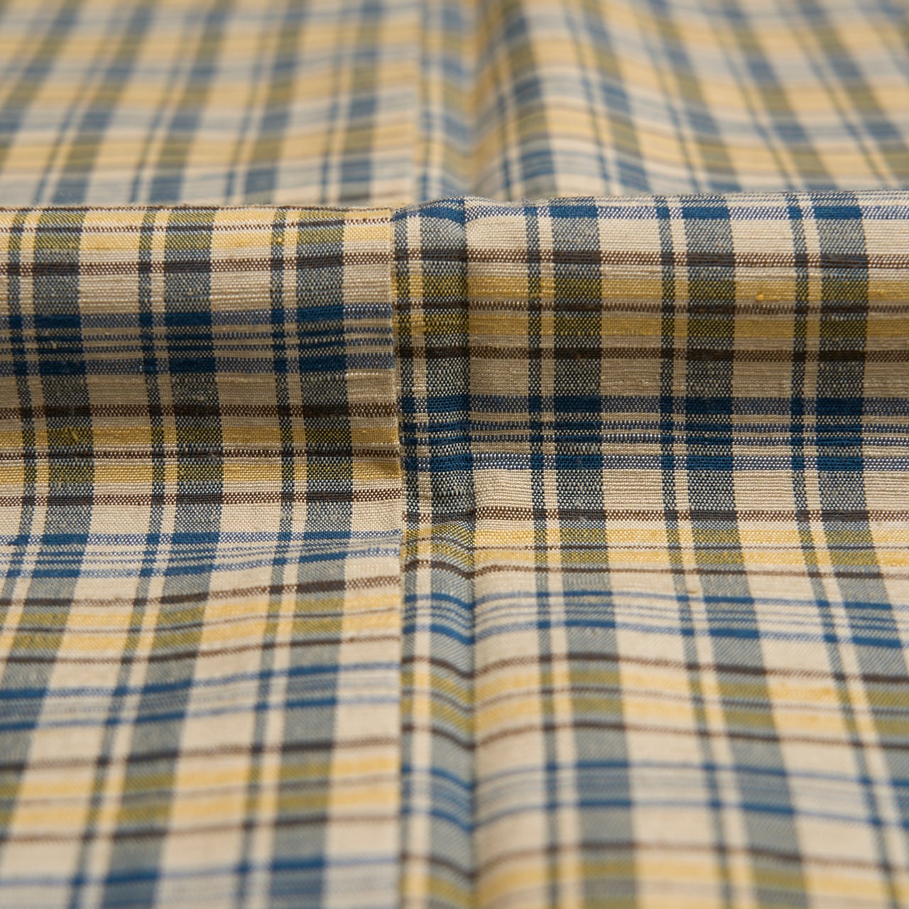 淡いグレーベージュ・灰白色の地に、横には砥粉色の黄色の太い幅の縞と、その上下には憲法色の焦げ茶の細い縞が縁取りのように置かれ、その段の間には藍で染められた鉄紺色の細い縞が織り込まれ、縦には少しグレー味のある藍・御召御納戸色の変化のある縞が織り込まれて変り格子の模様を構成した、とてもお洒落な雰囲気の座繰りの紬のお着物です。