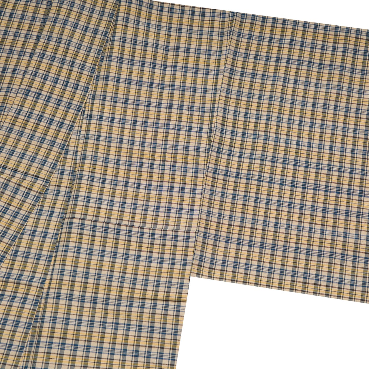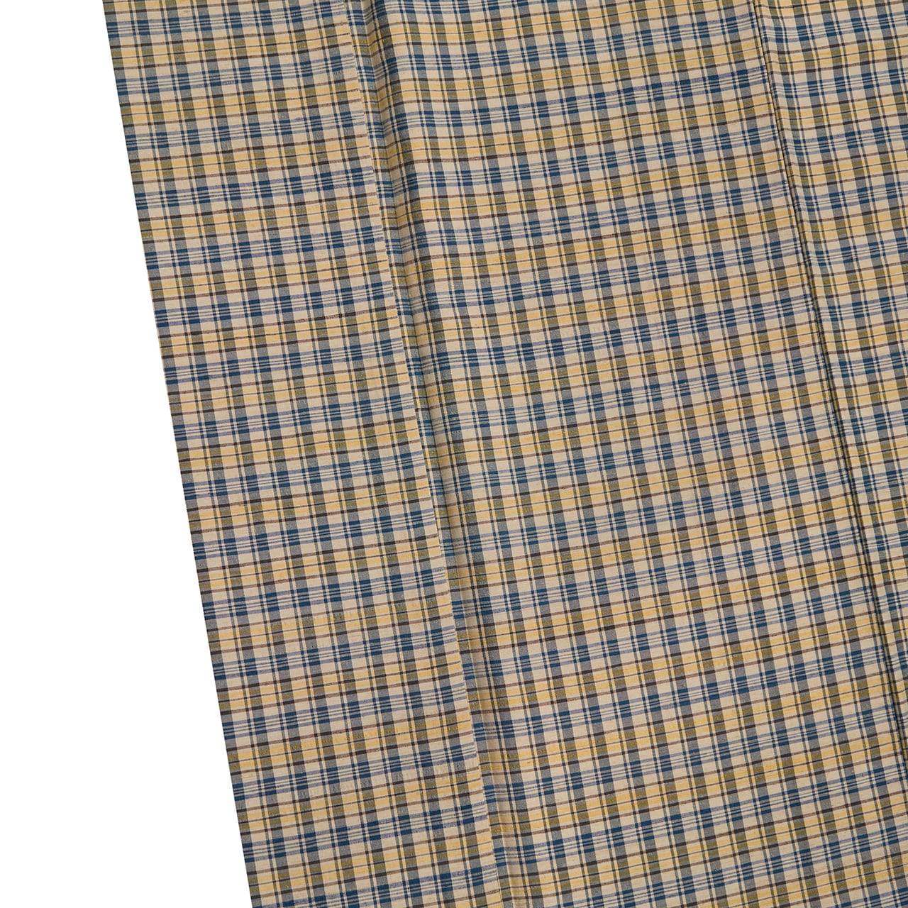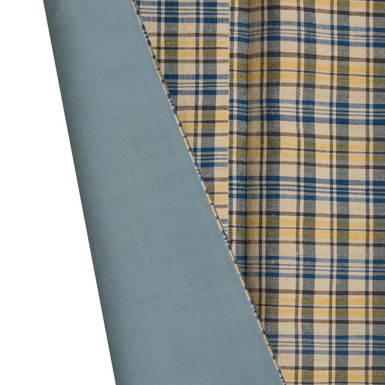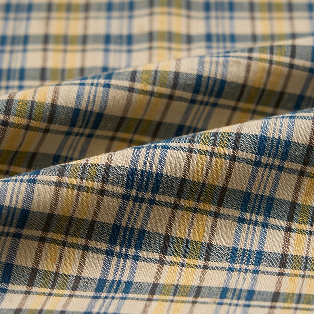 淡いグレーベージュ・灰白色の地に、横には砥粉色の黄色の太い幅の縞と、その上下には憲法色の焦げ茶の細い縞が縁取りのように置かれ、その段の間には藍で染められた鉄紺色の細い縞が織り込まれ、縦には少しグレー味のある藍・御召御納戸色の変化のある縞が織り込まれて変り格子の模様を構成した、とてもお洒落な雰囲気の座繰りの紬のお着物です。