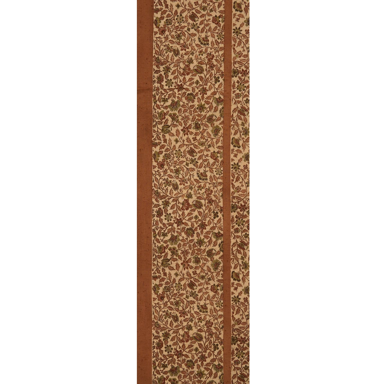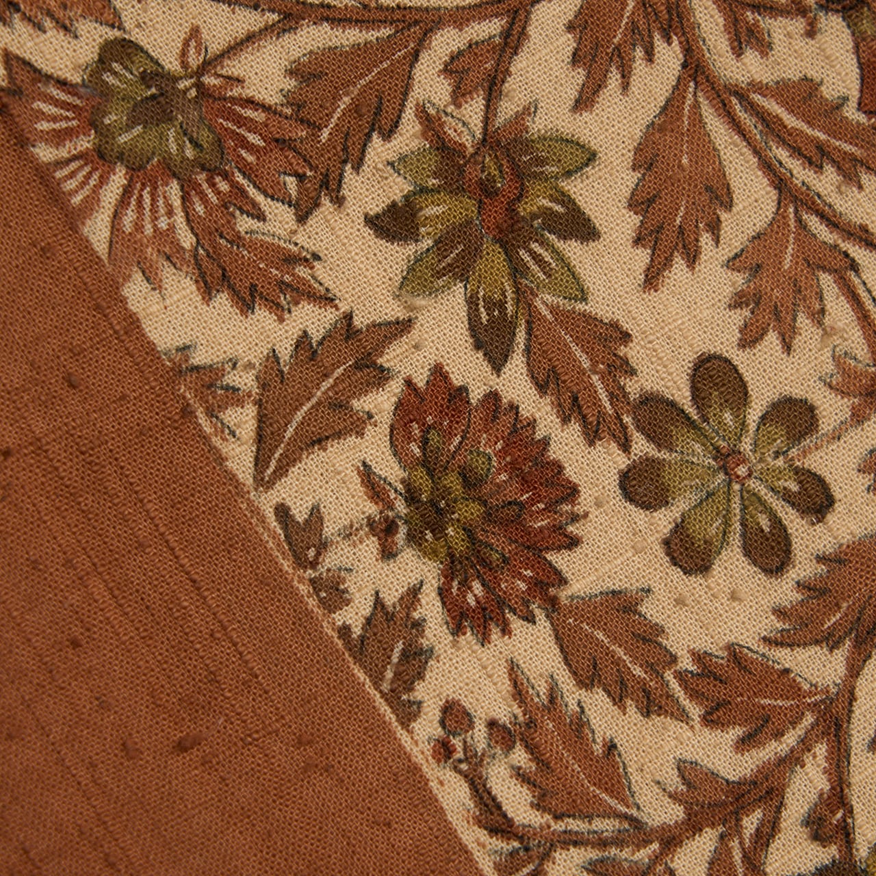 緯にネップのような粒々と、少し節のあるさらりとした質感の紬地が明るめの茶・赭色に染められ、真ん中に大きく、右端に細く幅が取られ、淡いピンク味のあるベージュ・灰梅色に染められて、そこにいろいろな形をした小ぶりなお花をつけた花唐草模様が全通で染められた、シックな色合いがお洒落な雰囲気の袋なごや帯です。
