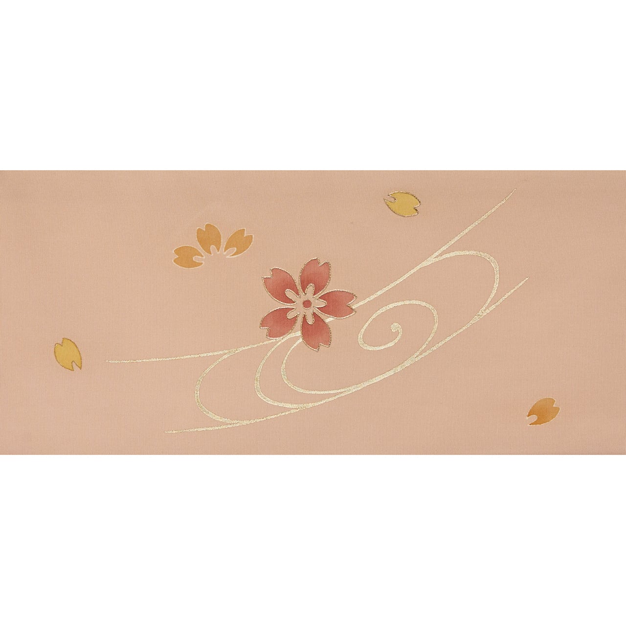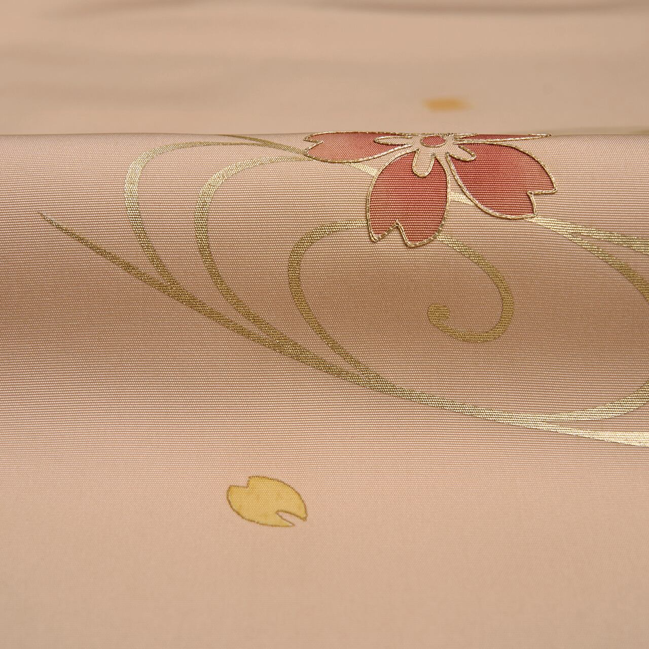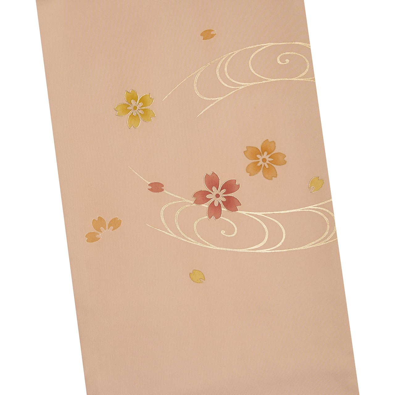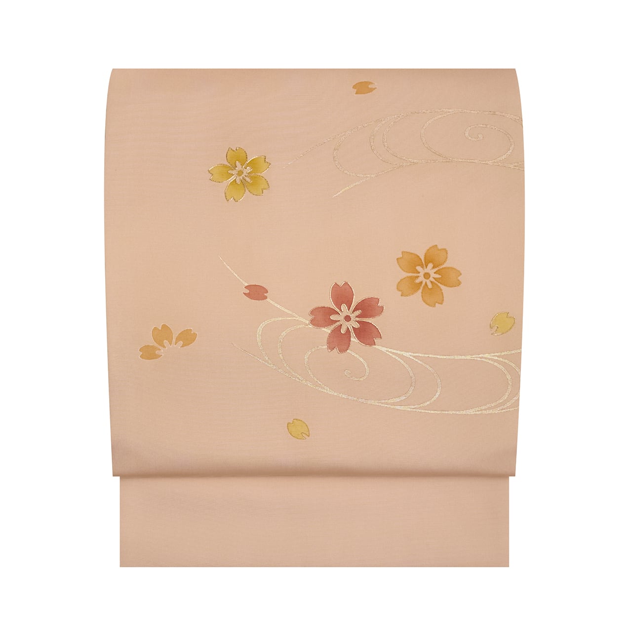 ベージュ味のある淡いピンク・水柿色のしなやかな塩瀬の生地に、お太鼓には観世水のような流水の線が金彩で描かれ、それを背景にして桜のお花と舞うように散らされた花びらが手描きの友禅で描かれ、部分的に手刺繍が施された、優雅な雰囲気の素敵な九寸名古屋帯です。