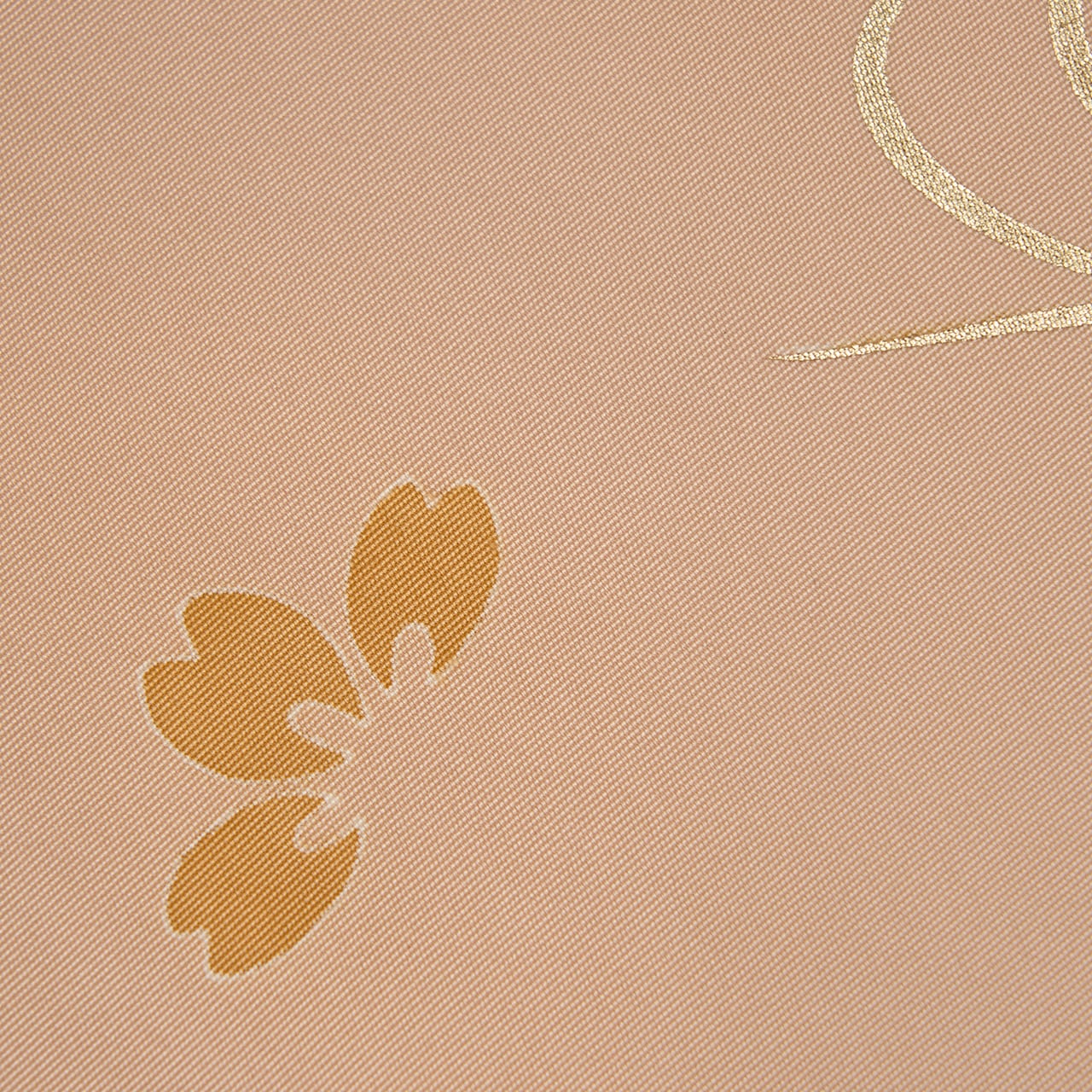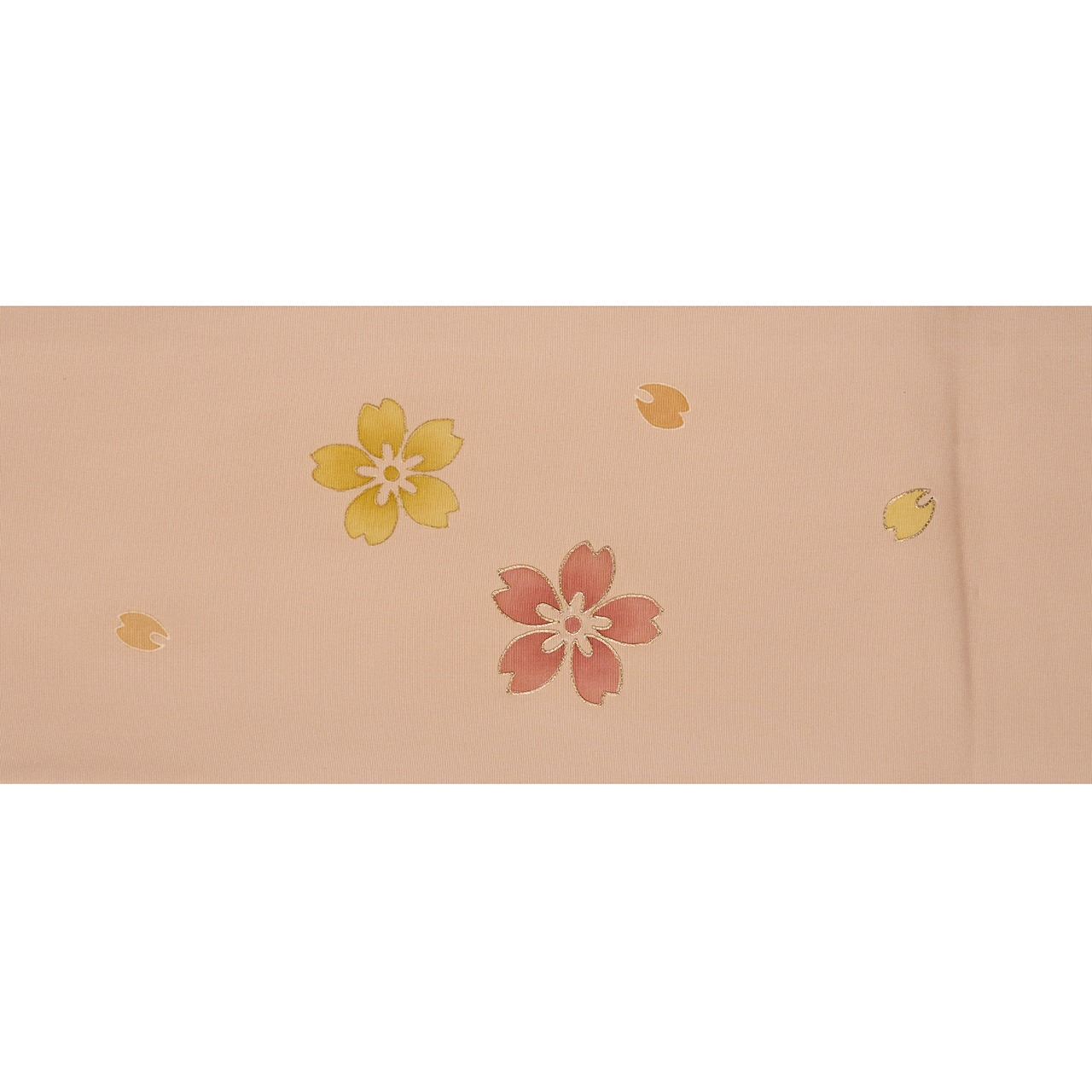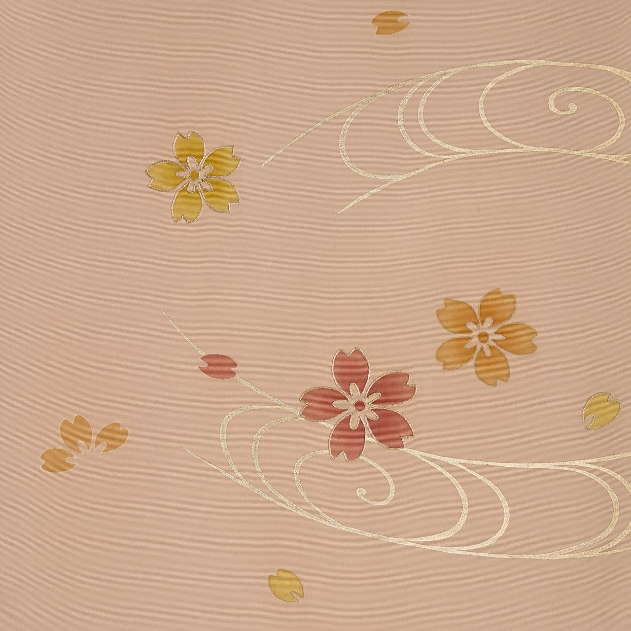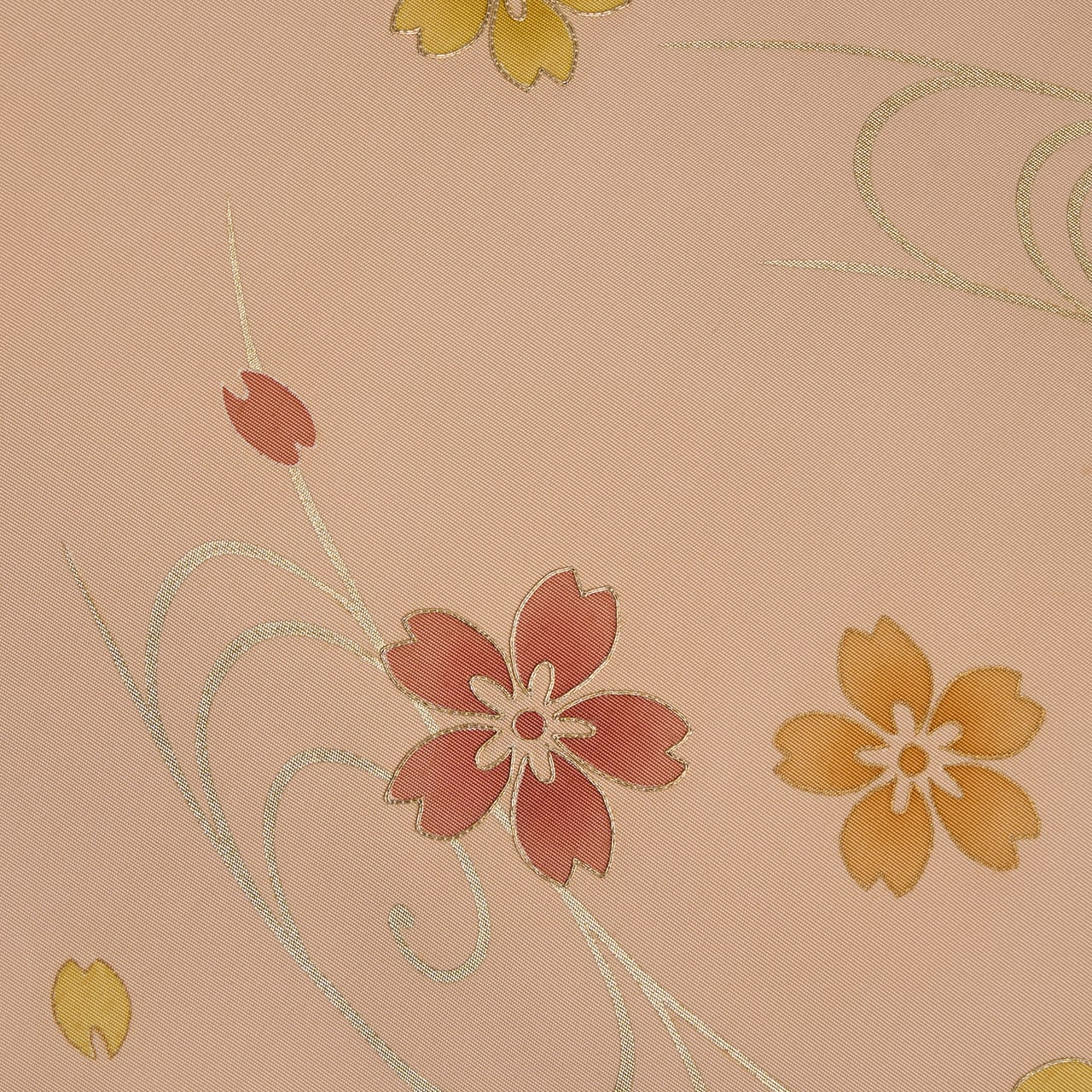 ベージュ味のある淡いピンク・水柿色のしなやかな塩瀬の生地に、お太鼓には観世水のような流水の線が金彩で描かれ、それを背景にして桜のお花と舞うように散らされた花びらが手描きの友禅で描かれ、部分的に手刺繍が施された、優雅な雰囲気の素敵な九寸名古屋帯です。