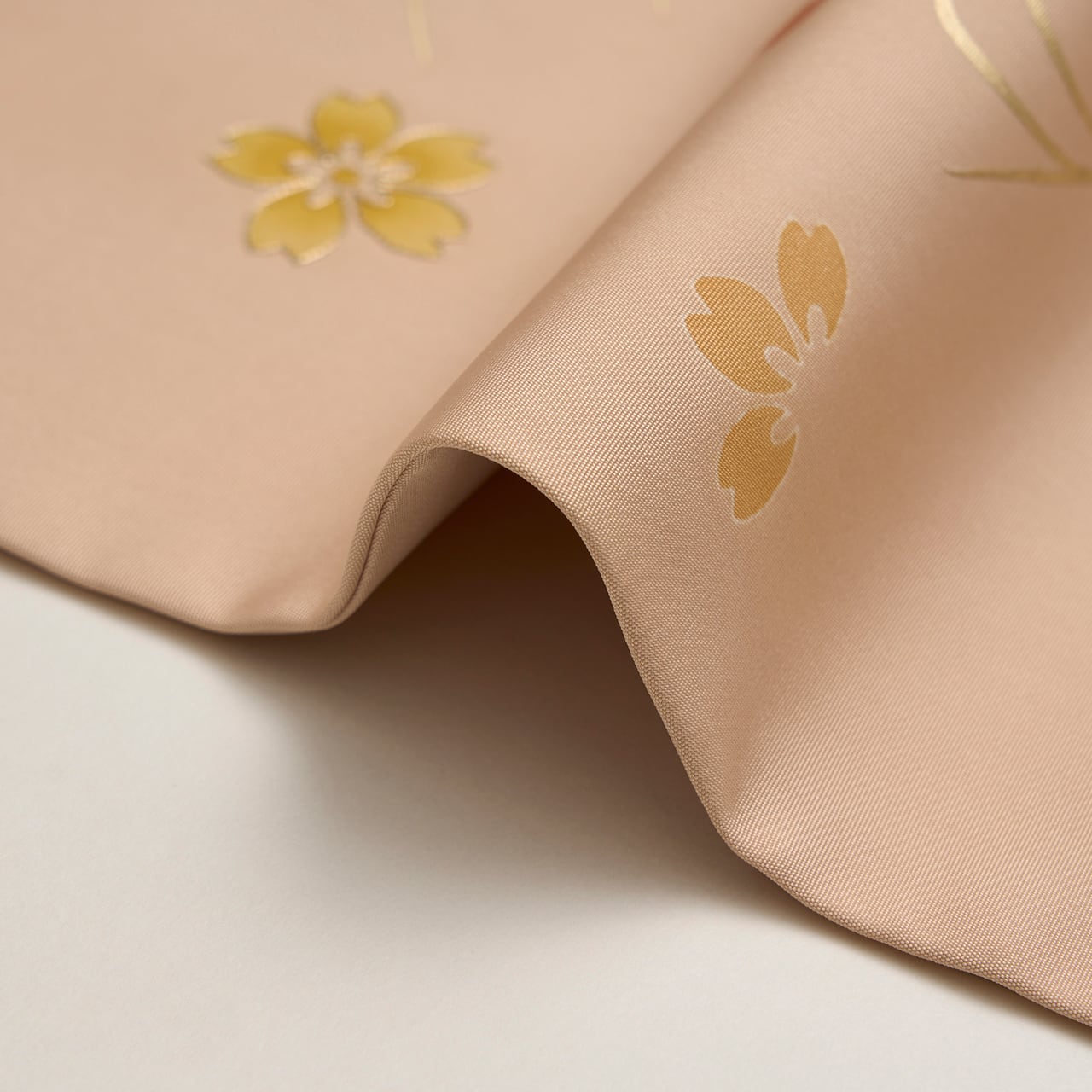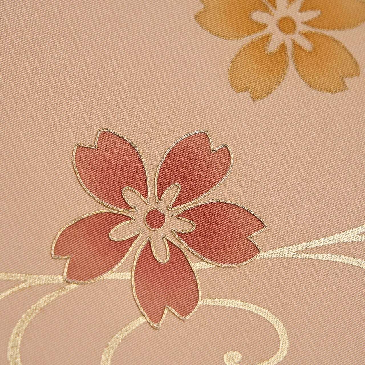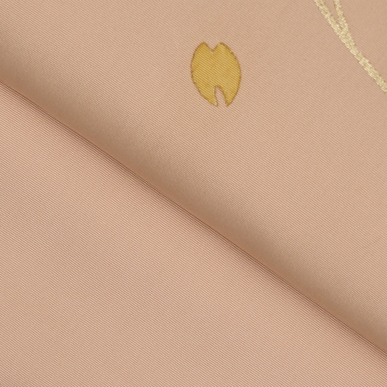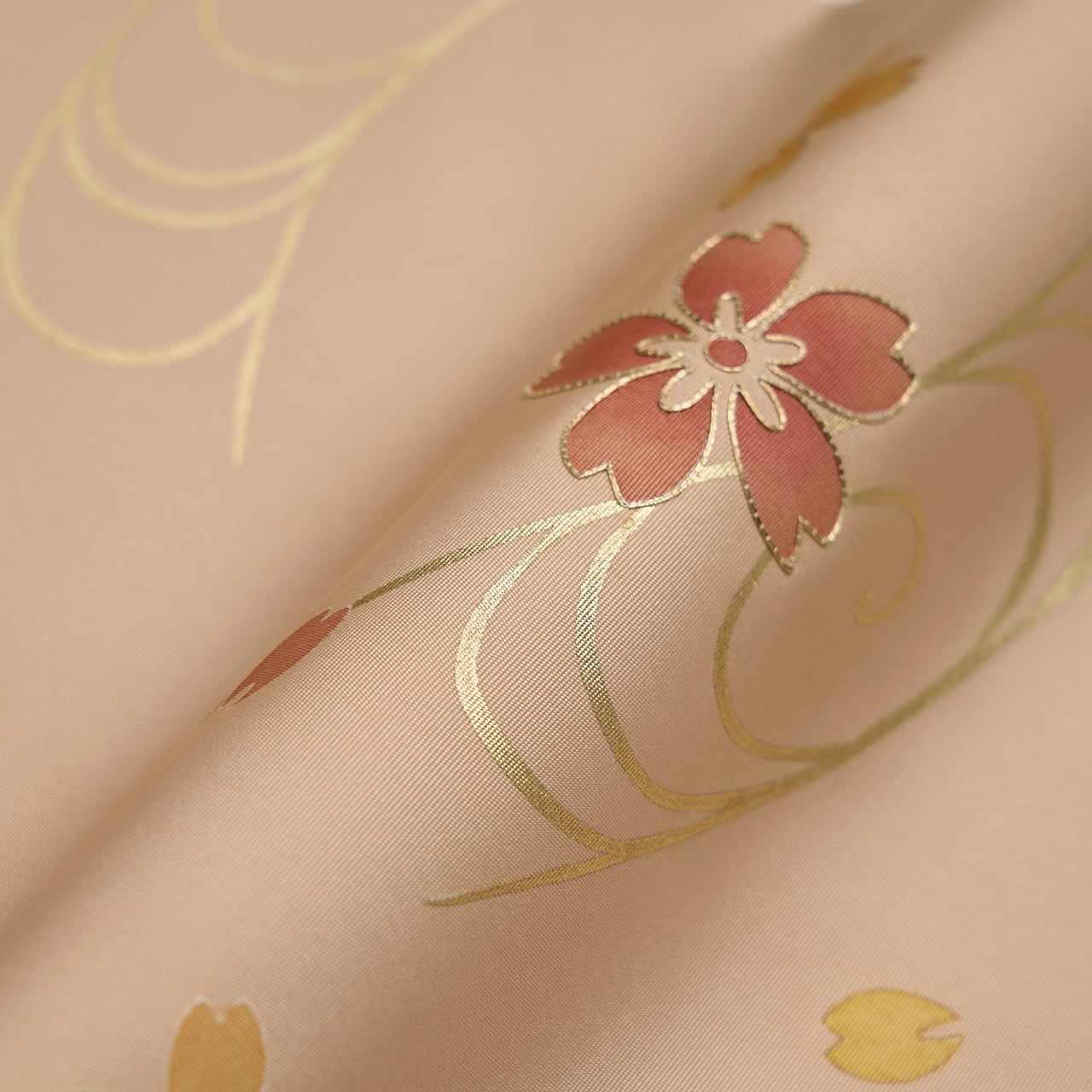 ベージュ味のある淡いピンク・水柿色のしなやかな塩瀬の生地に、お太鼓には観世水のような流水の線が金彩で描かれ、それを背景にして桜のお花と舞うように散らされた花びらが手描きの友禅で描かれ、部分的に手刺繍が施された、優雅な雰囲気の素敵な九寸名古屋帯です。