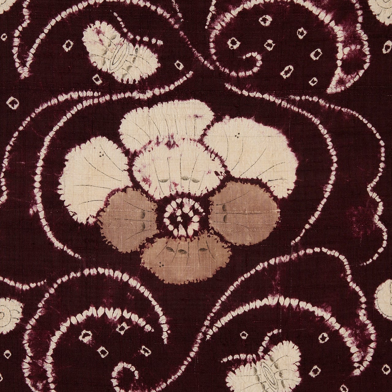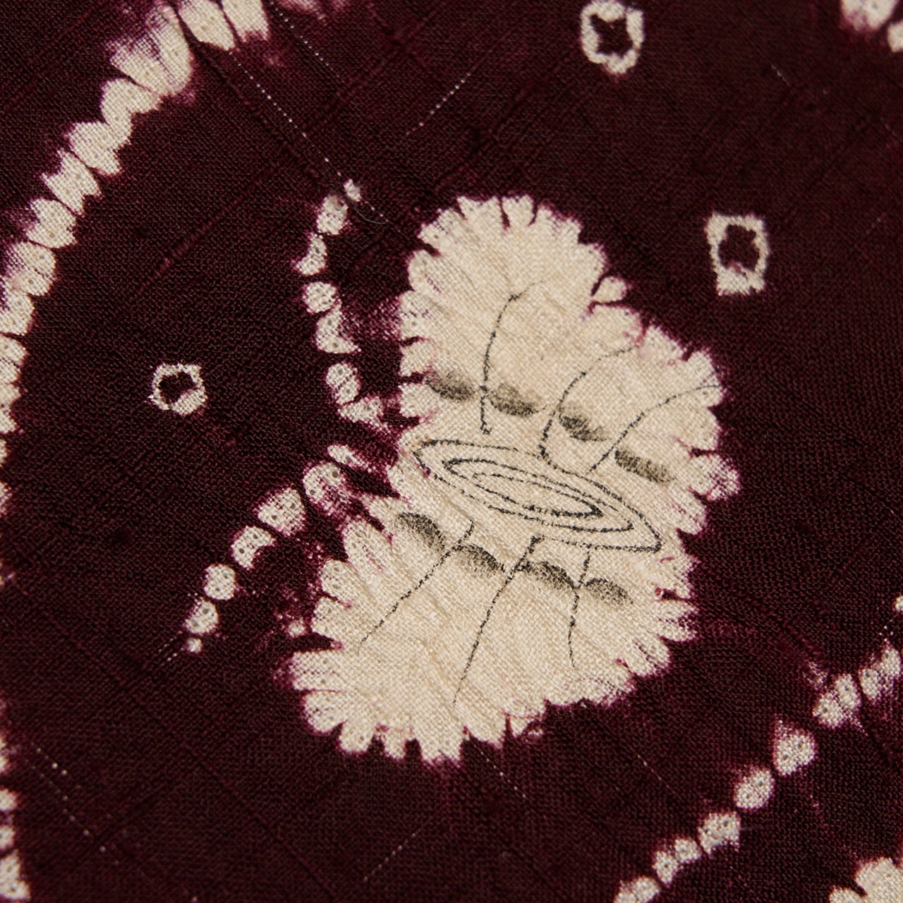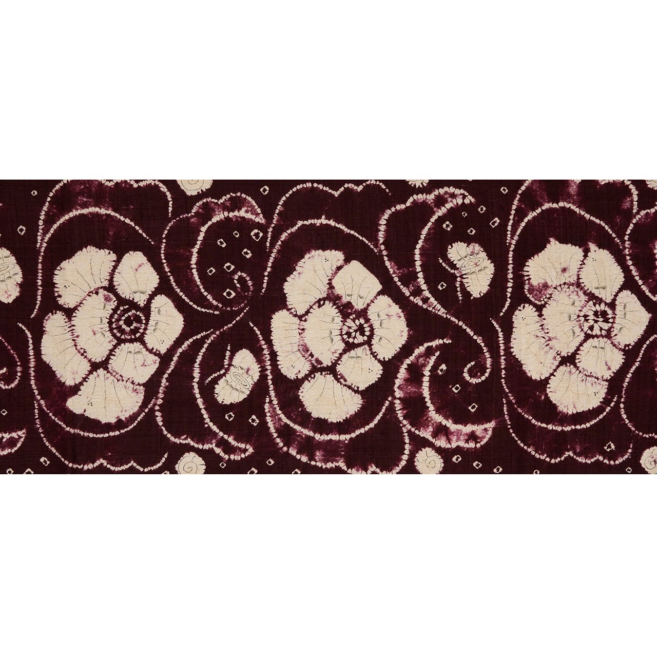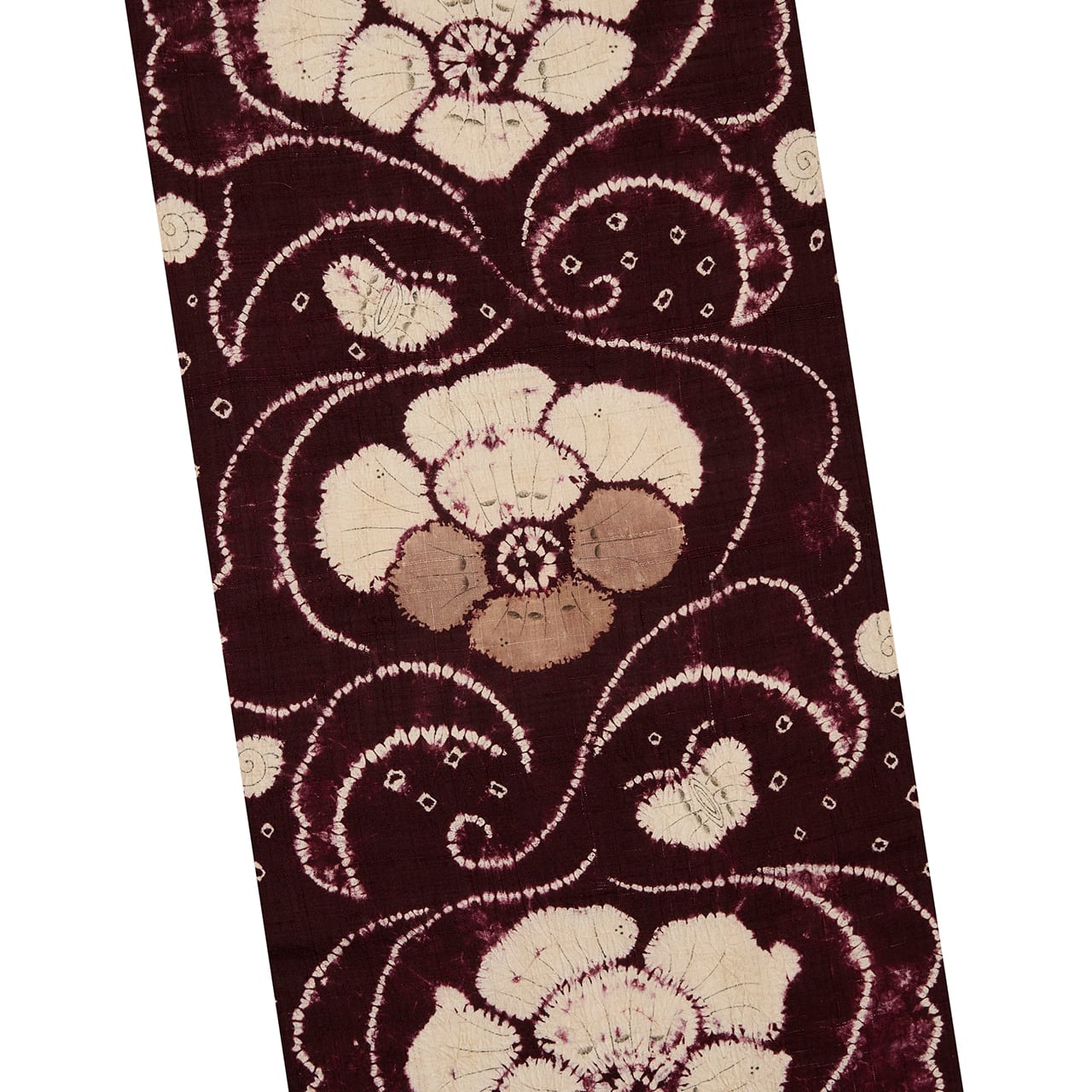 同じ図案が連続していますが、絞り染めで染められているために、偶発的な発色の違いやお花などの表情の違いが楽しく見られます。