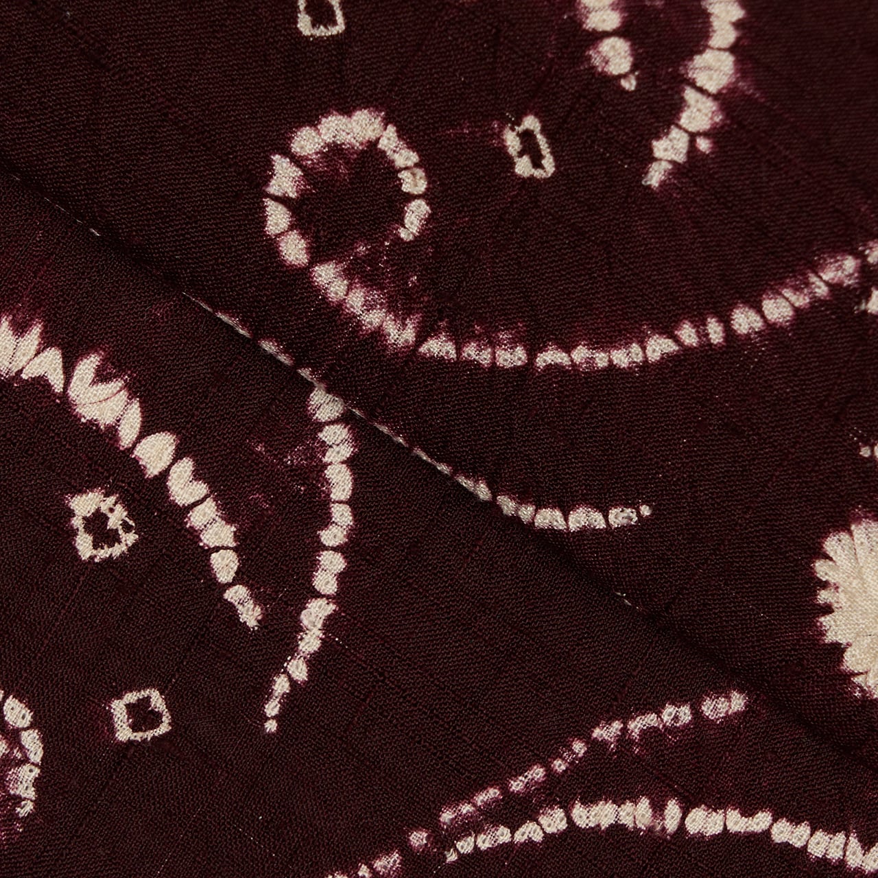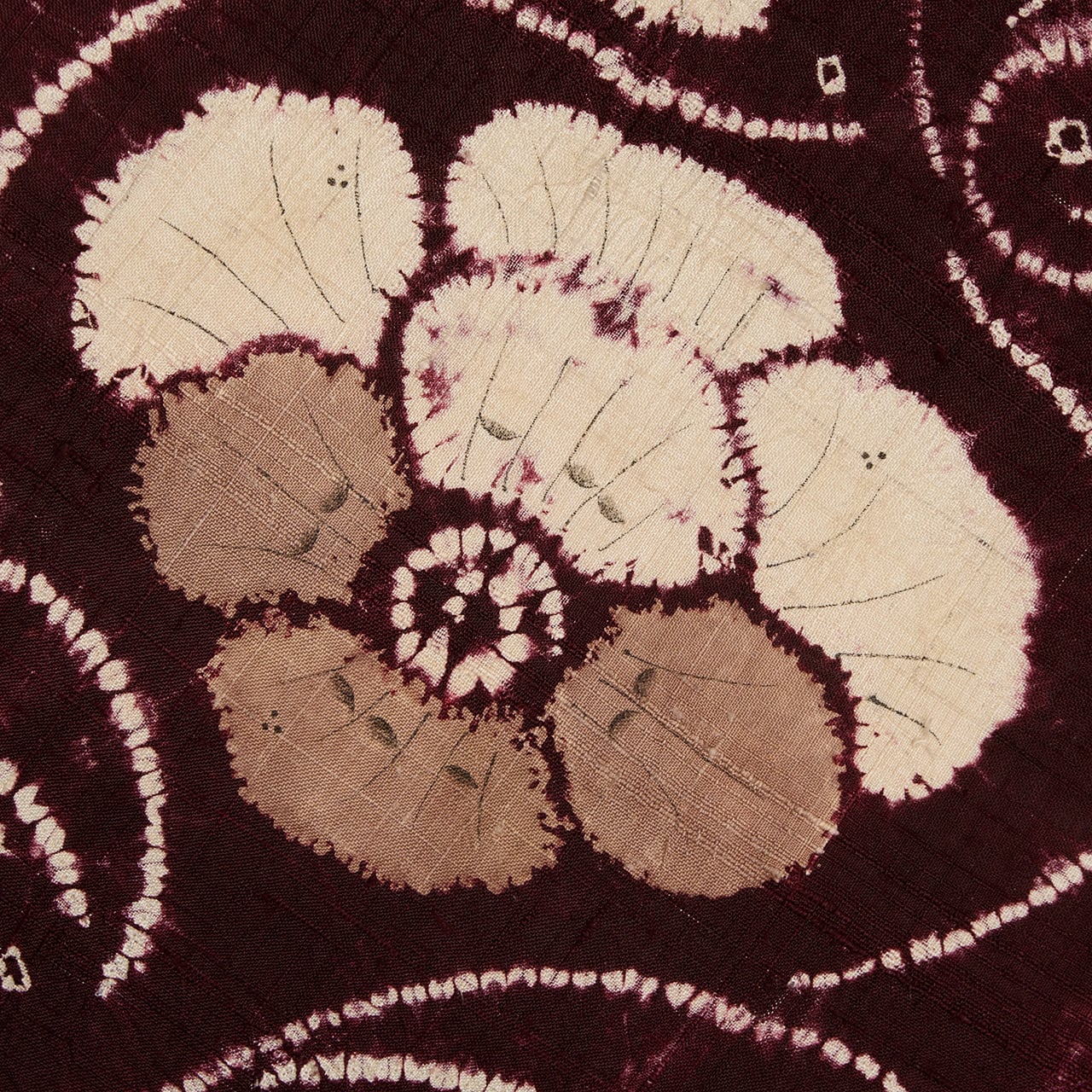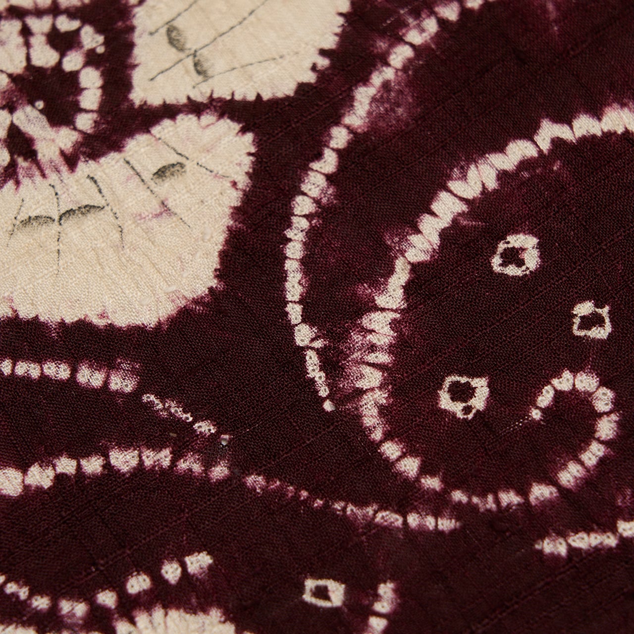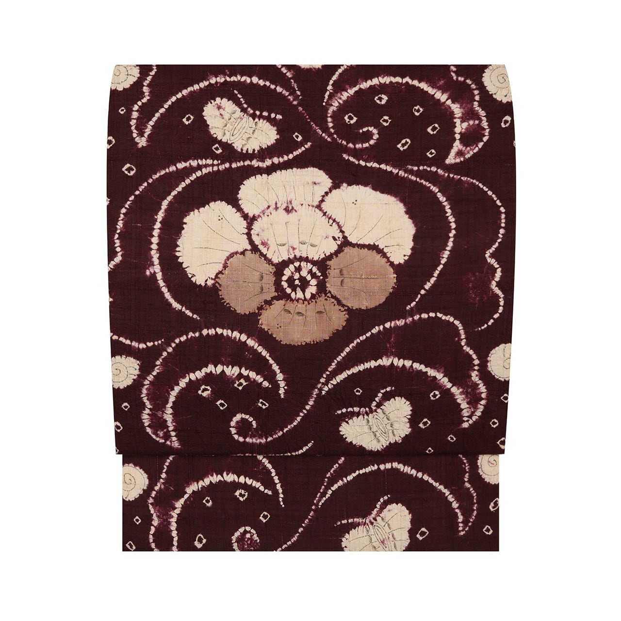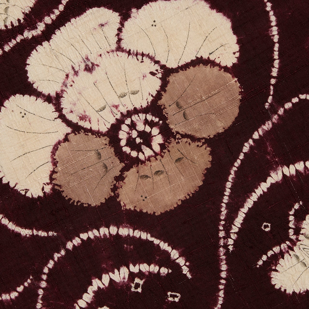 同じ図案が連続していますが、絞り染めで染められているために、偶発的な発色の違いやお花などの表情の違いが楽しく見られます。
