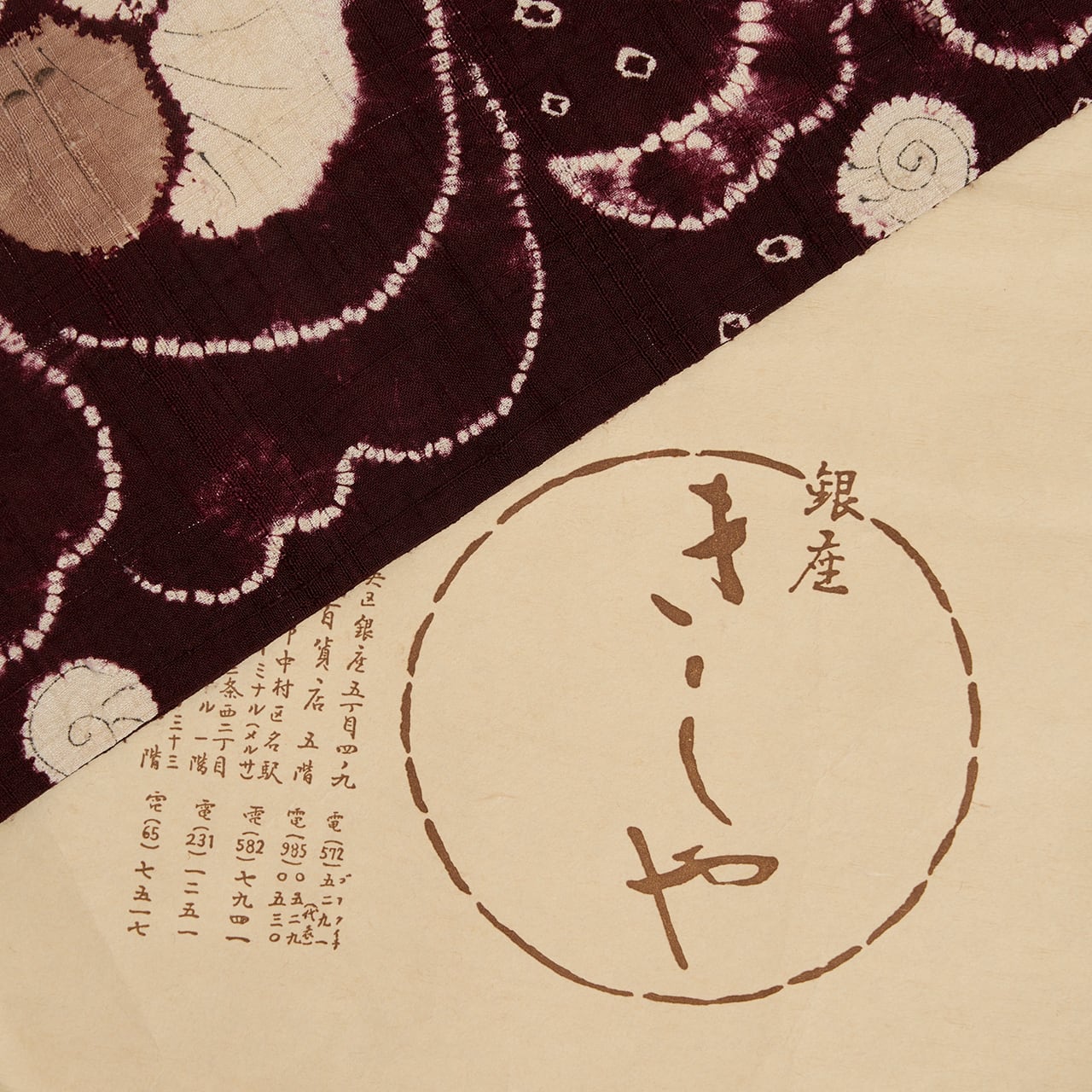 蝶々のまわりの水の玉のような小さな豆絞りが可愛らしく、そこにカタツムリのようなぐるぐる渦巻が置かれて、なんとなくメルヘンティックな雰囲気もあります。