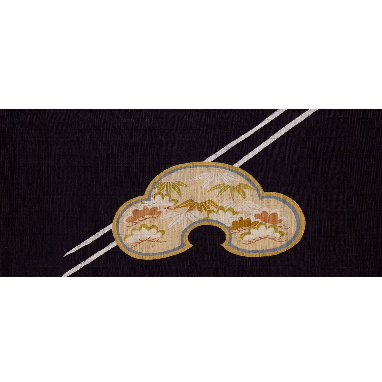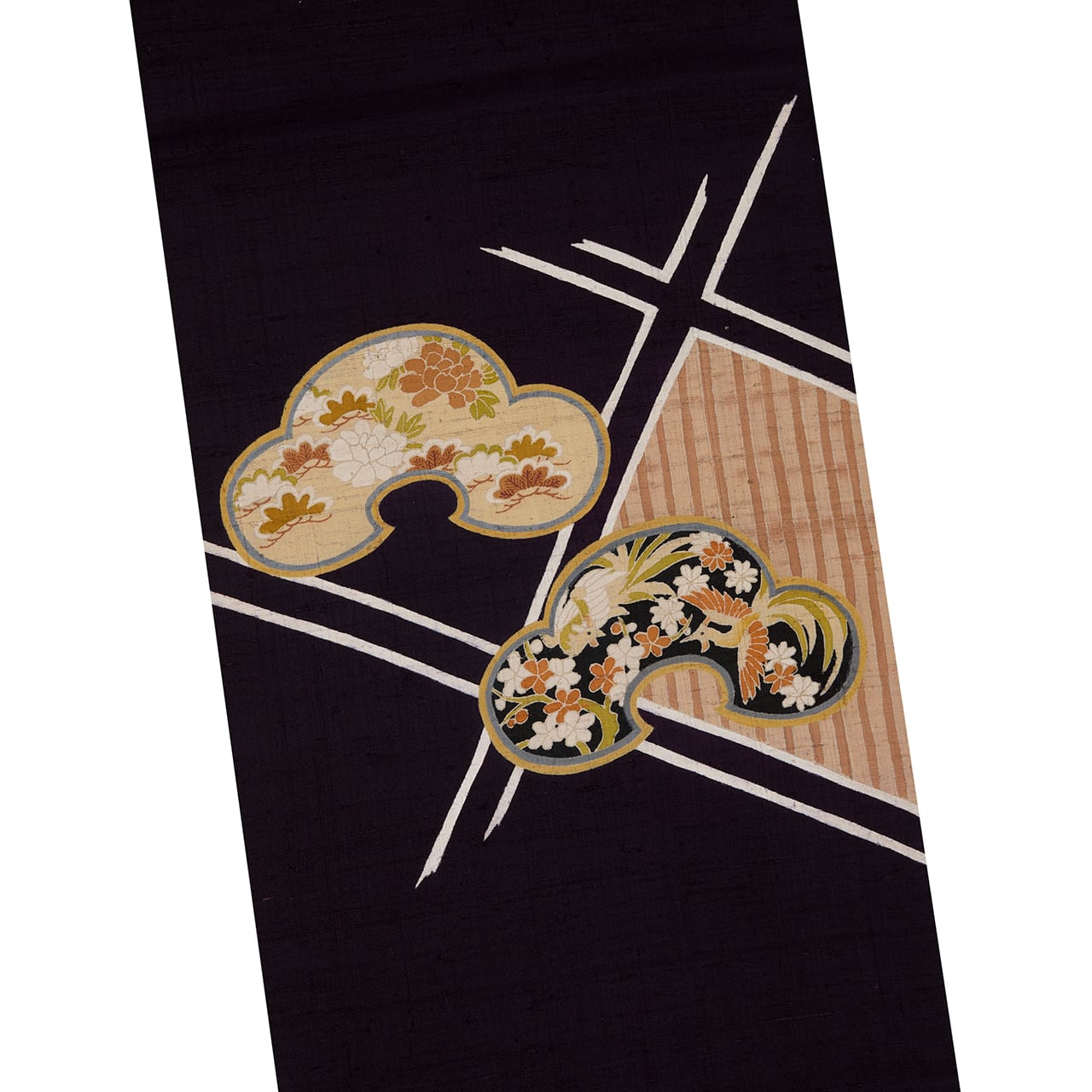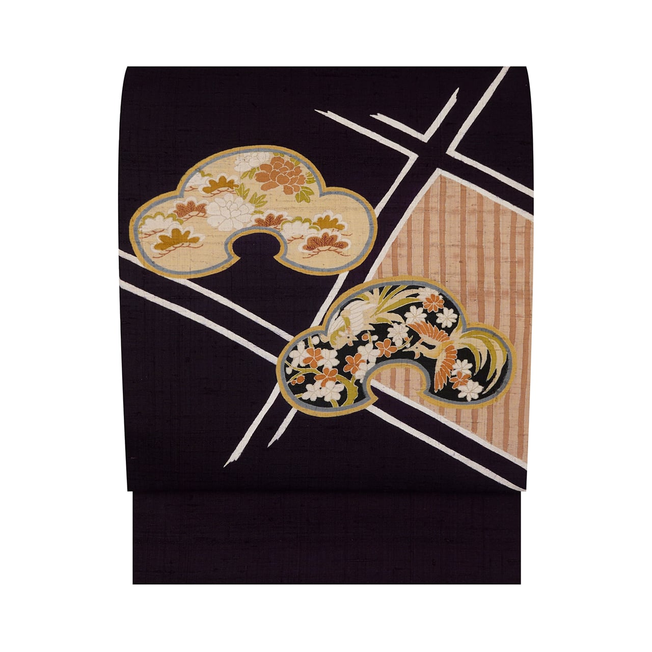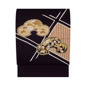 緯糸に節の見られるふんわりとした質感の座繰りの紬地が黒に染められ、お太鼓にはパキッとした印象の斜め格子が取られ、ひとつは明るいベージュ・赤香色と洗朱色の縞模様でうめられ、それを背景にしてたっぷりとし松の枝と、その中に牡丹や松、鳳凰と梅の木の模様が手描きの友禅で描かれ、どことなくめでたくきっぱりとした清々しさが感じられる、素敵な九寸名古屋帯です。