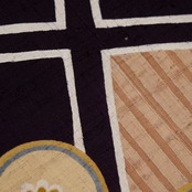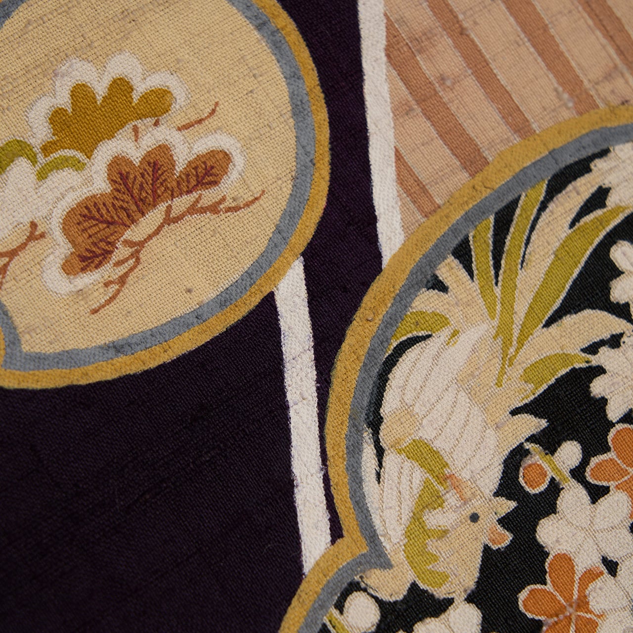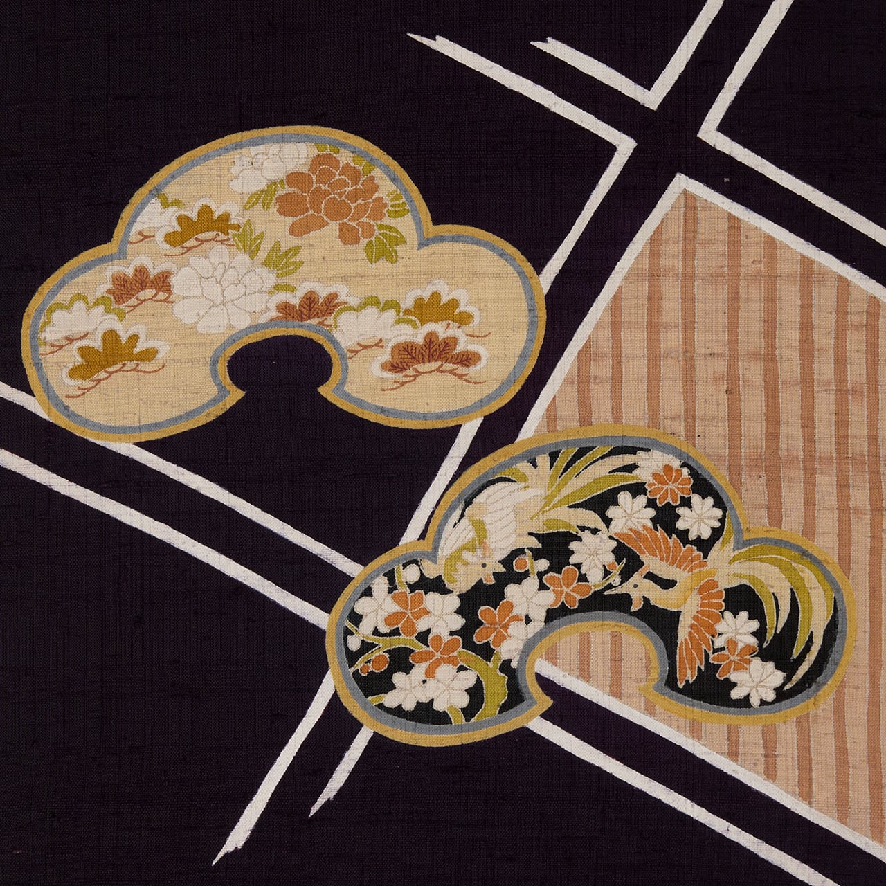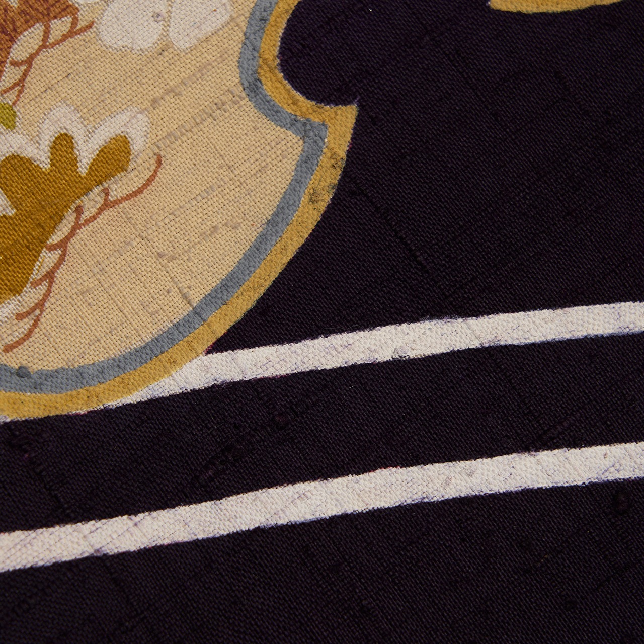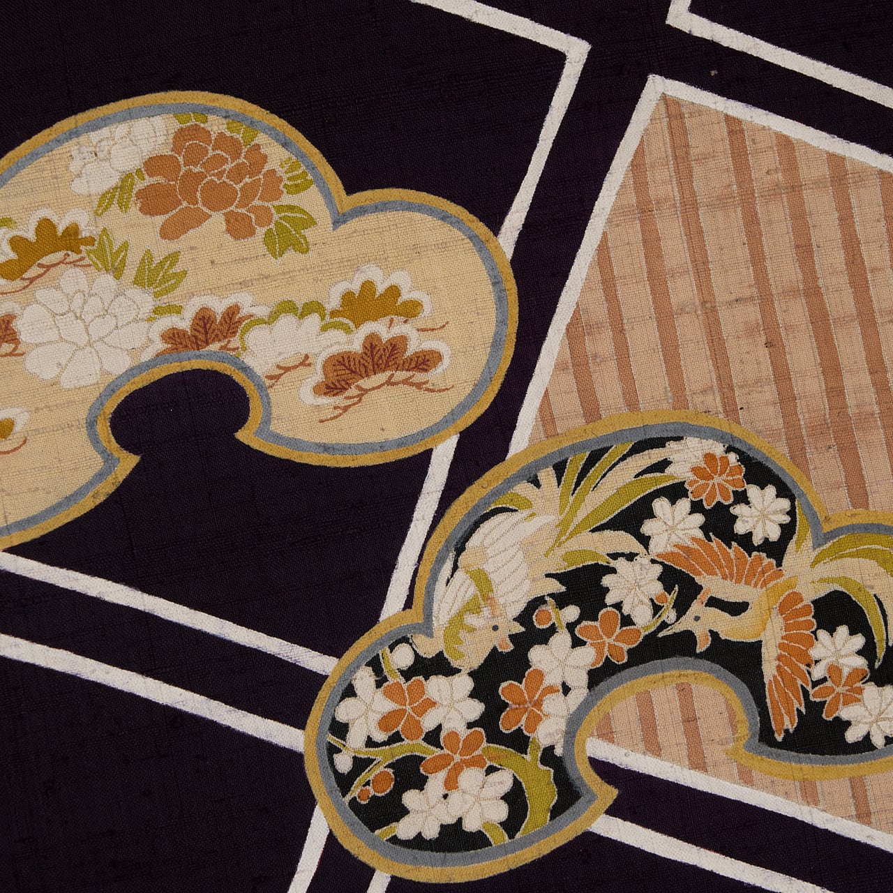 緯糸に節の見られるふんわりとした質感の座繰りの紬地が黒に染められ、お太鼓にはパキッとした印象の斜め格子が取られ、ひとつは明るいベージュ・赤香色と洗朱色の縞模様でうめられ、それを背景にしてたっぷりとし松の枝と、その中に牡丹や松、鳳凰と梅の木の模様が手描きの友禅で描かれ、どことなくめでたくきっぱりとした清々しさが感じられる、素敵な九寸名古屋帯です。