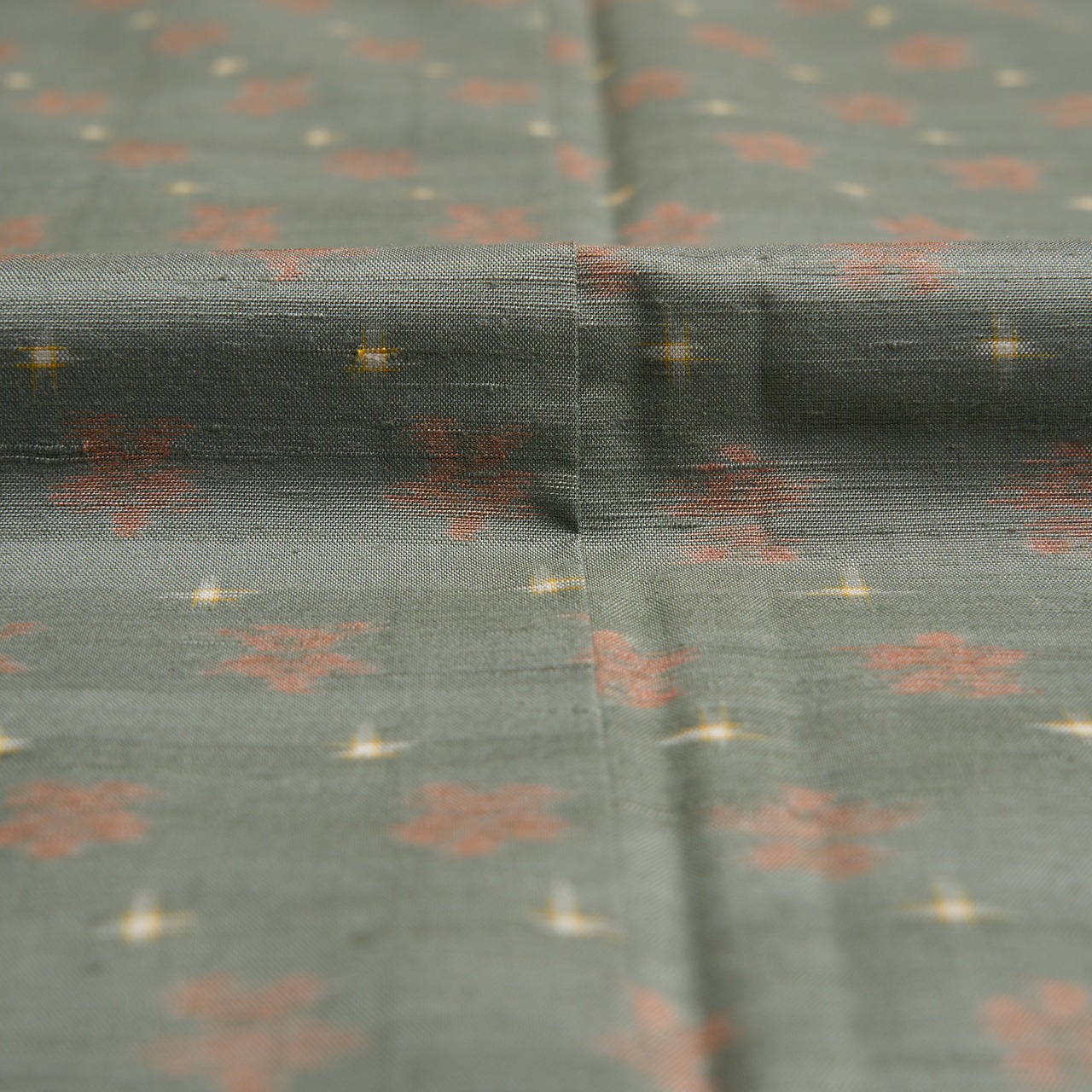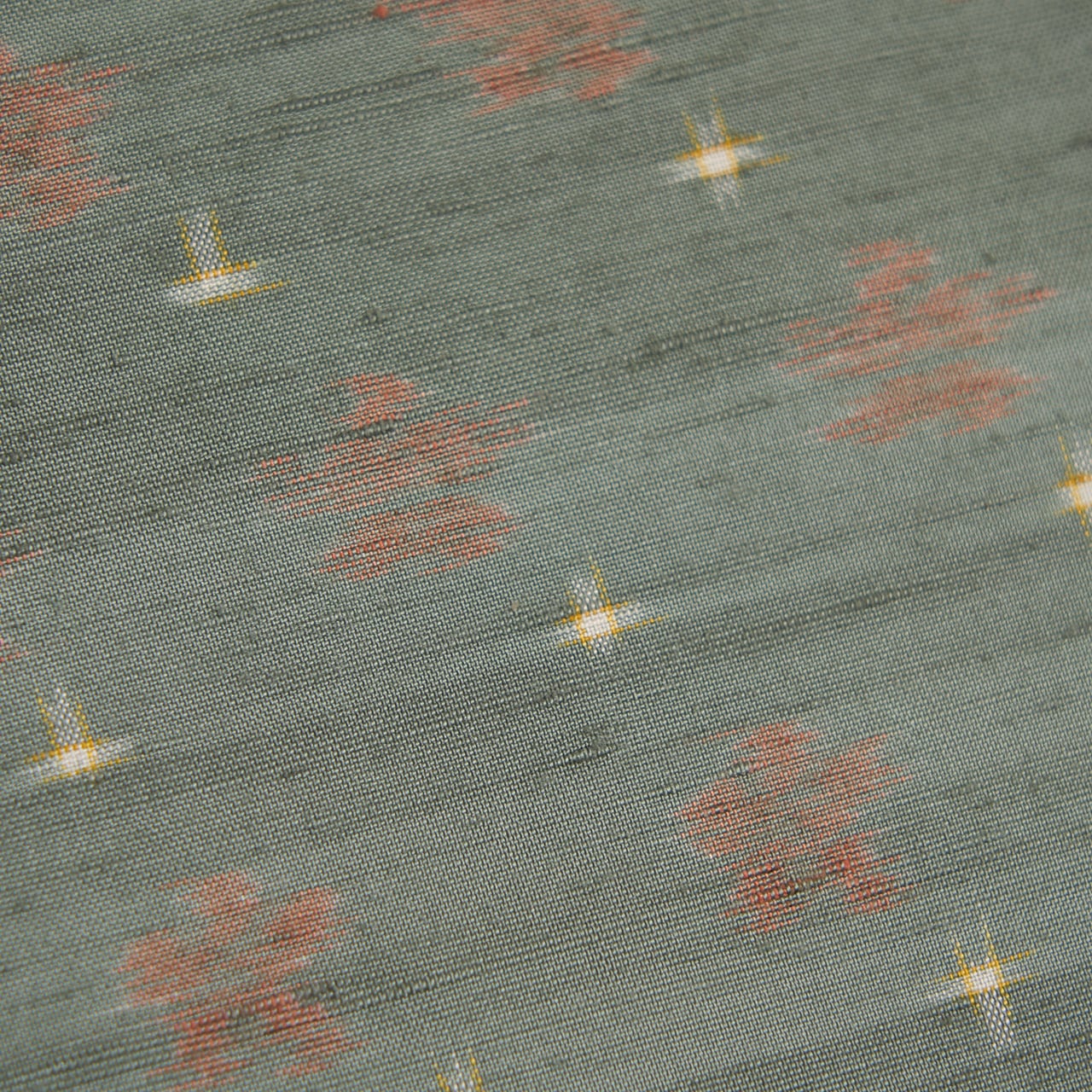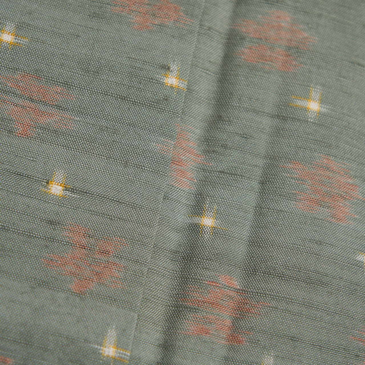 こちらのお花の絣も十字絣も、手括りならではの絣足の表情が楽しく感じられ、草木染ではないかと思われる発色となっていて、柔らかい色調がとても優しく目に映ります。