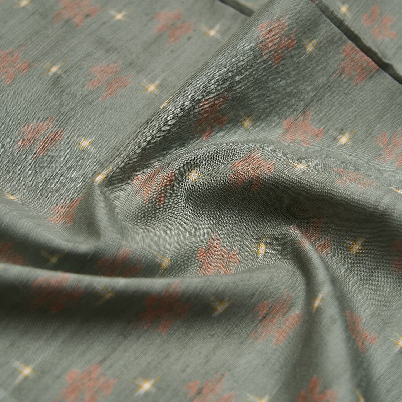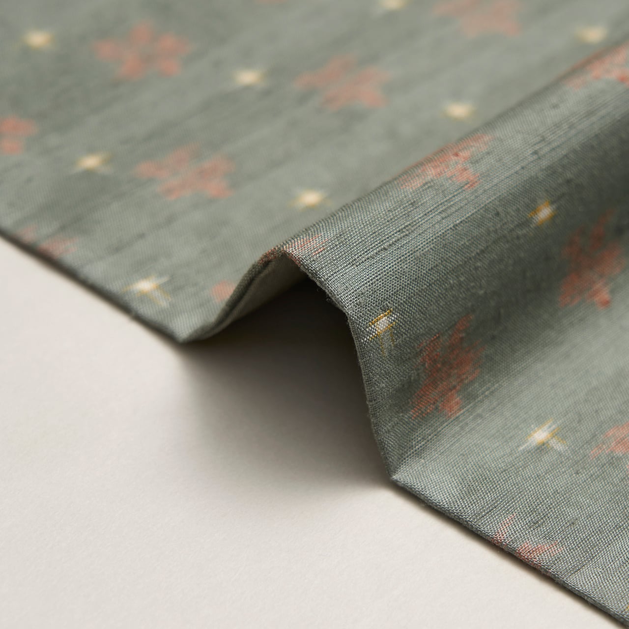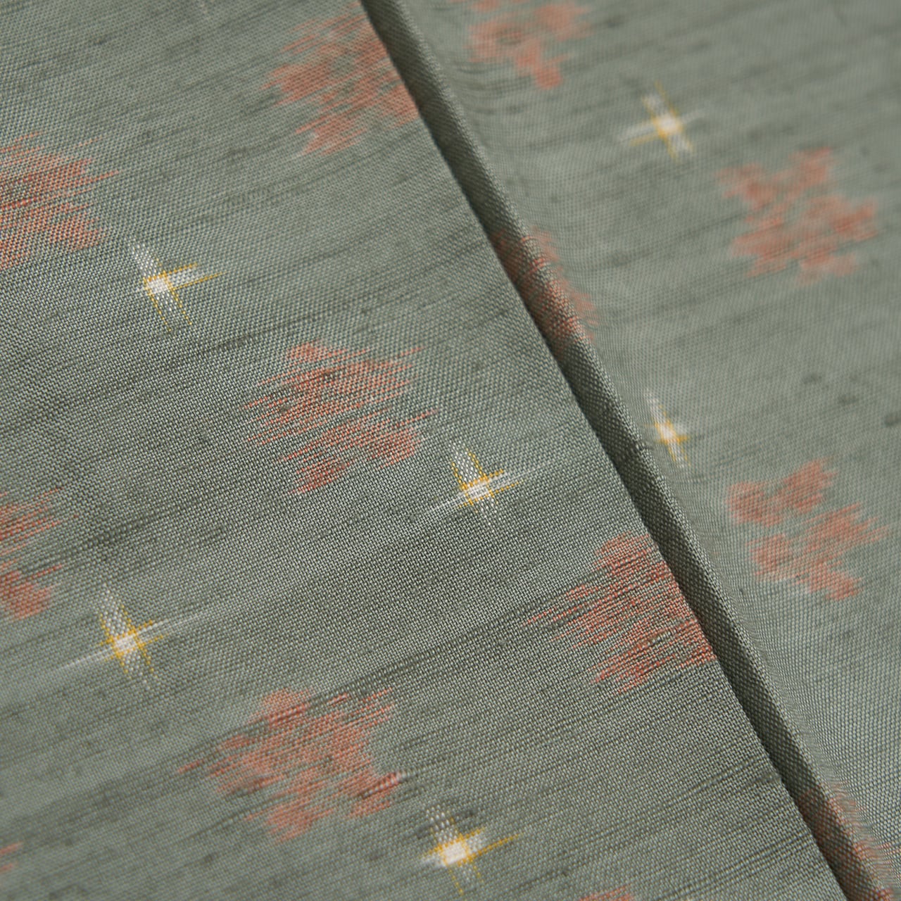 こちらのお花の絣も十字絣も、手括りならではの絣足の表情が楽しく感じられ、草木染ではないかと思われる発色となっていて、柔らかい色調がとても優しく目に映ります。