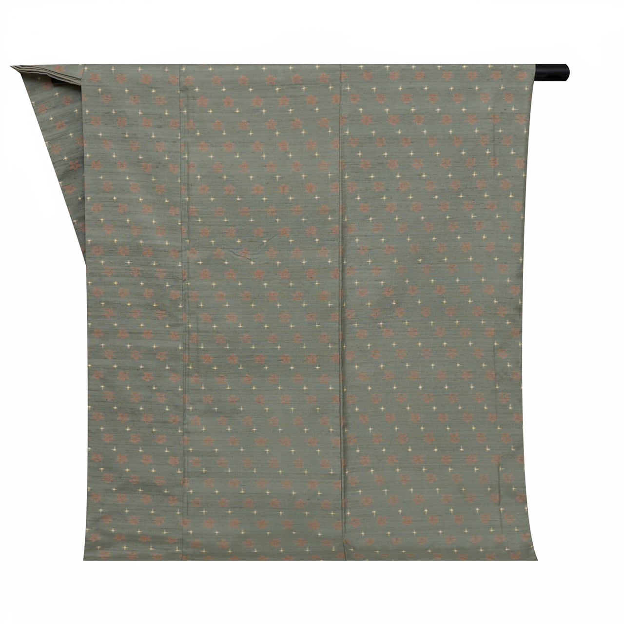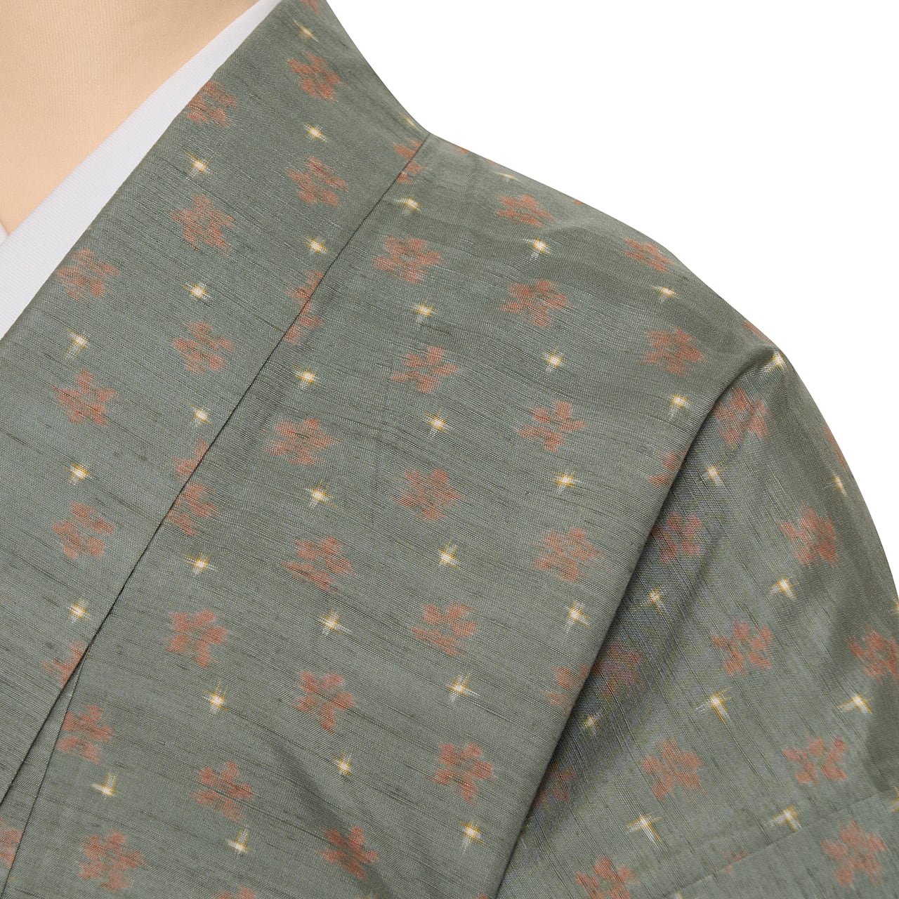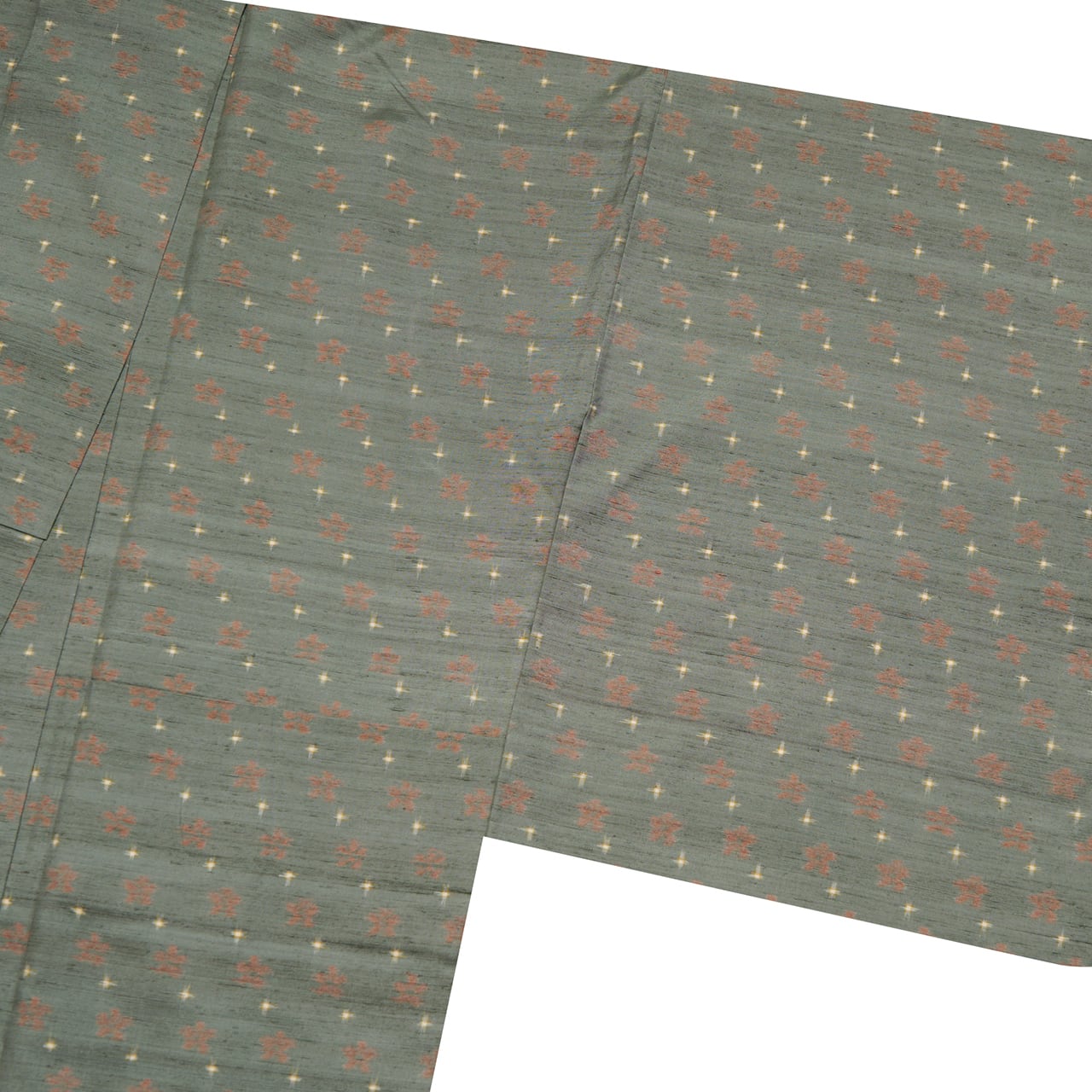 緯糸に変化のある節がたくさん見られる座繰りの糸の味わいがとても魅力的なグレー味のある薄緑・青鈍色の地に、段変わりに洗朱色の小さなお花と、象牙色の十字絣が織り込まれた、とてもお洒落な雰囲気の十日町産と思われる紬のお着物です。