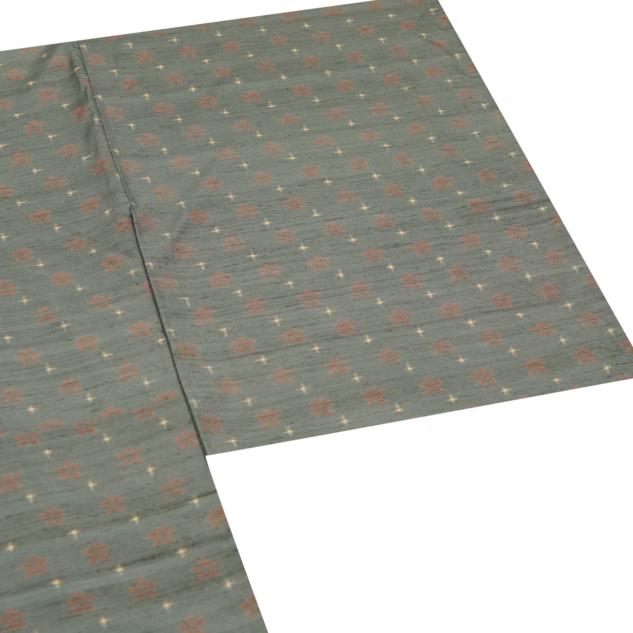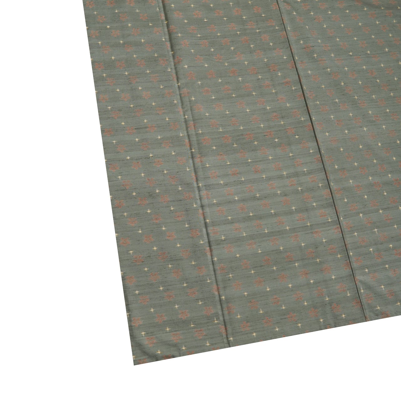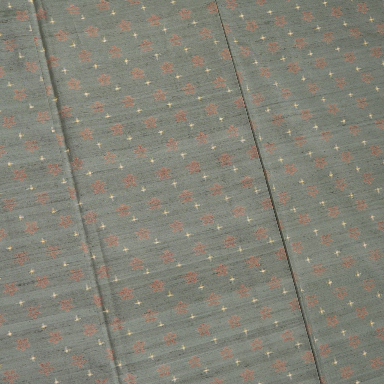 緯糸に変化のある節がたくさん見られる座繰りの糸の味わいがとても魅力的なグレー味のある薄緑・青鈍色の地に、段変わりに洗朱色の小さなお花と、象牙色の十字絣が織り込まれた、とてもお洒落な雰囲気の十日町産と思われる紬のお着物です。