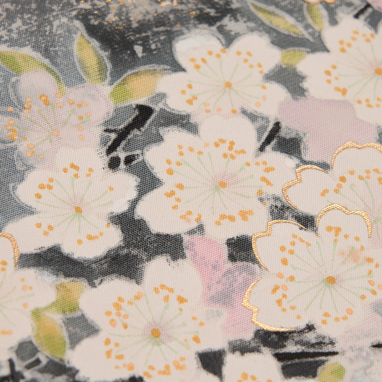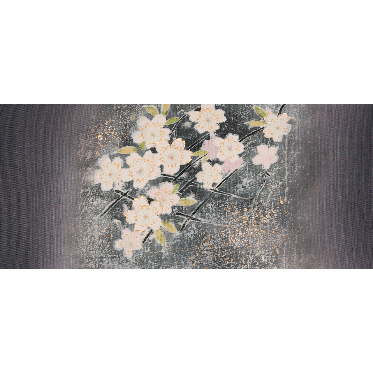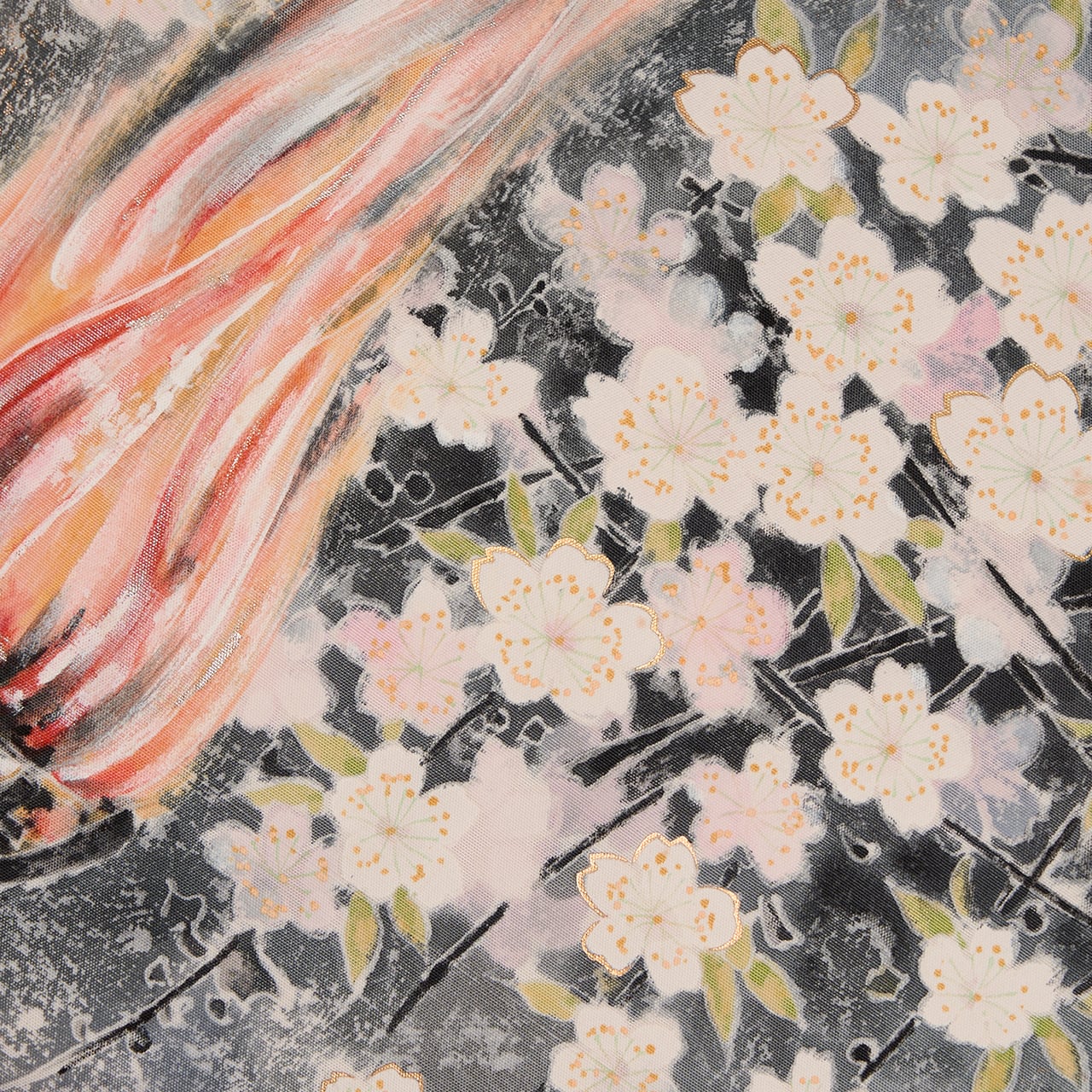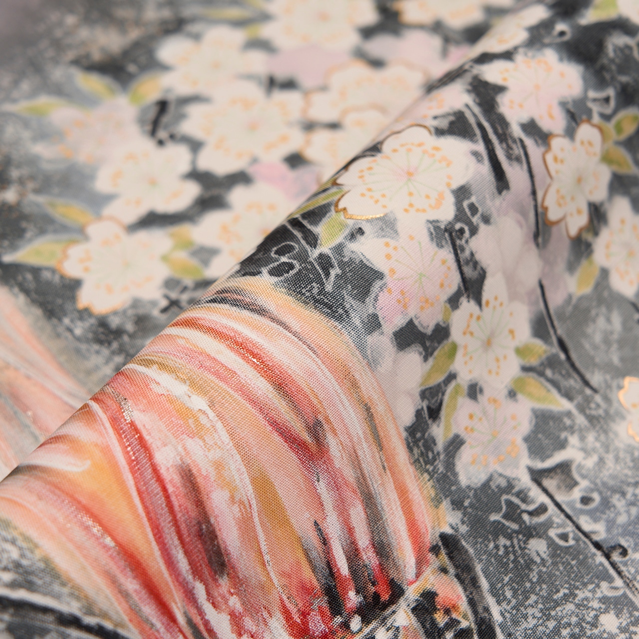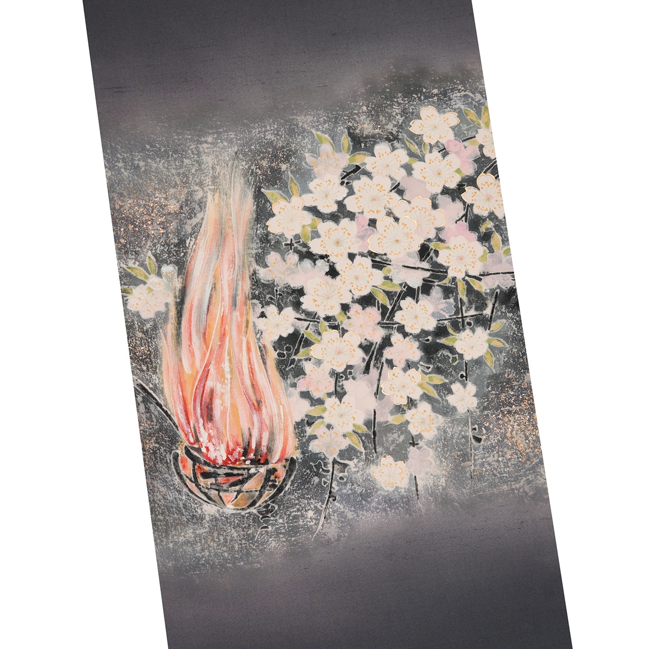 手描きの友禅で描かれていますが、桜の花びらの胡粉の彩色や篝火の部分などには手描きのようなタッチの加工が施されていて、臨場感あふれるものとなっています。