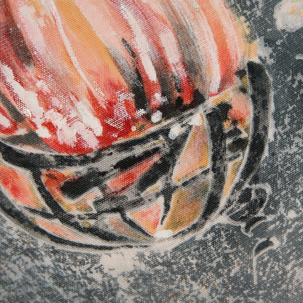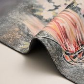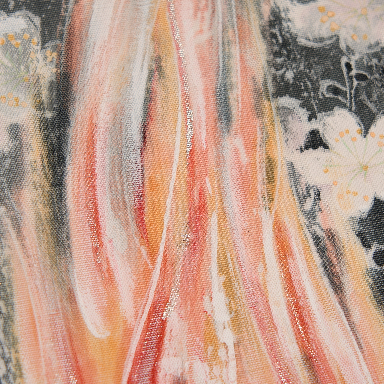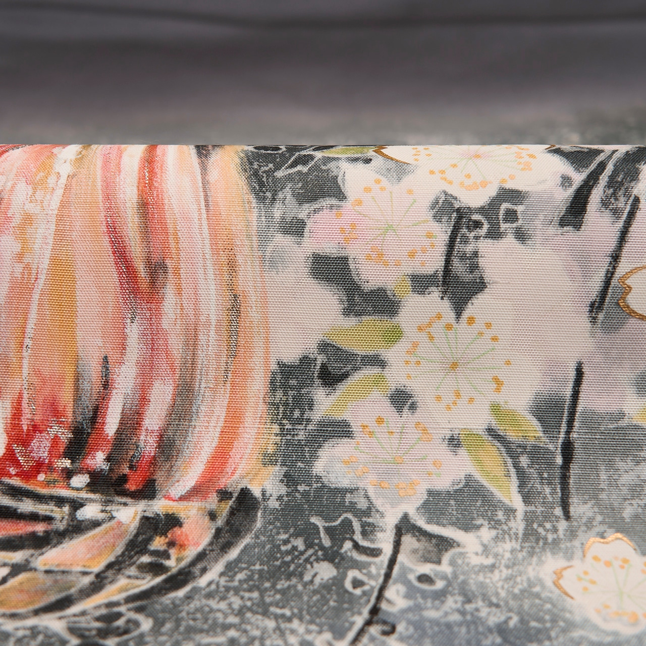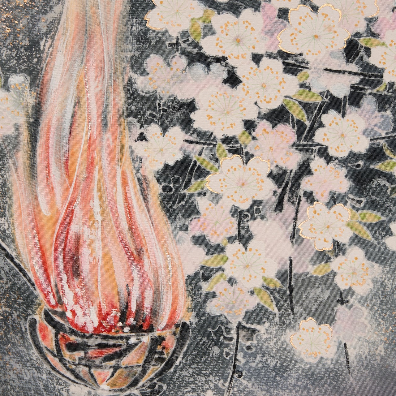 手描きの友禅で描かれていますが、桜の花びらの胡粉の彩色や篝火の部分などには手描きのようなタッチの加工が施されていて、臨場感あふれるものとなっています。