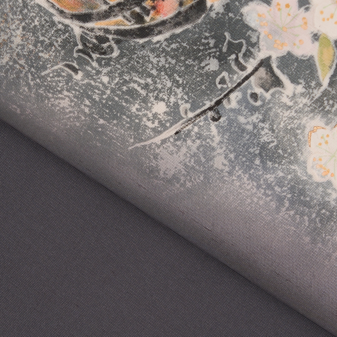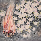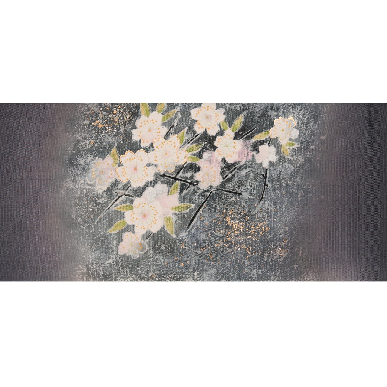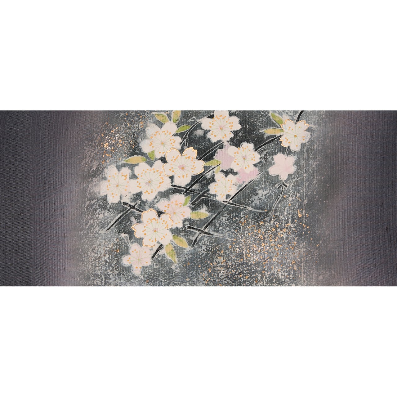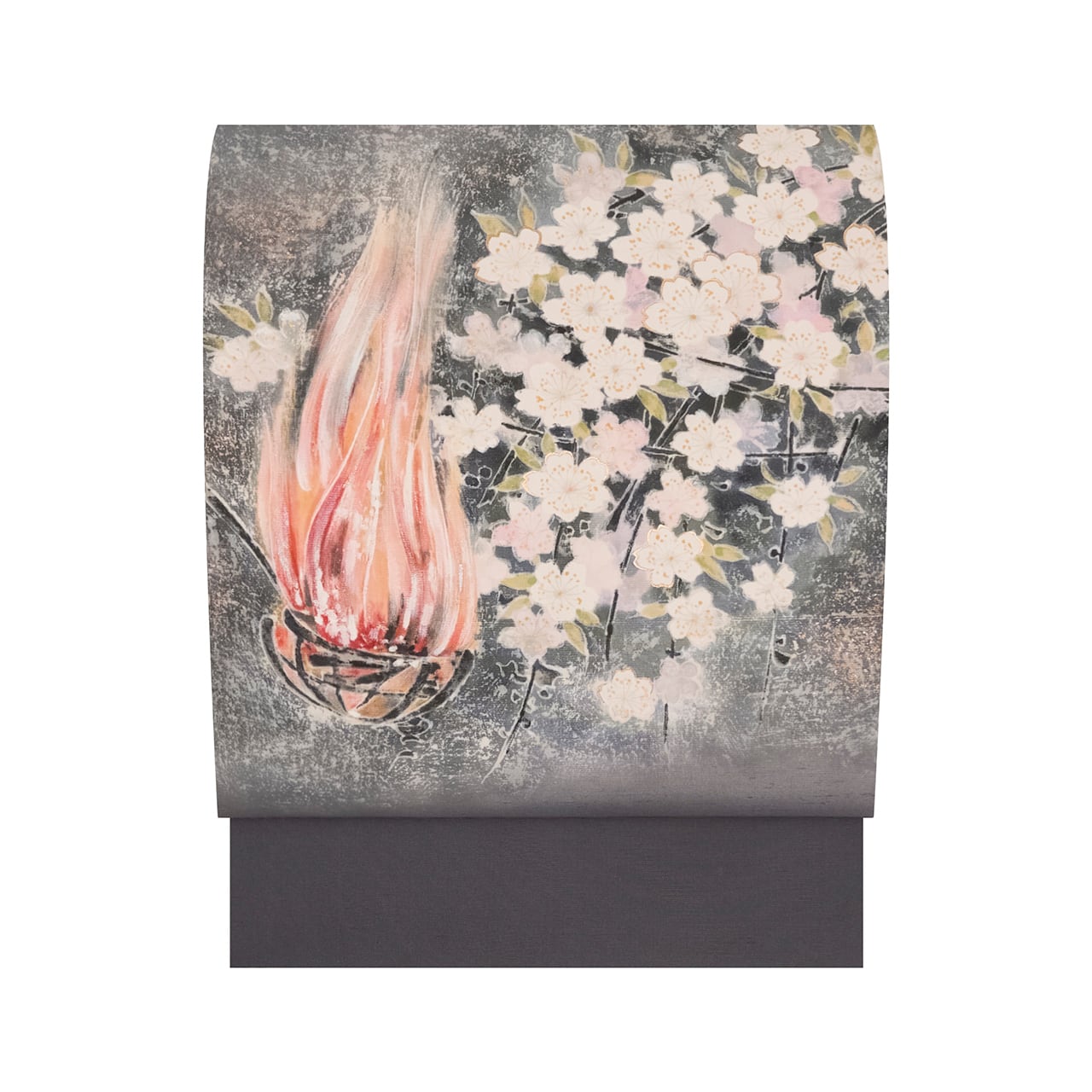 少しだけ紫味のあるグレー・藤煤竹色のしっかりとした白山紬のような生地に、お太鼓には蝋散らしのような加工で淡いグレー・鈍色が染められ、それを背景にして満開に咲く桜のお花がたっぷりと描かれ、その傍らには篝火がたかれた幻想的な風景を表した、素敵な九寸名古屋帯です。
