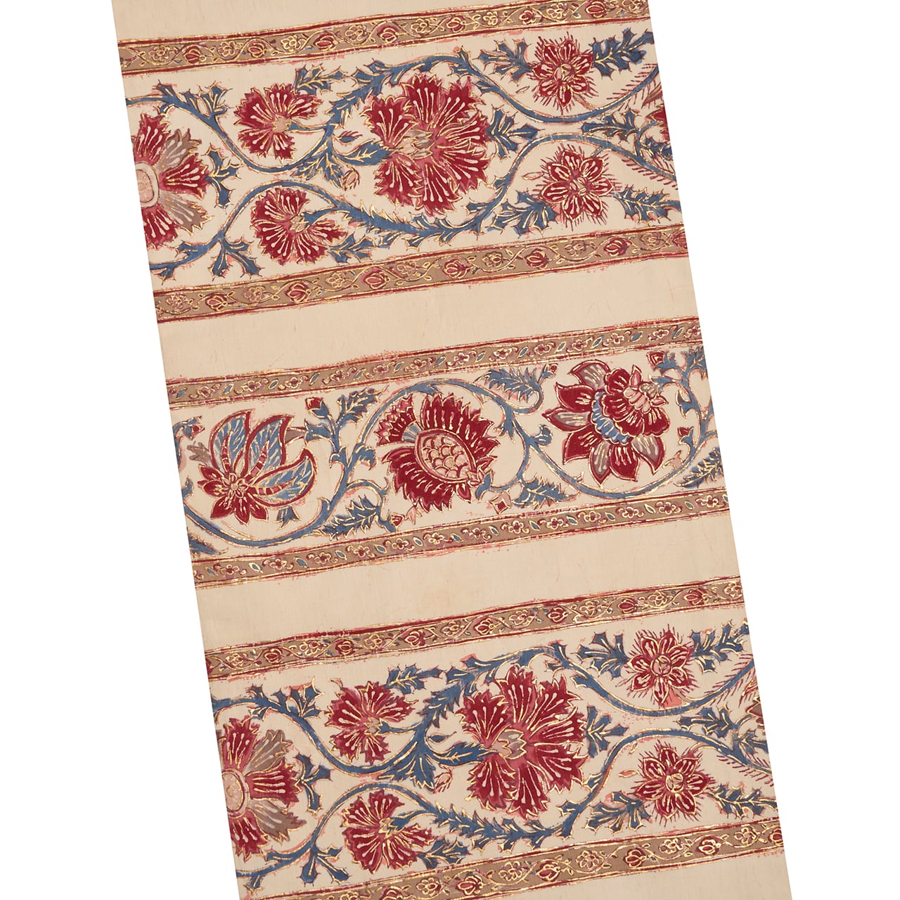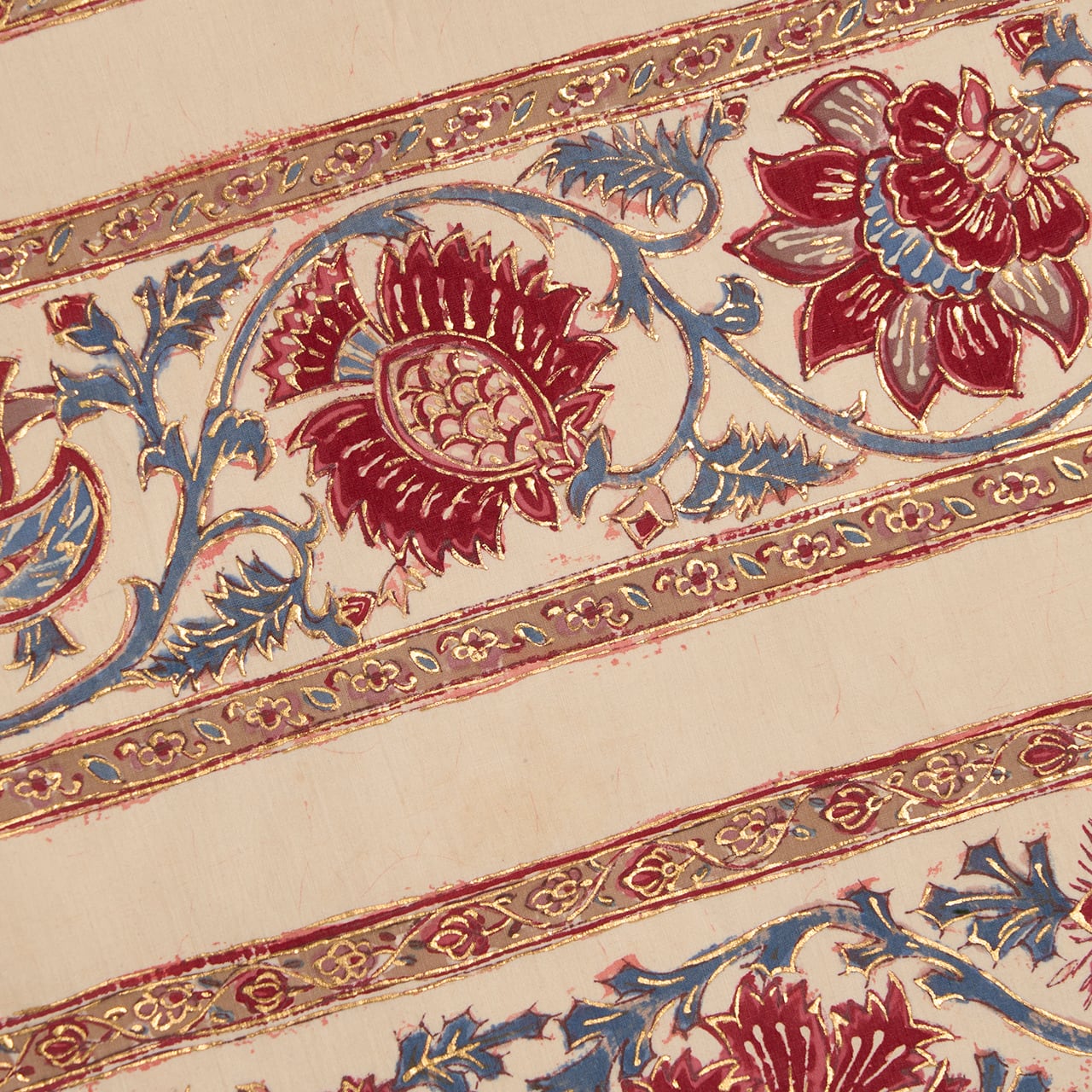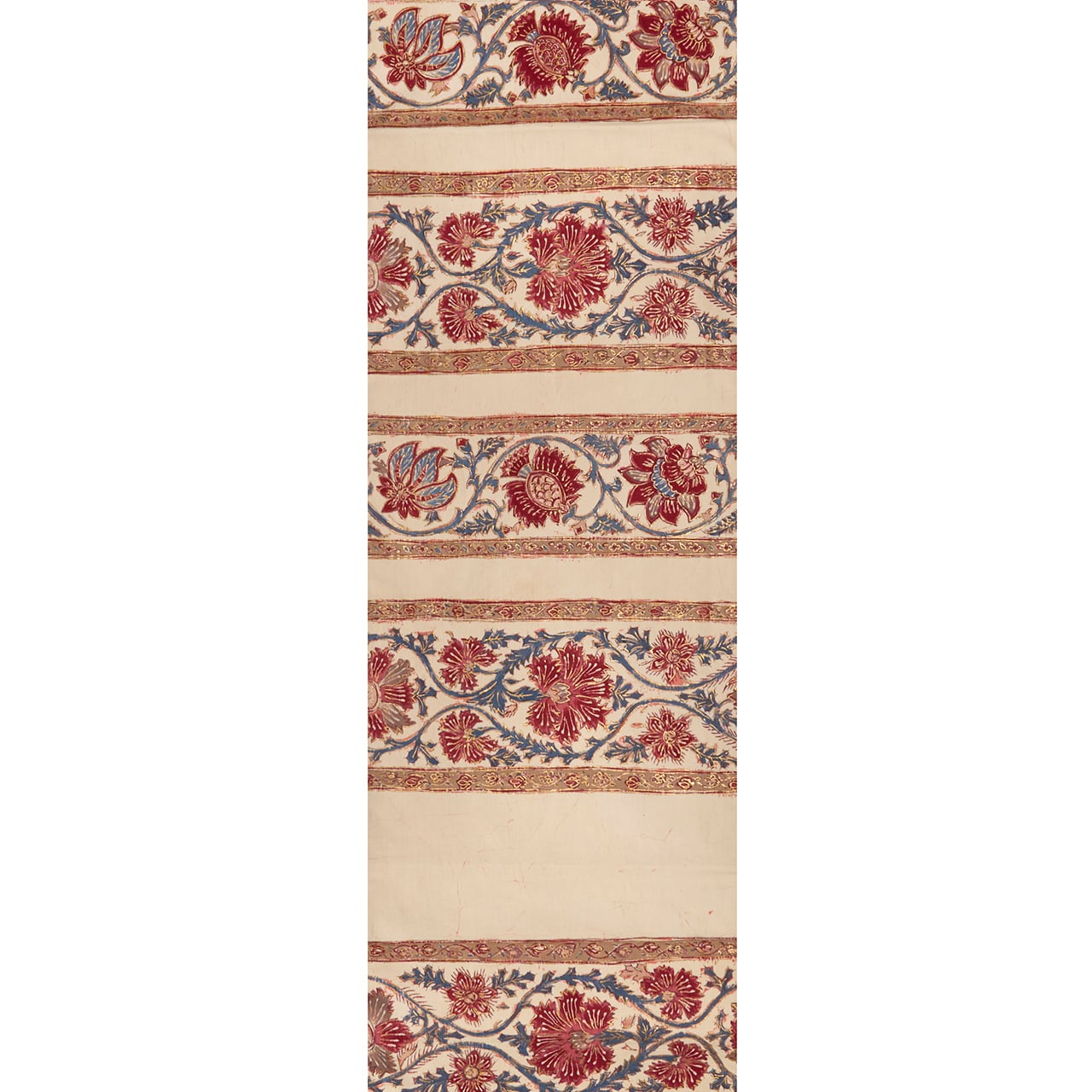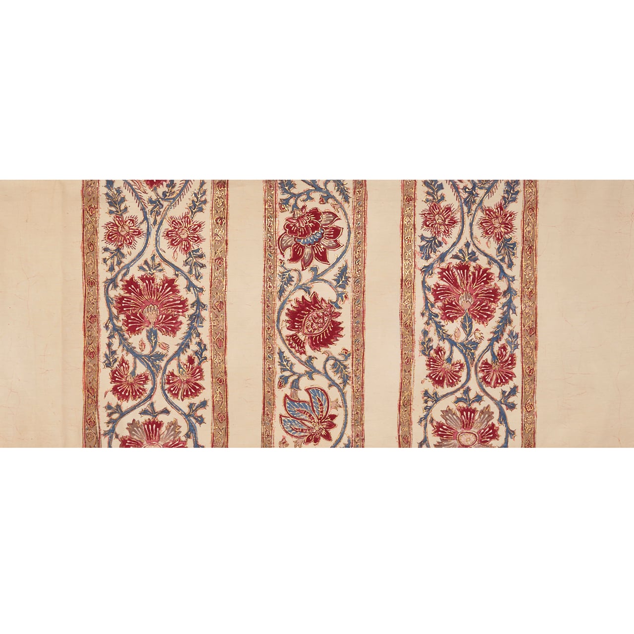 象牙色のとても細い糸で織られたさらりとした木綿の生地に、段変わりに唐花の模様が本格的なバティックの技法で染められ、まわりを金で縁取りをされた、とても華やかな雰囲気の素敵な袋なごや帯です。