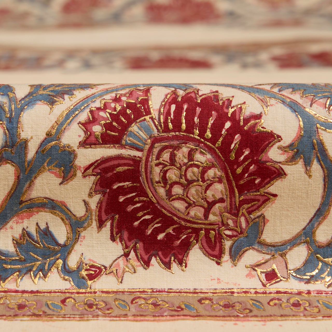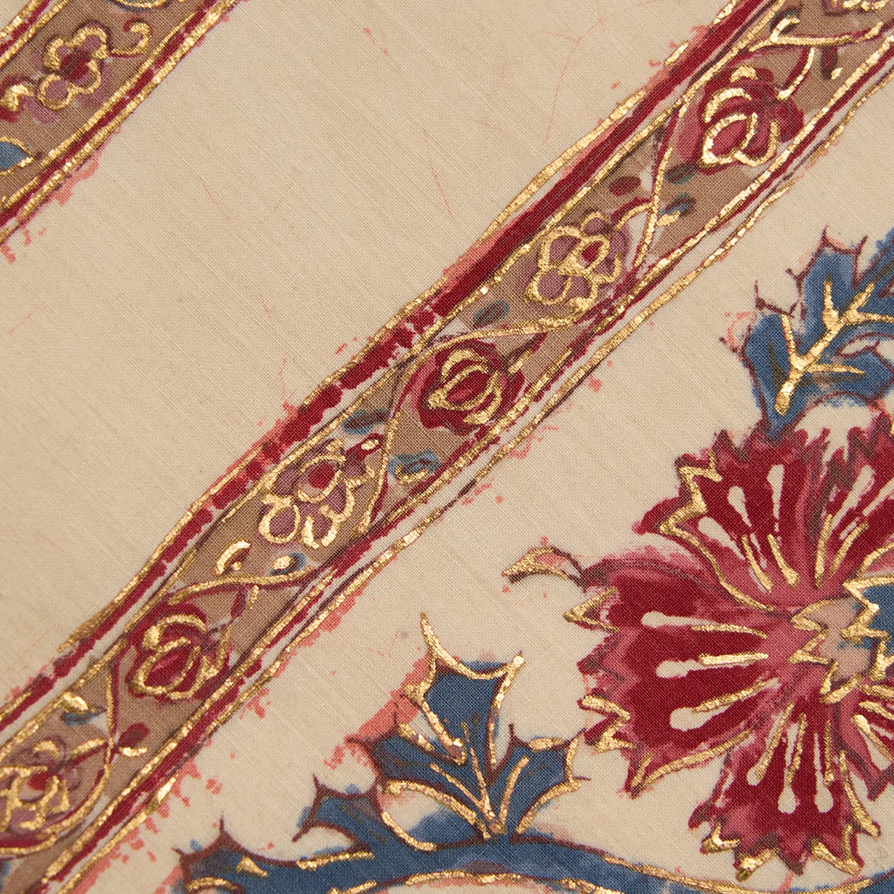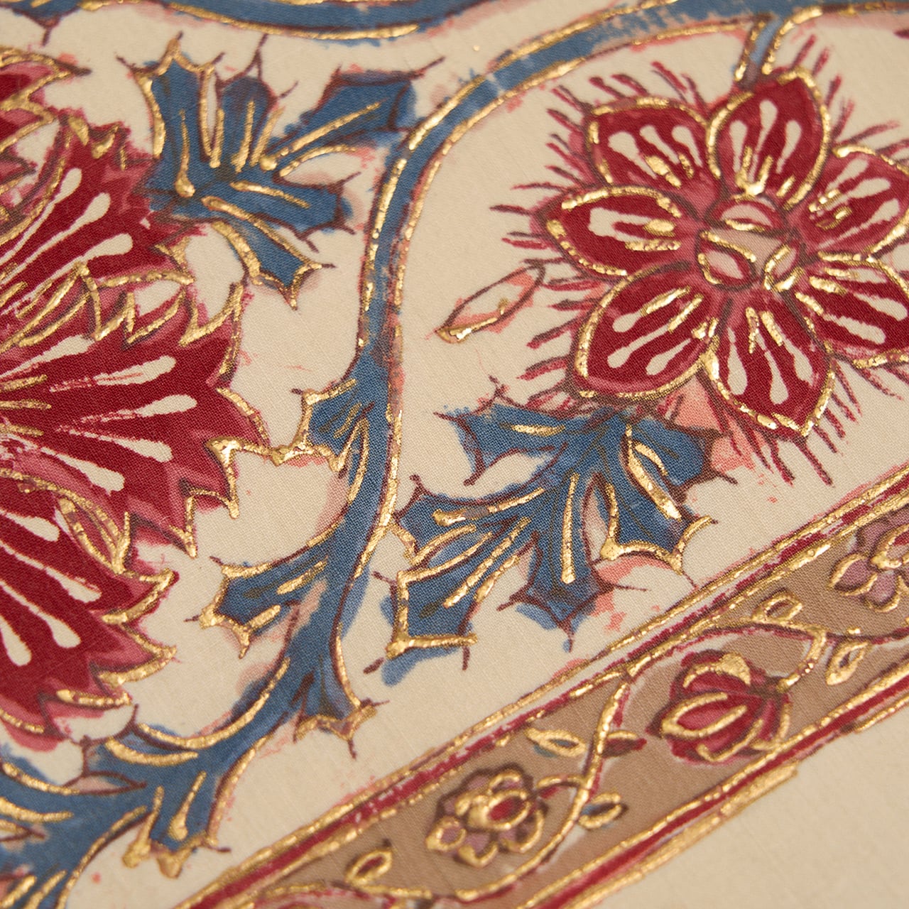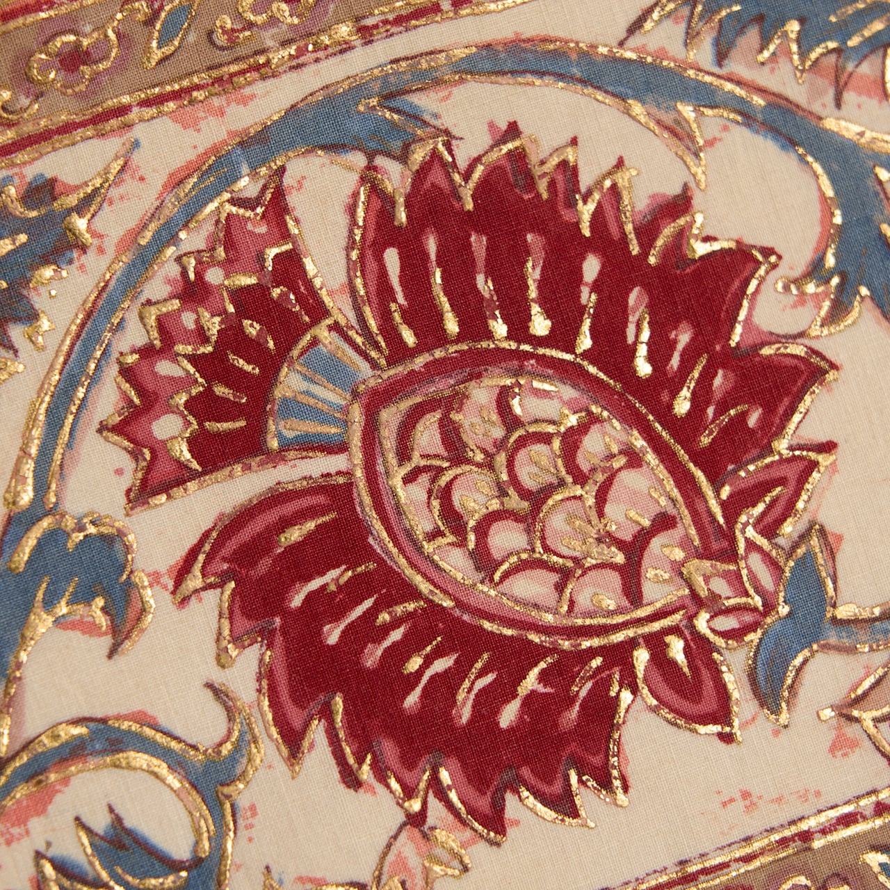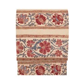 インドネシアのバティックのように、模様の周りを蝋で色止めして茜色のような赤・濃紅色を染めているようで、象牙色の部分にその色止めの蝋がひび割れたところが線のようににじんでいますが、それも手仕事の証のようで味わいがあります。(6、9枚目の写真をご参照ください。)