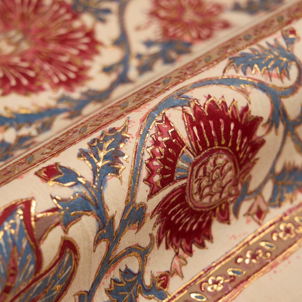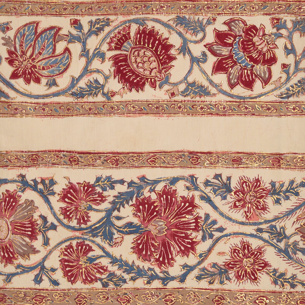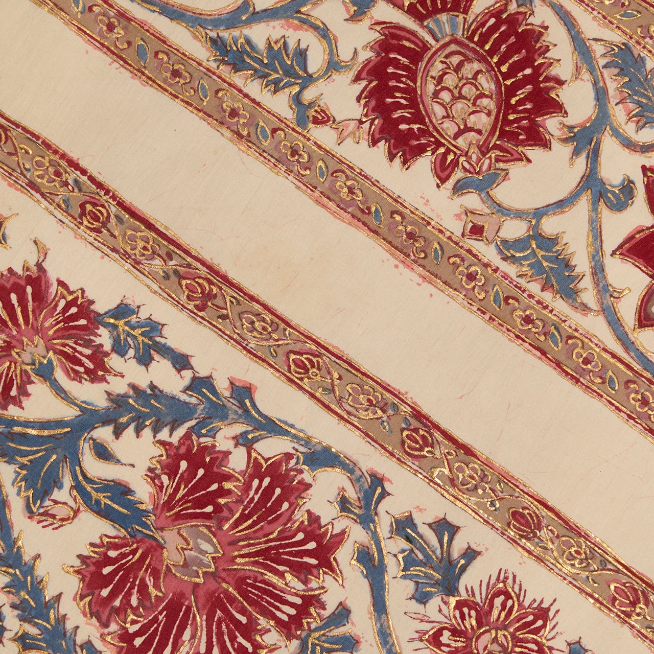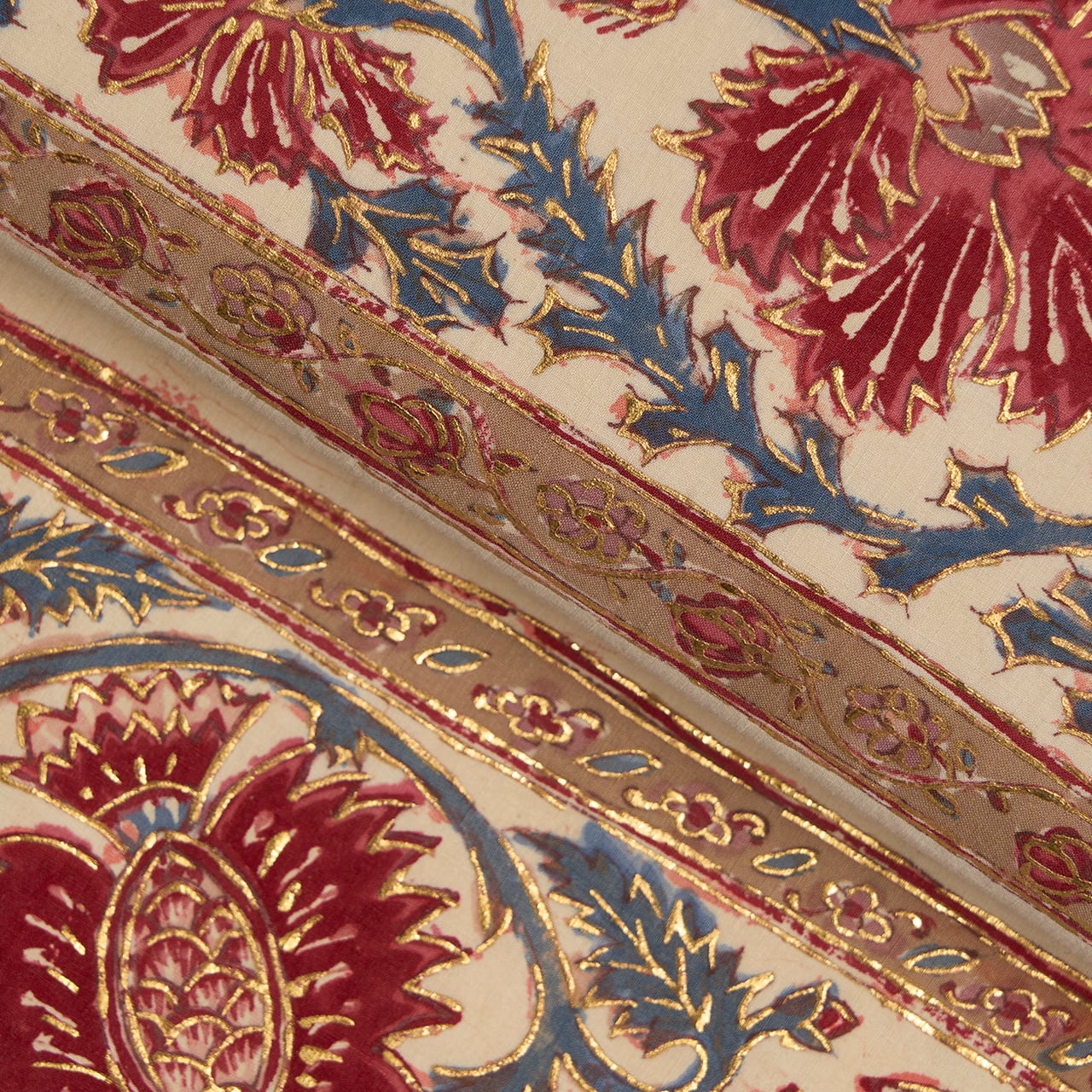 インドネシアのバティックのように、模様の周りを蝋で色止めして茜色のような赤・濃紅色を染めているようで、象牙色の部分にその色止めの蝋がひび割れたところが線のようににじんでいますが、それも手仕事の証のようで味わいがあります。(6、9枚目の写真をご参照ください。)
