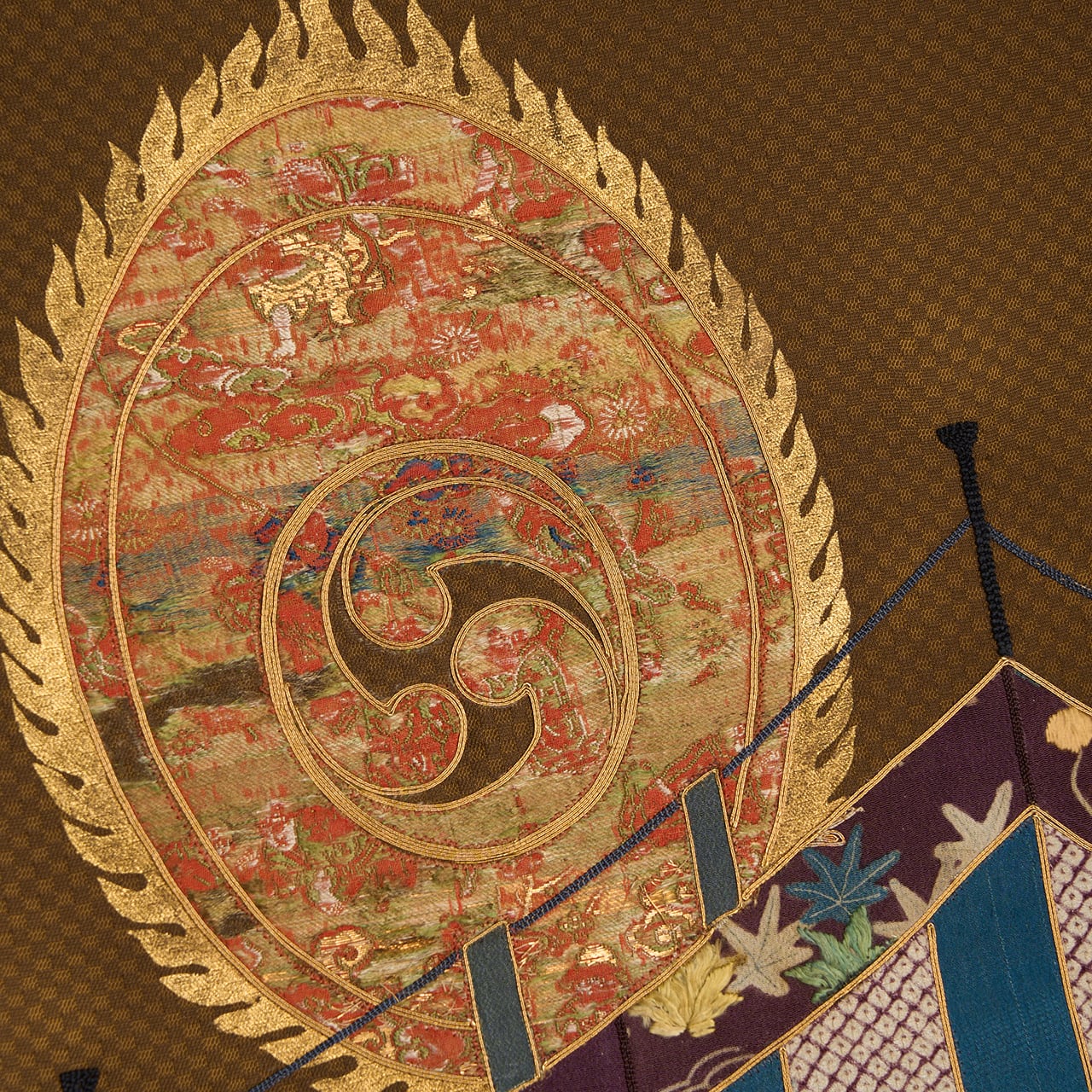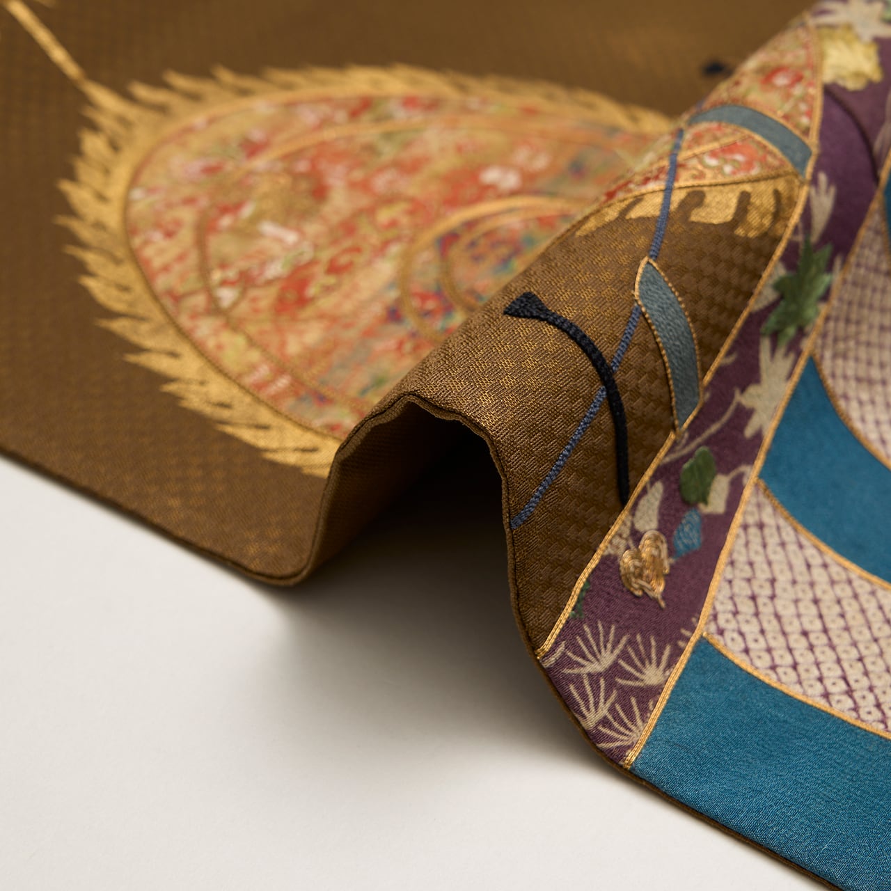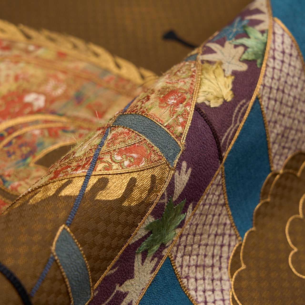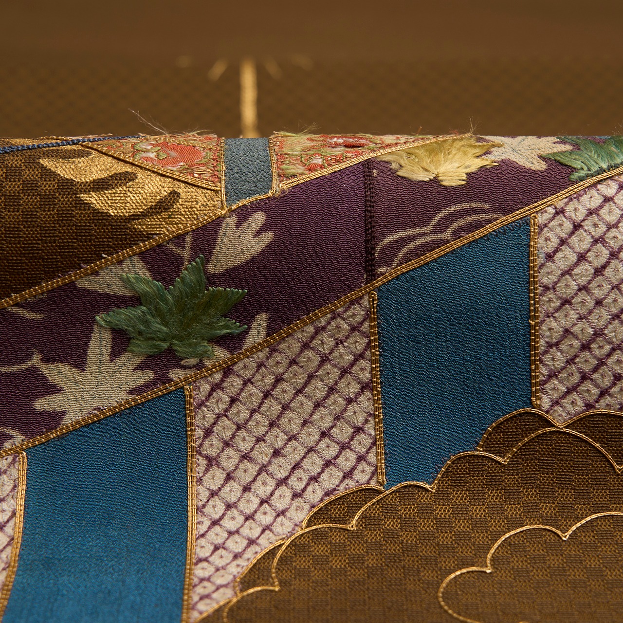 そういった雅楽に由来する模様を、時代裂を使用して細やかな手刺繍も加えて表現されていて、とこか格調高さも感じられるものとなっています。