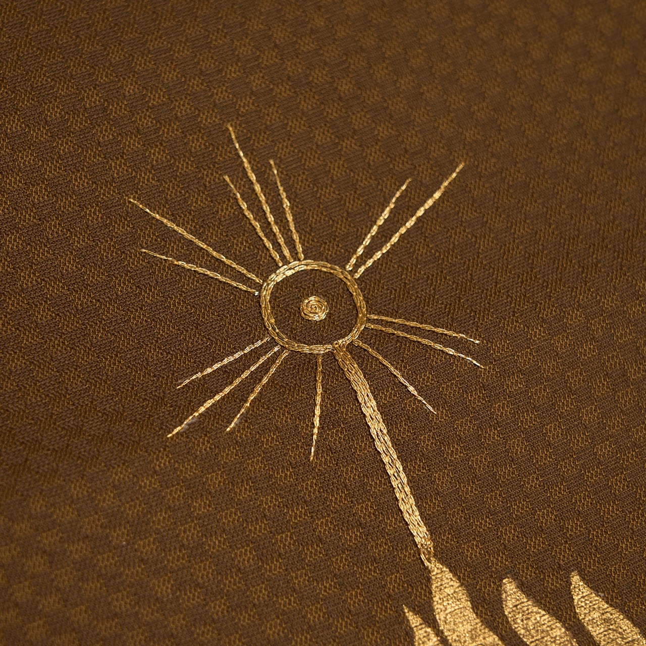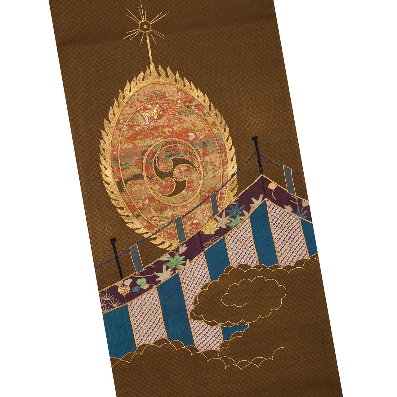 とても細かい市松模様が織り込まれた焦げ茶・煤竹色の帯地に、お太鼓には大きく火焔太鼓の模様が表されていますが、江戸時代の金襴緞子の生地が縫い付けられて金駒糸の刺繍で縁取られ、火焔は金彩で染められています。