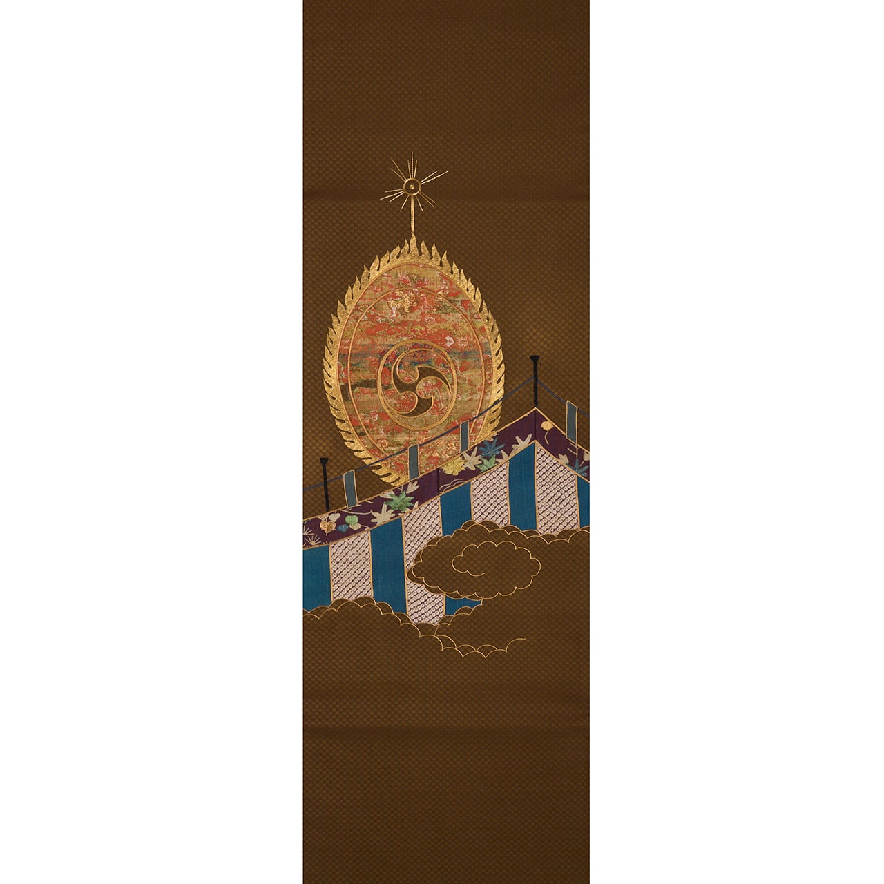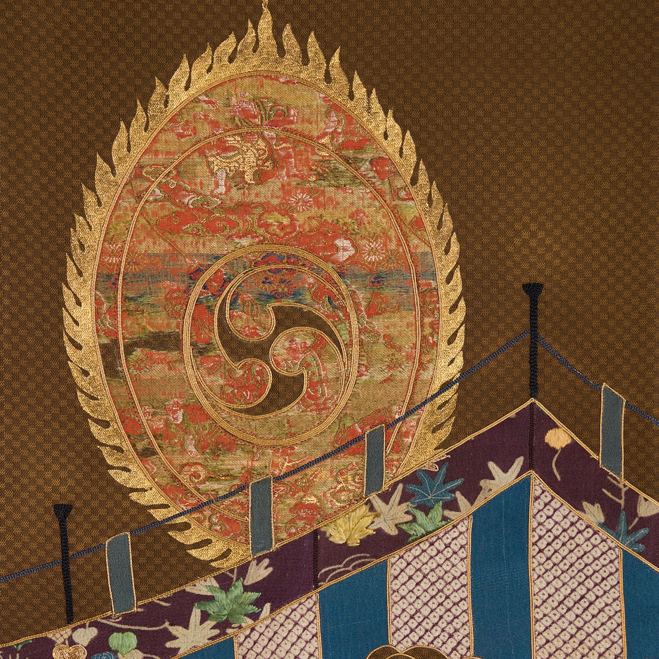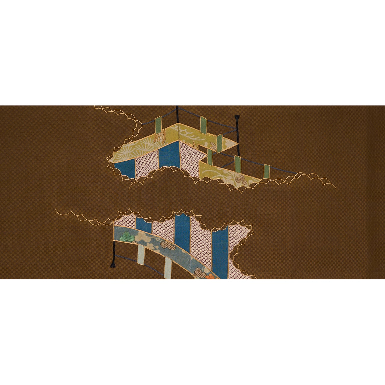 その手前には幔幕が置かれ、それもやはり江戸時代の友禅の生地と絞りの生地でアップリケされ、周りなどは金糸で縁取りされ、さらにその手前には雲取りの模様が金糸の刺繍で表された、古色然としたとても良い雰囲気の袋帯です。