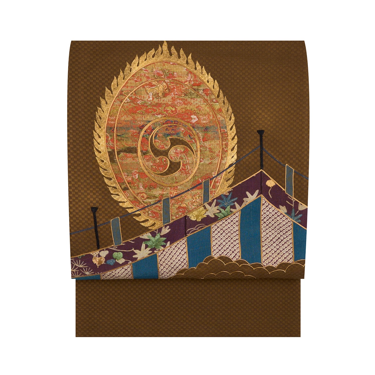 幔幕に火焔太鼓の模様 時代裂使用袋帯【未着用品】