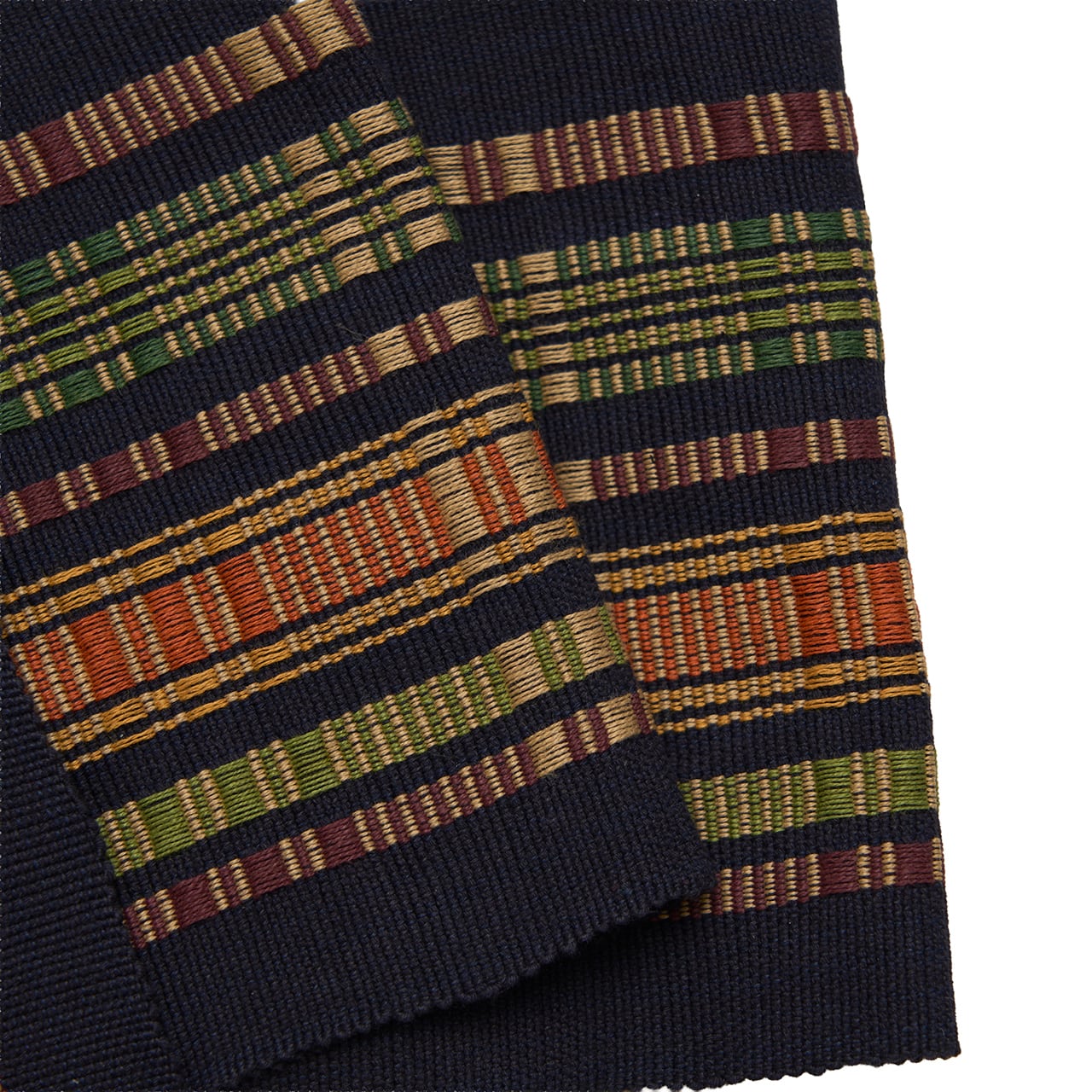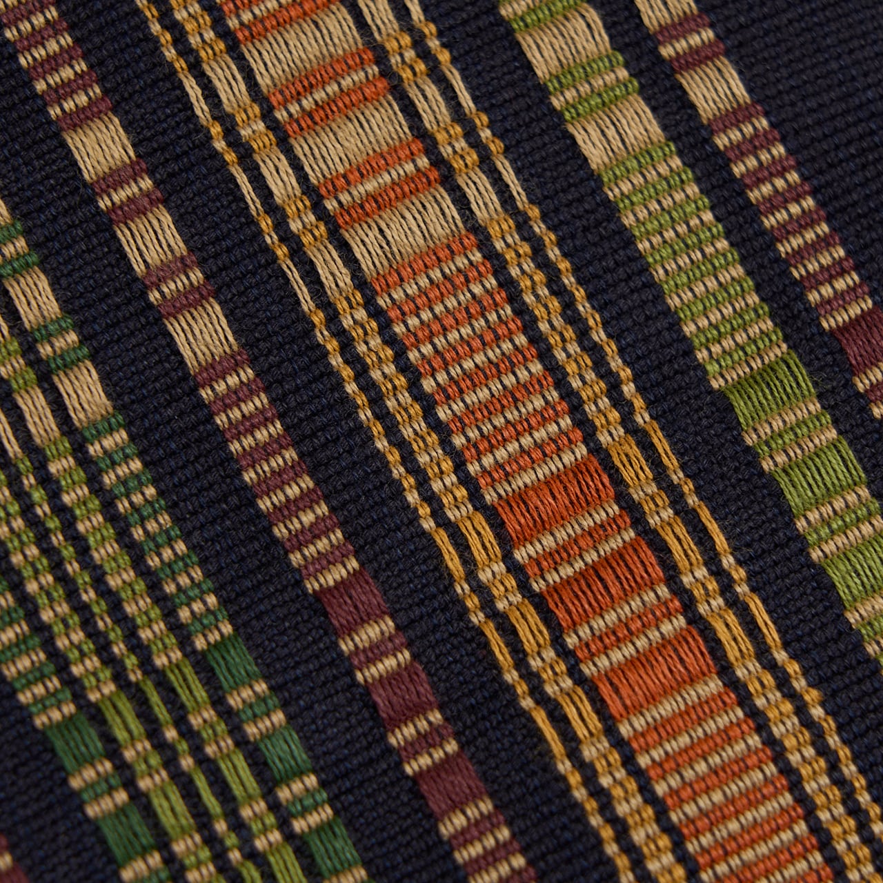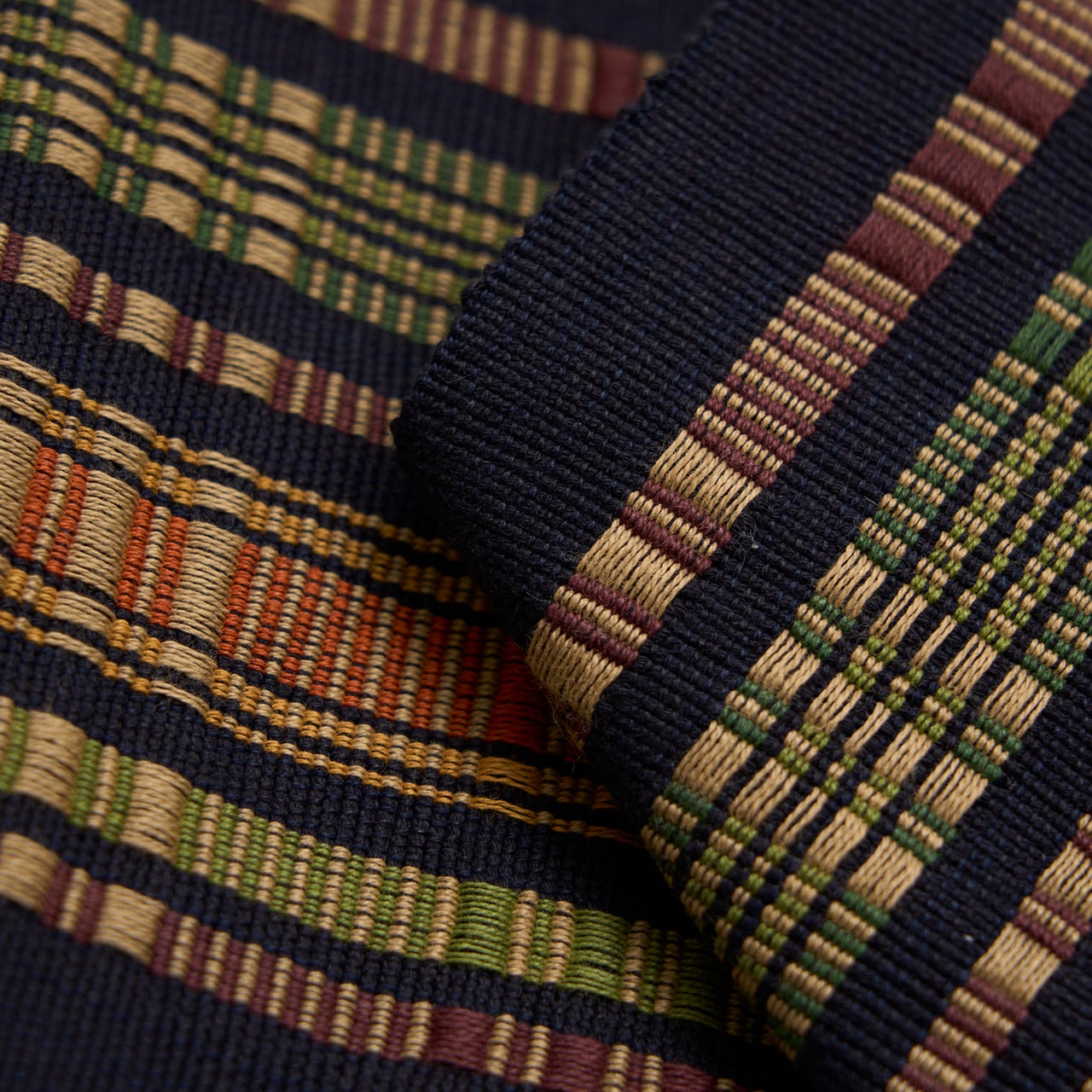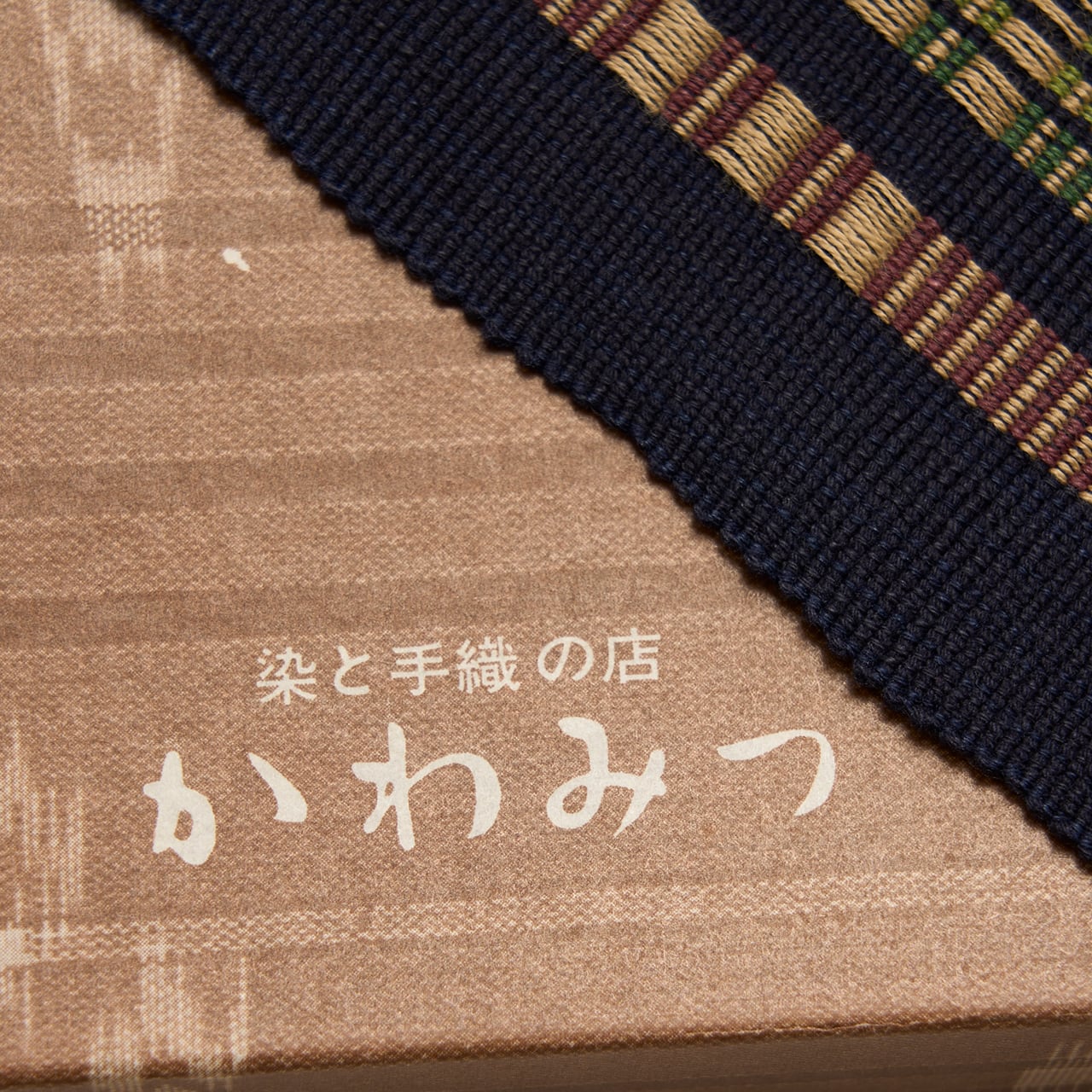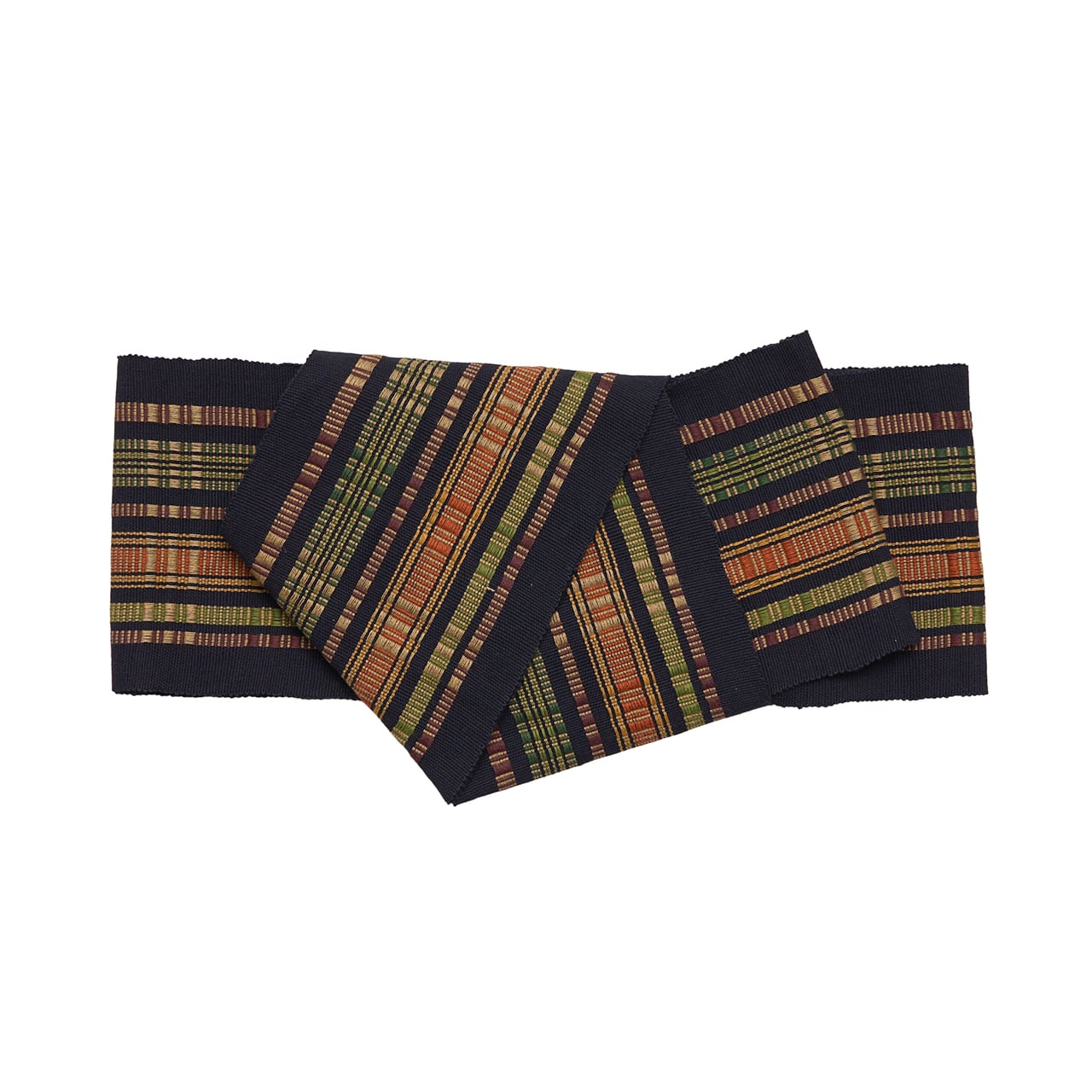 とても濃い藍・鉄紺色の木綿の生地に、葡萄鼠色のくすんだ紫、草色、浅緋色のオレンジ色、木賊色の少し濃い緑、白茶色のベージュなどの5色の糸を使ってロートン織が織り出された、工芸的な味わいのあるお洒落な半幅帯です。