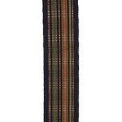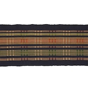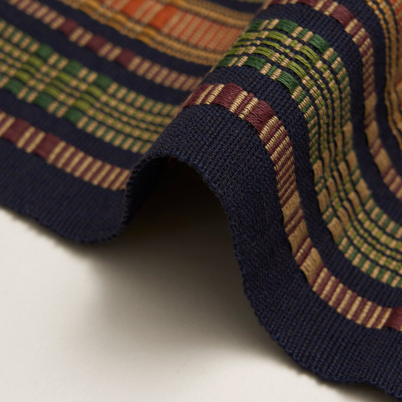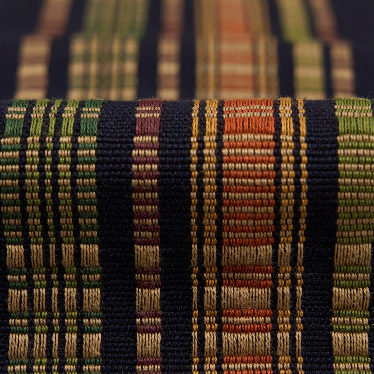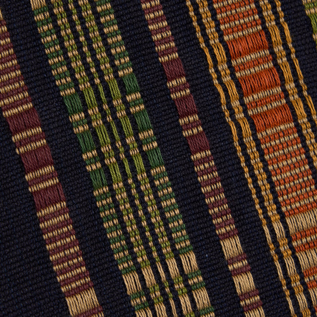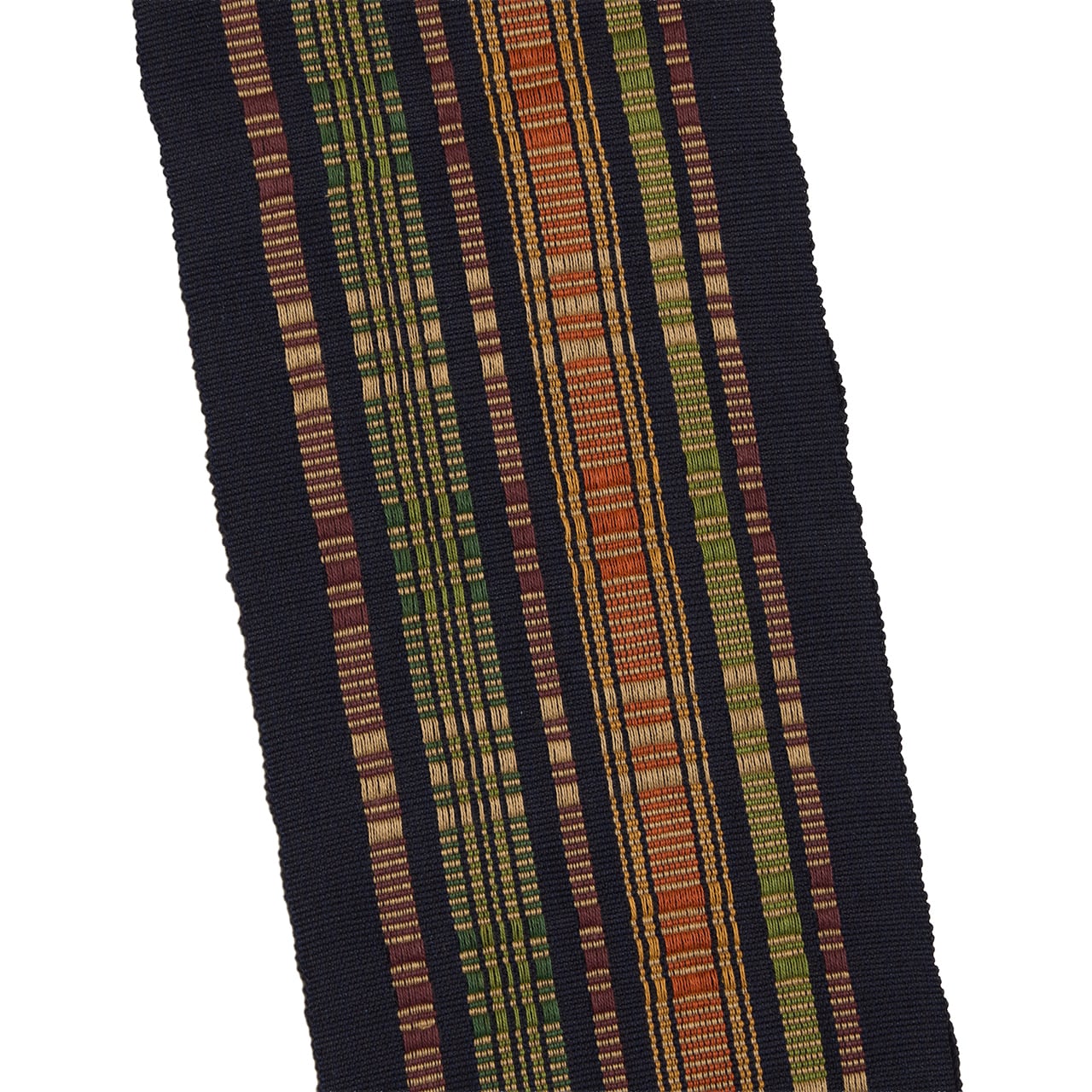 とても濃い藍・鉄紺色の木綿の生地に、葡萄鼠色のくすんだ紫、草色、浅緋色のオレンジ色、木賊色の少し濃い緑、白茶色のベージュなどの5色の糸を使ってロートン織が織り出された、工芸的な味わいのあるお洒落な半幅帯です。