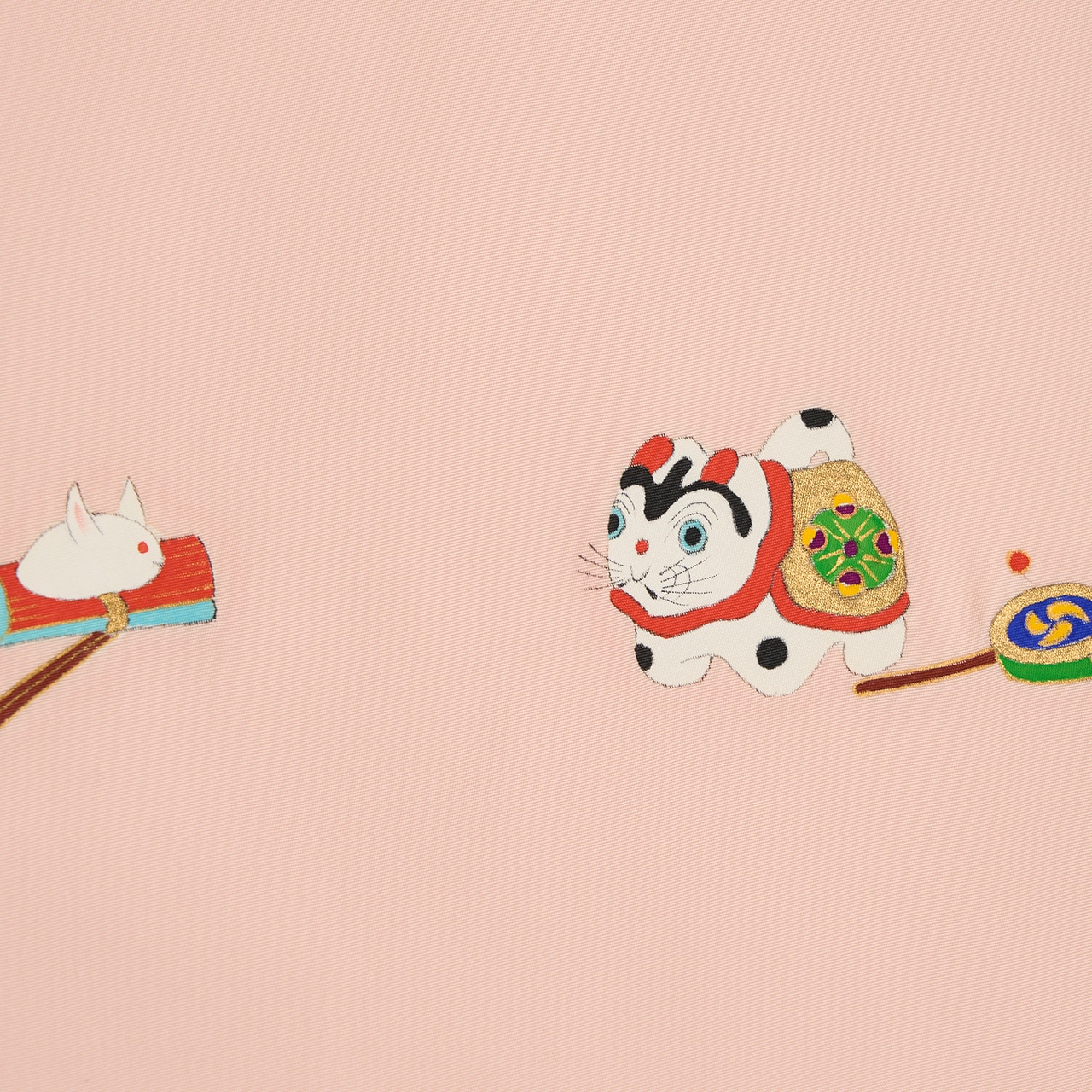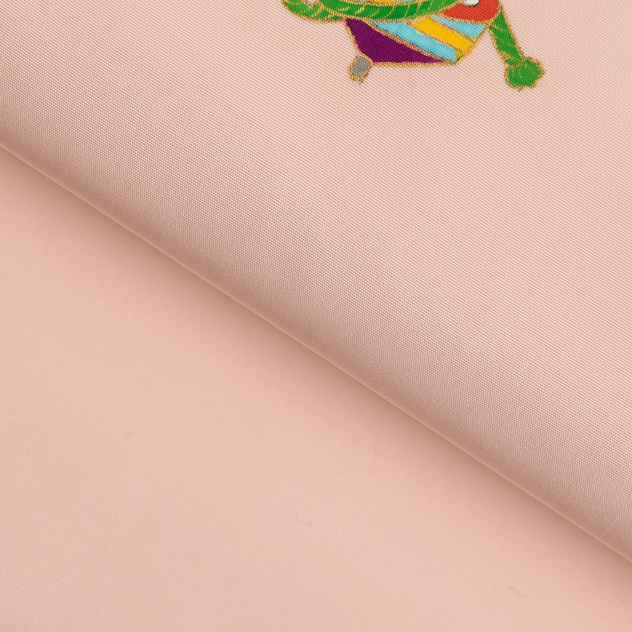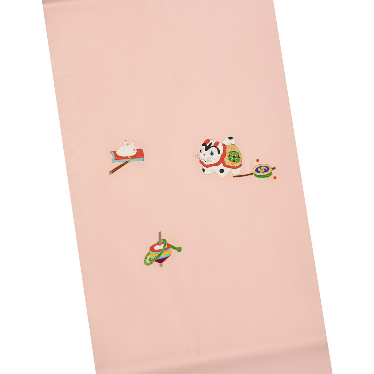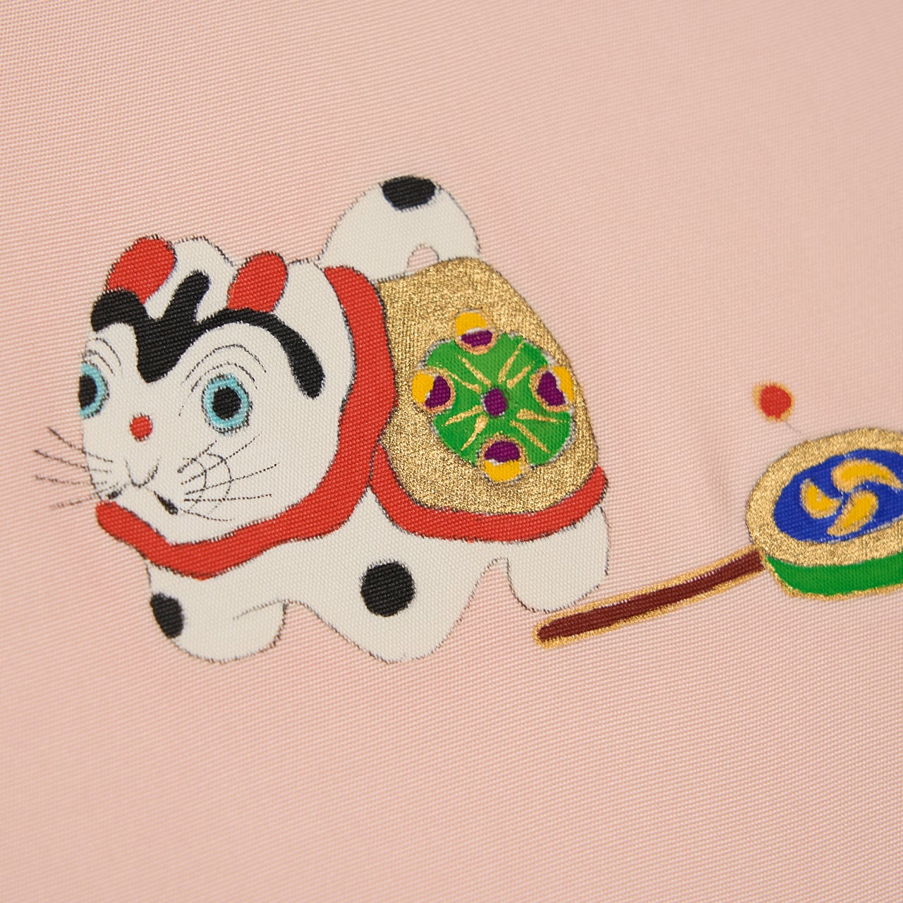 淡いピンク・虹色のしっかりとした塩瀬の生地に、お太鼓にはうさぎや犬張子にデンデン太鼓、独楽などの玩具が並べられた様子が手描きの友禅で描かれた、とても和やかな雰囲気の九寸名古屋帯です。